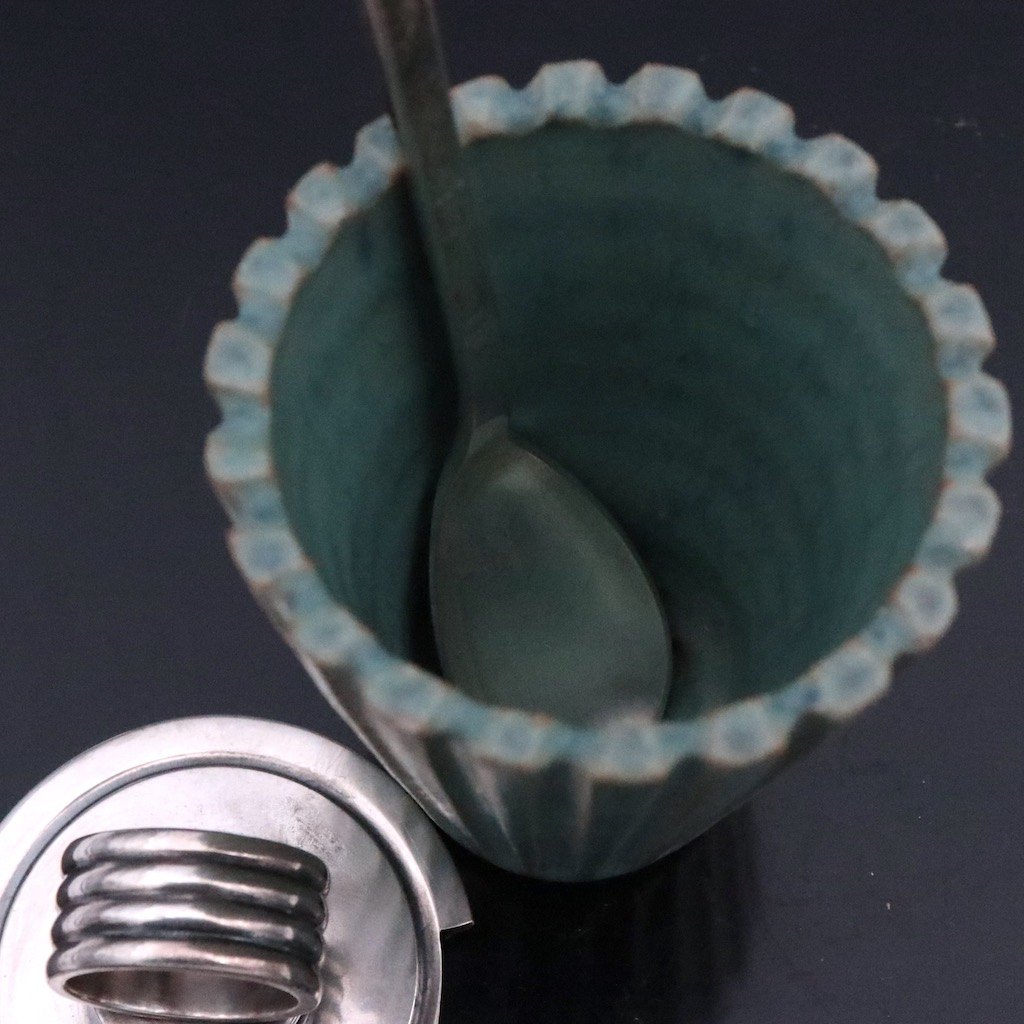 Arne Bang - F. Hingelberg. Krukke i stentøj med låg og ske i sterling sølv.