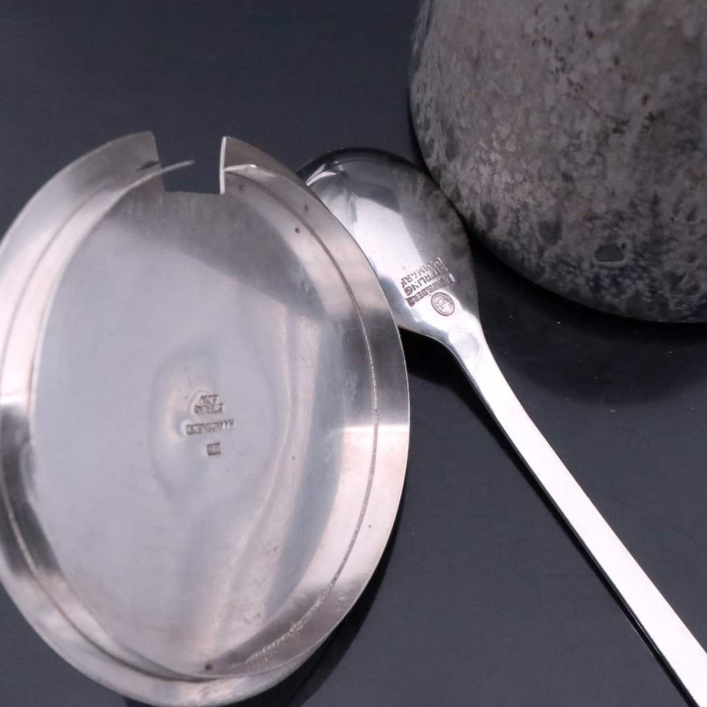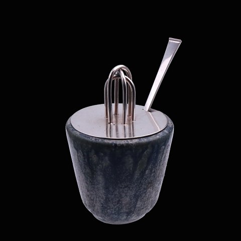 Arne Bang - O.M.V. Ehlers. Krukke i stentøj med låg og ske i sterling sølv.