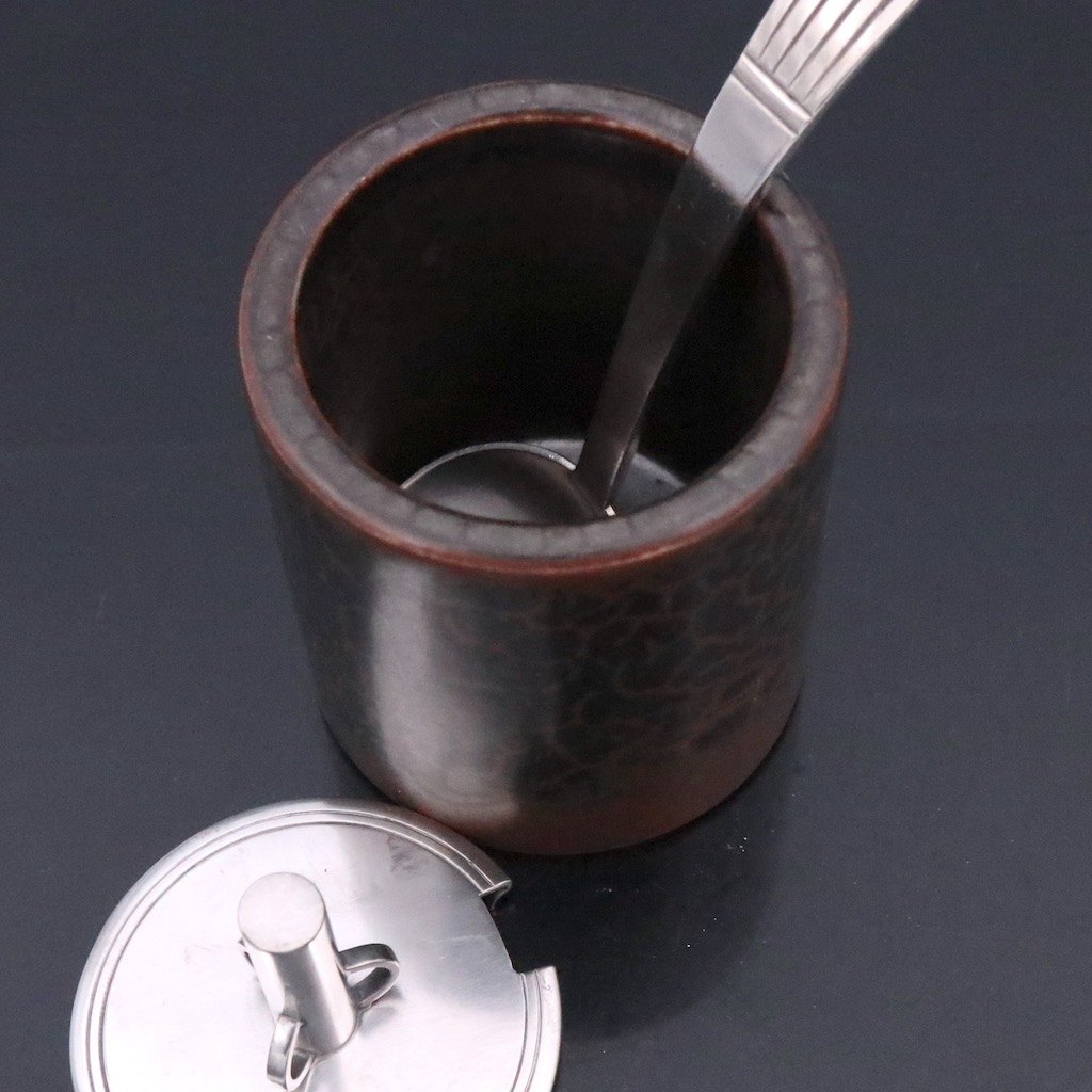 Saxbo - F. Hingelberg. Krukke i stentøj med låg og ske i sterling sølv.