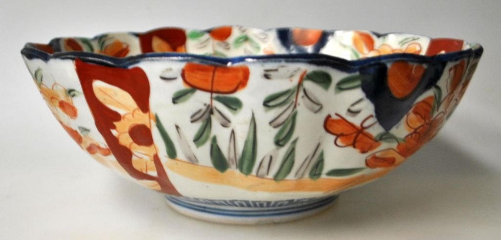 Imari bowl in porcelain, 19th century Japan. Polychrome decorated. Ruffled edge. Unstamped. H.: 10.5 cm. Dia.: 24.5 cm.