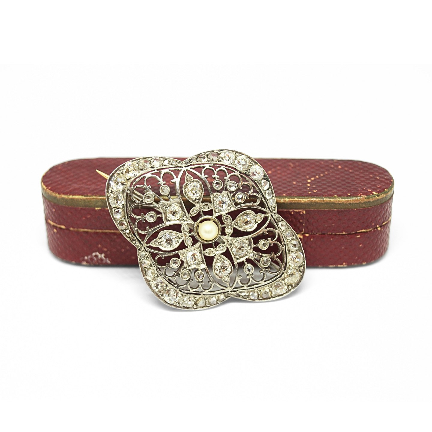 Broche i belle époque stil, i hvidguld prydet med diamanter og perle i midten. Fra omkring 1900.