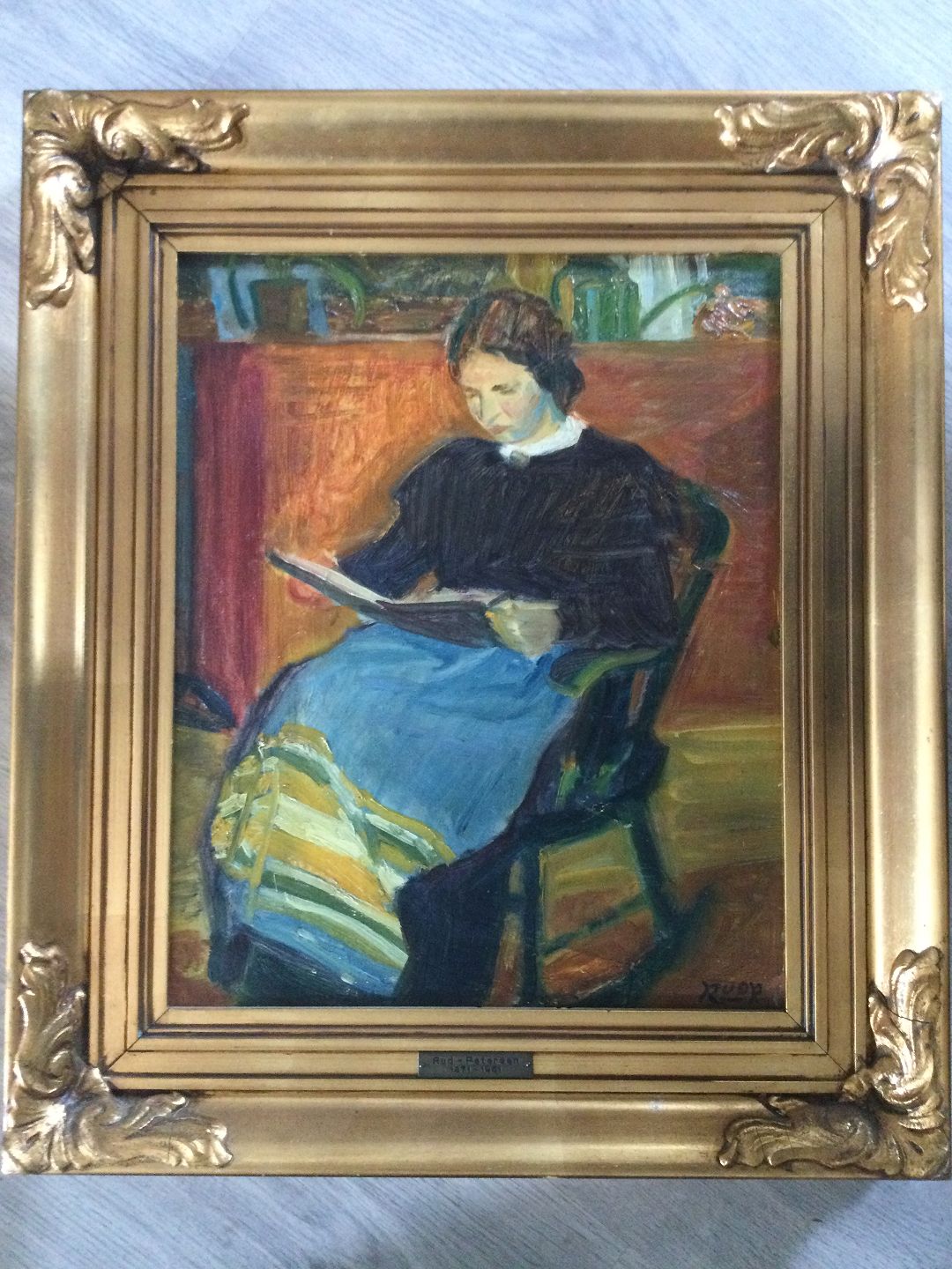Maleri af Rud-Petersen - Læsende kvinde i gyngestol.