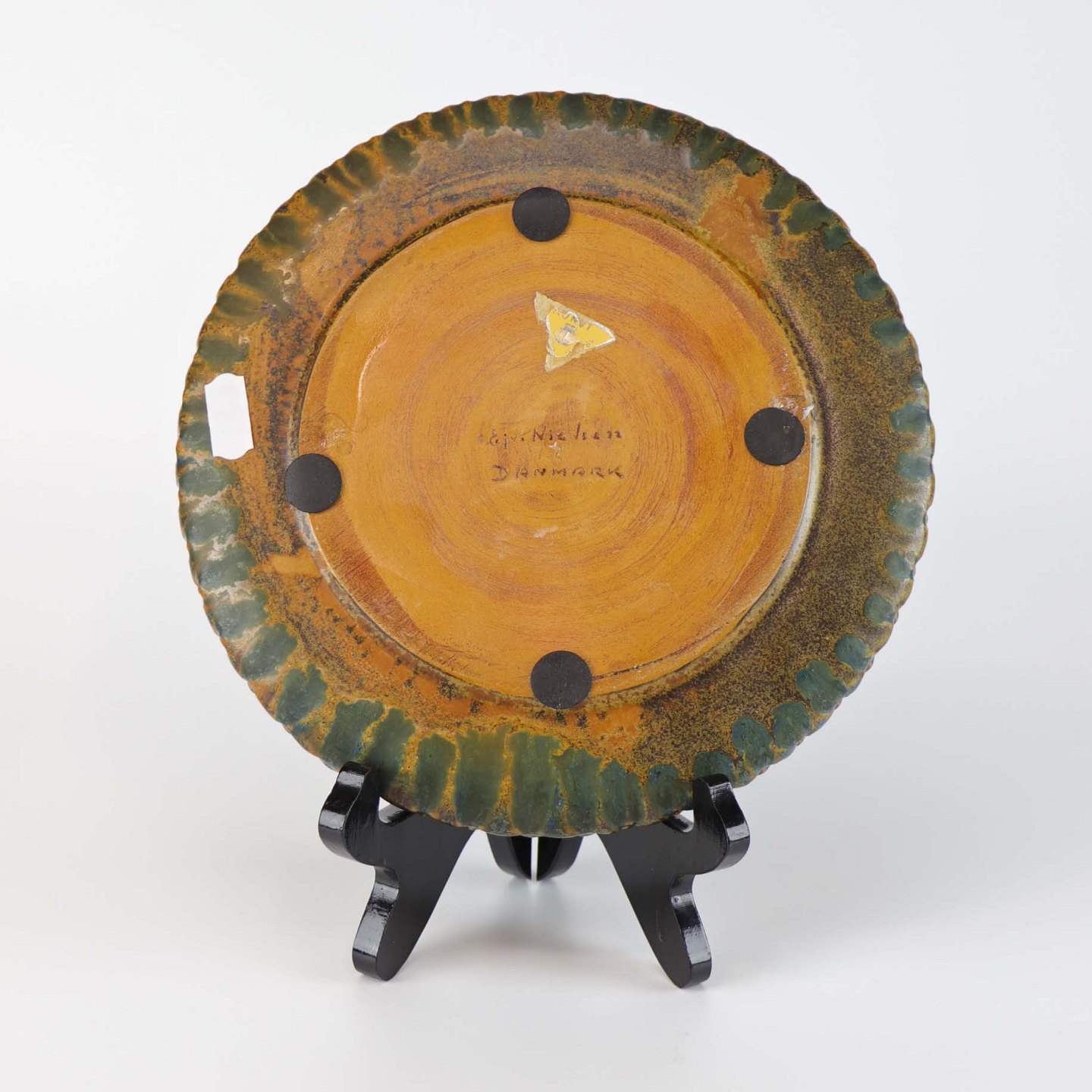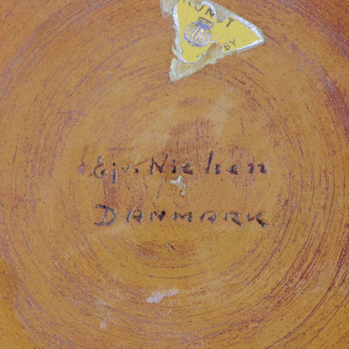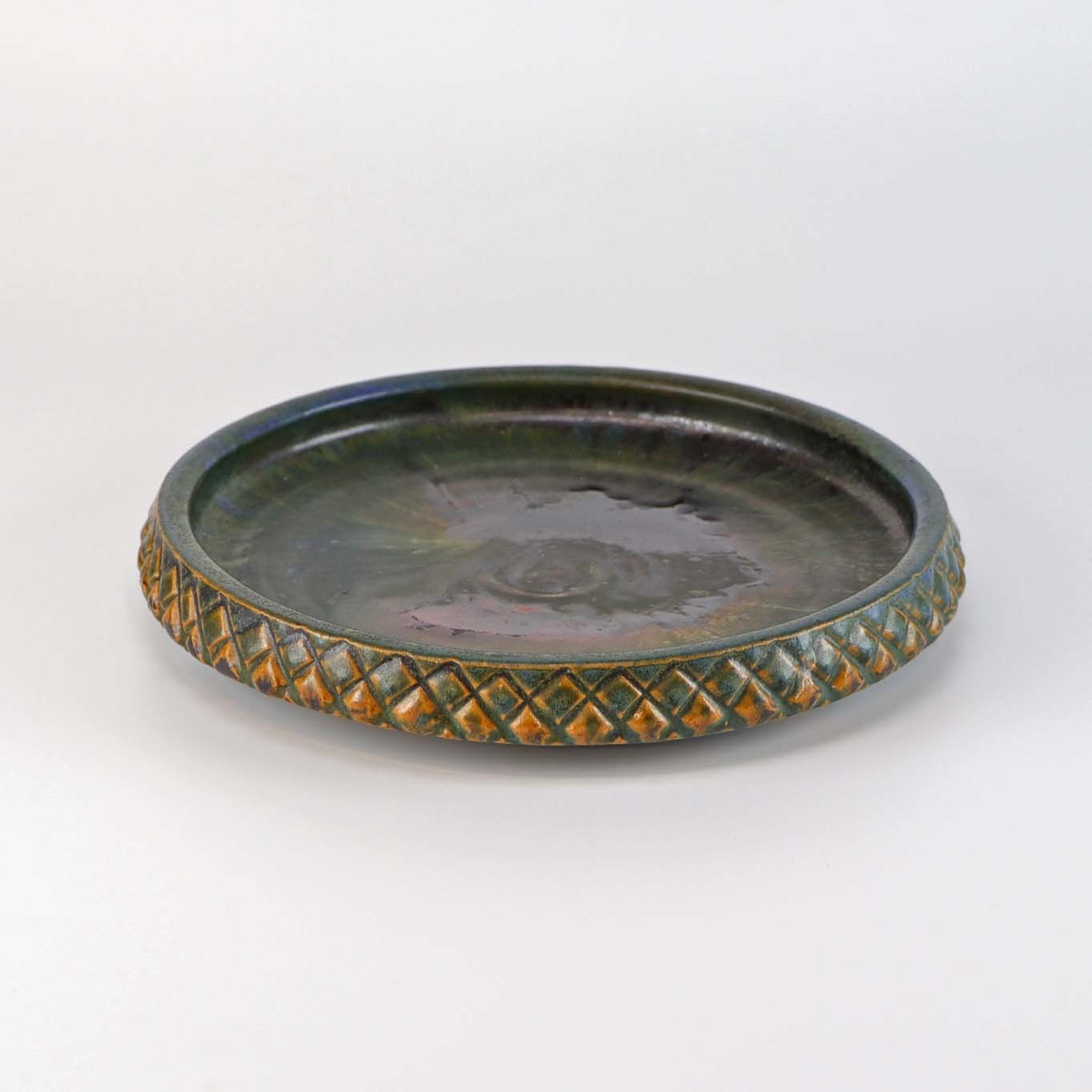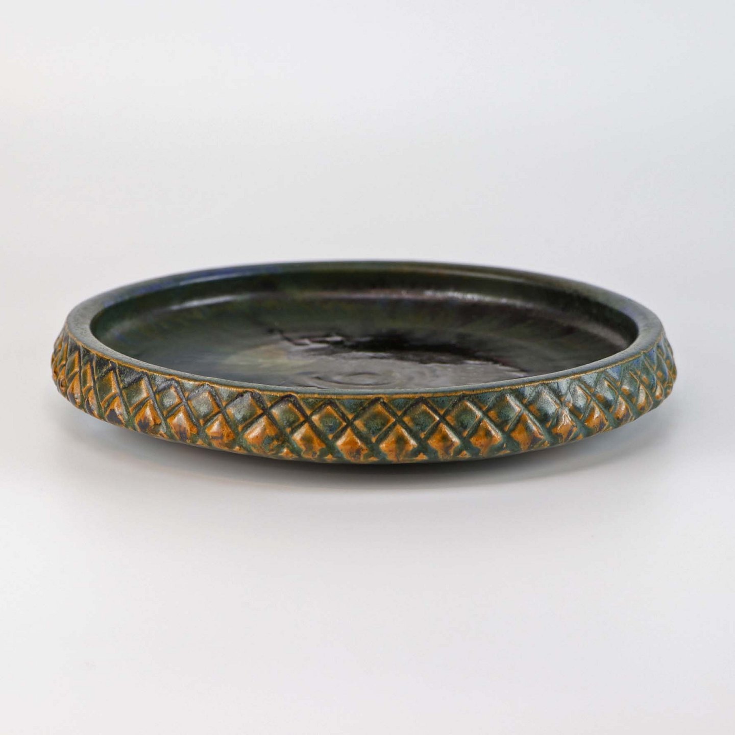Fad af stentøj blågrønne farver med rødbrune nuancer
