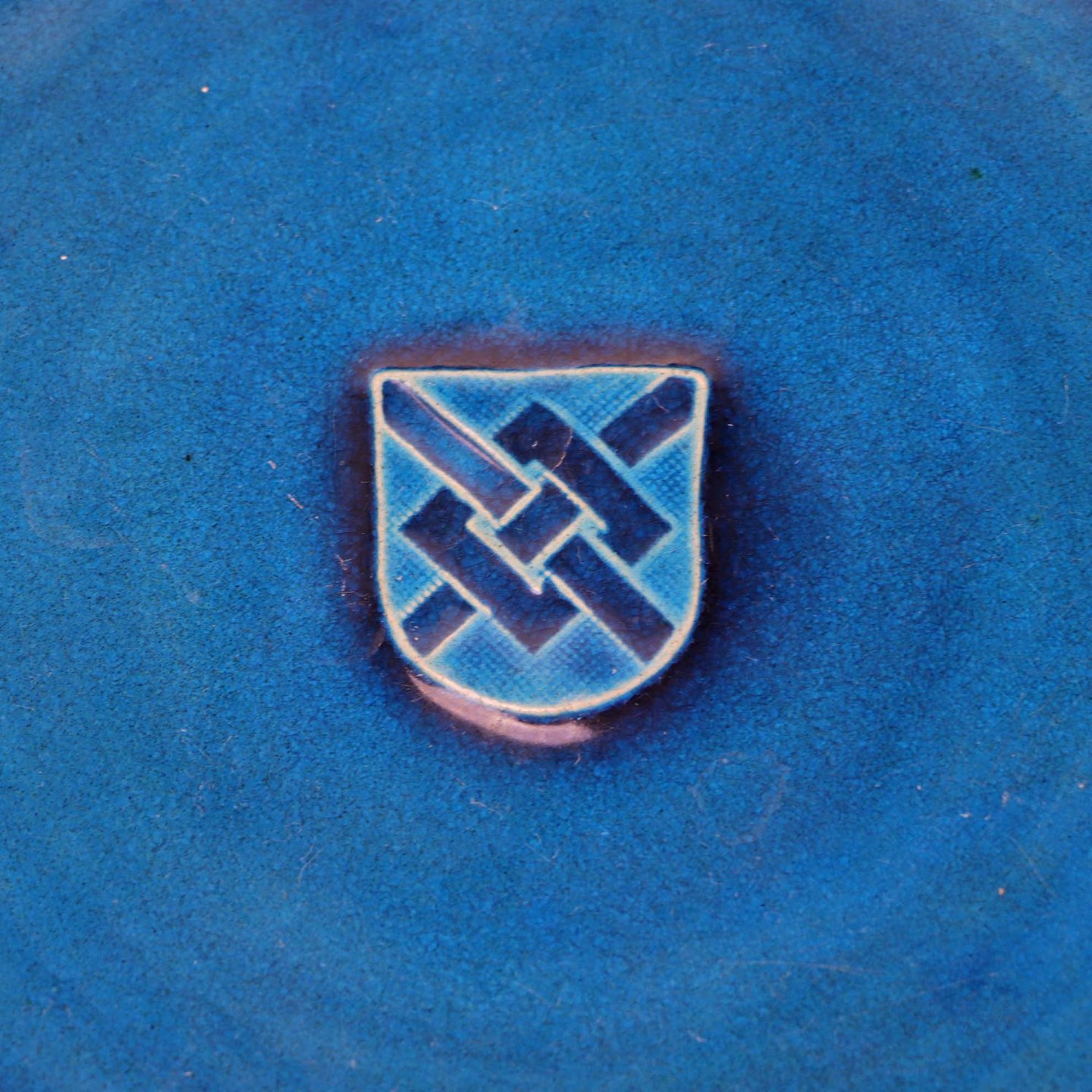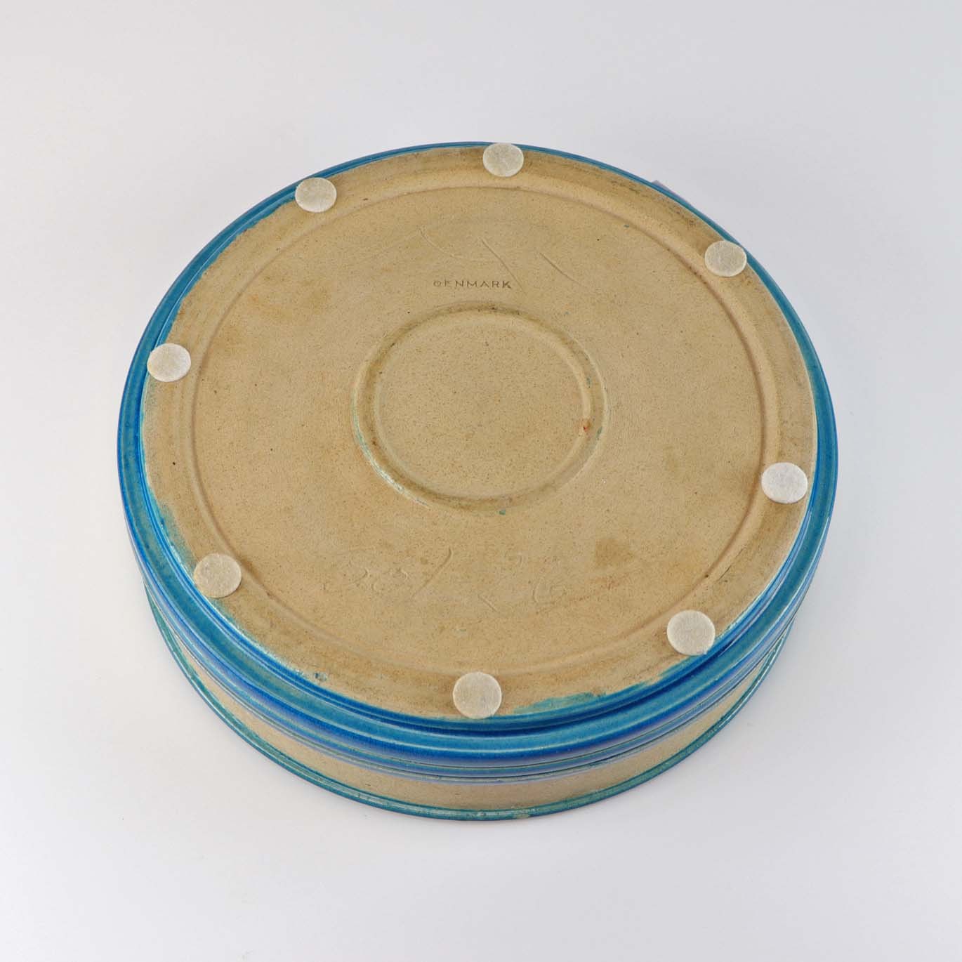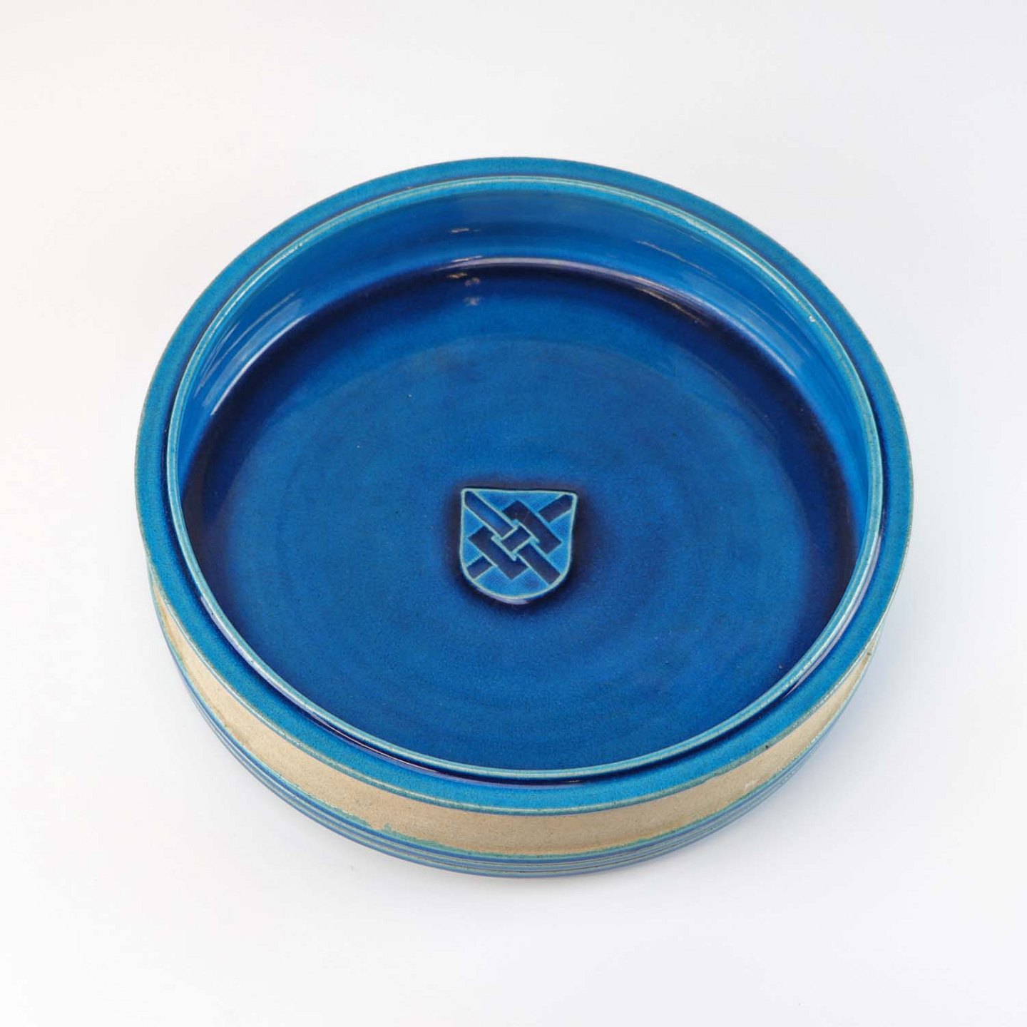 Rundt fad af keramik i hvid med blå glasur. I bunden er afbilledet Greve kommunes våbenskjold