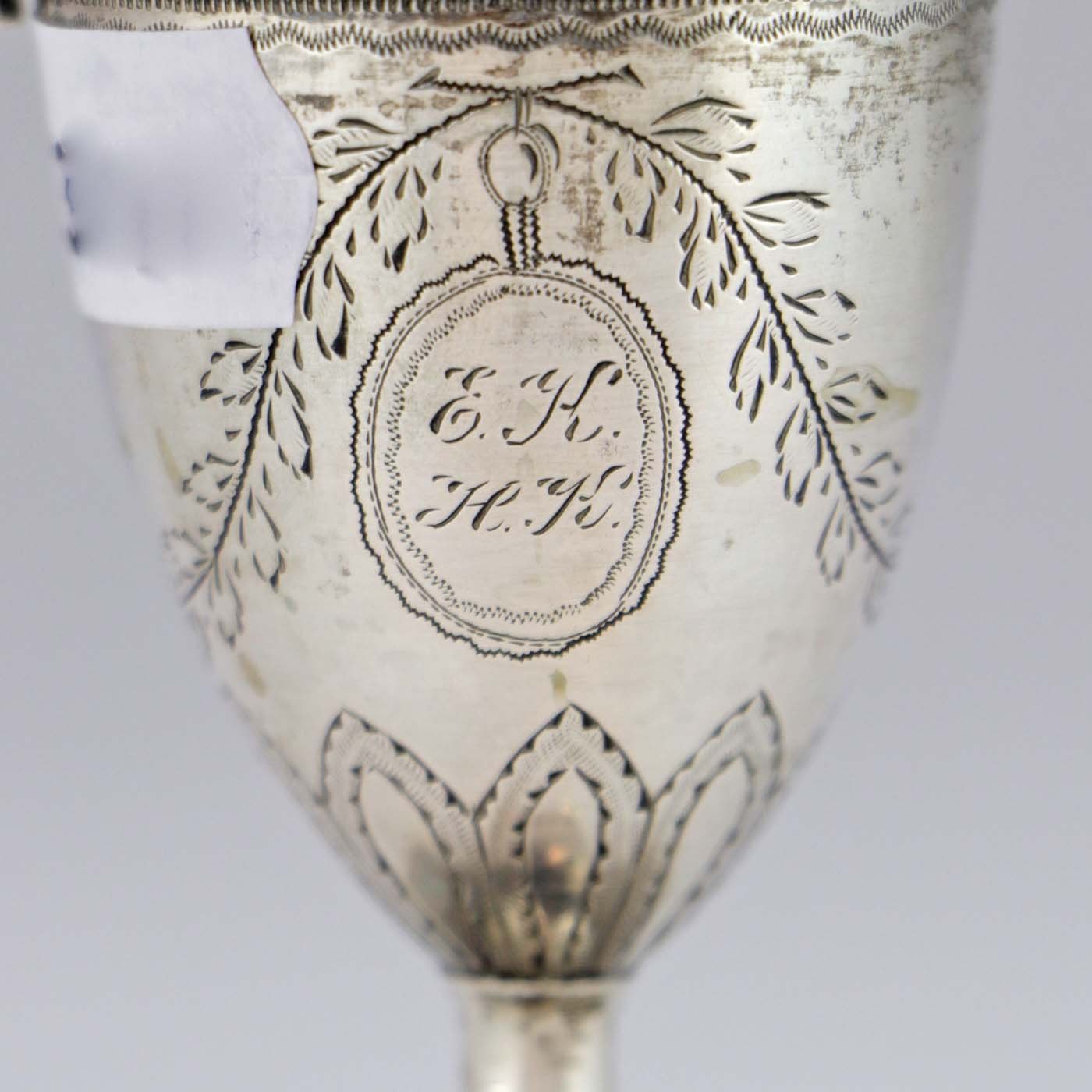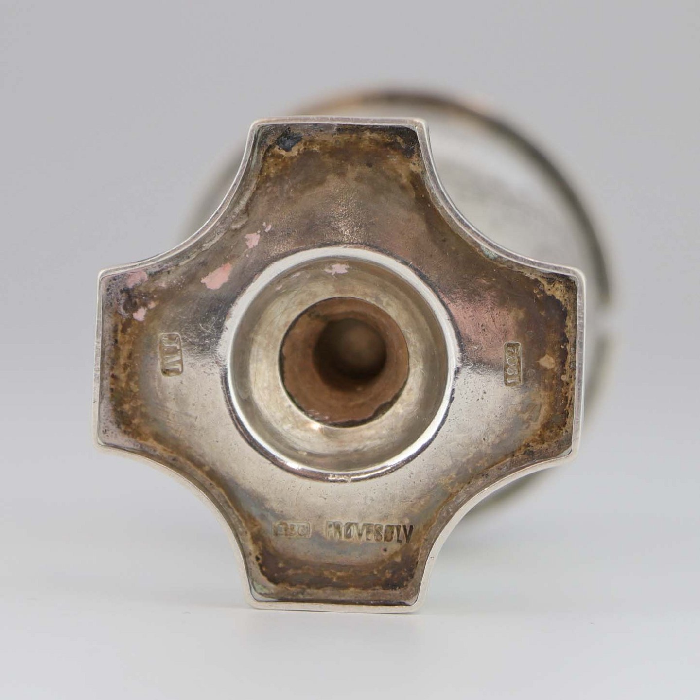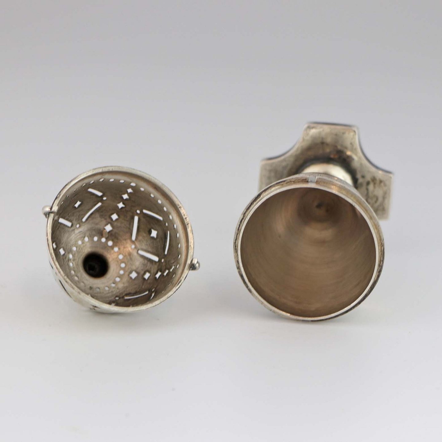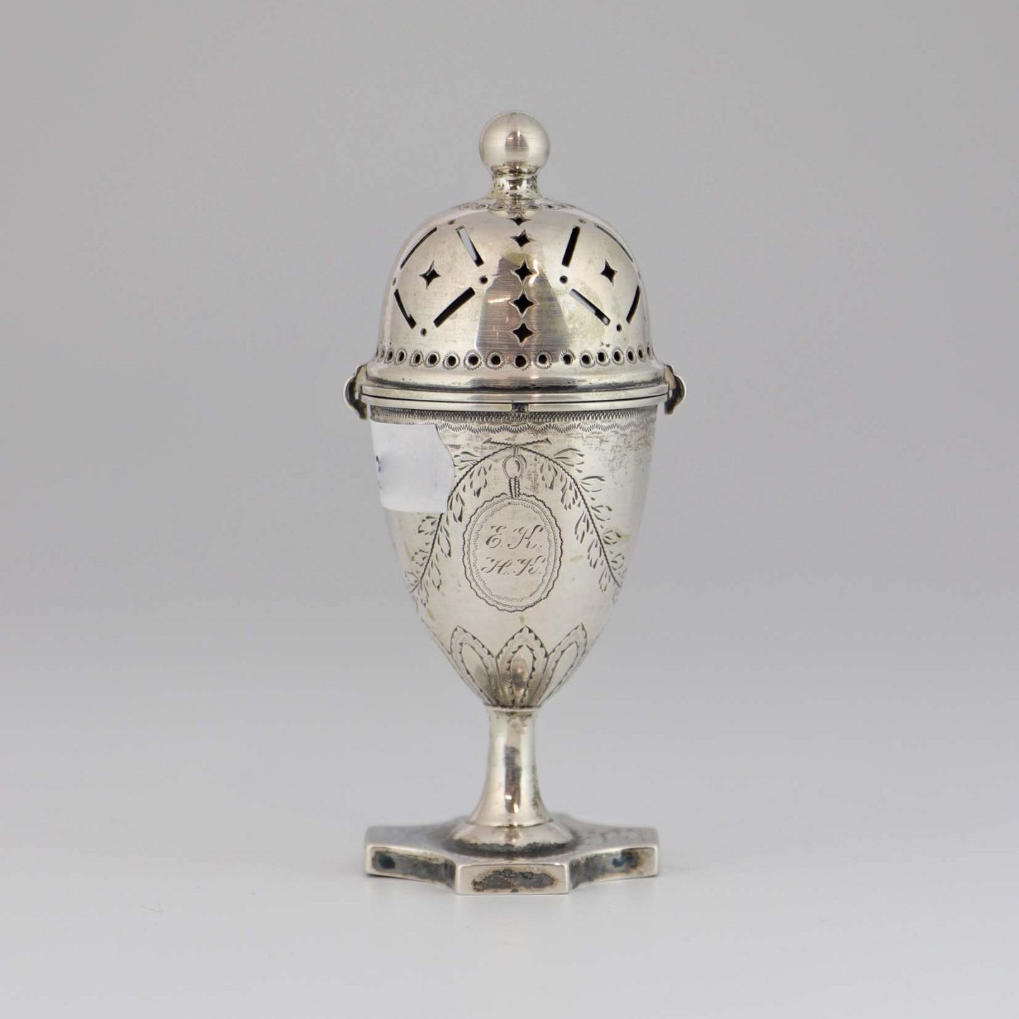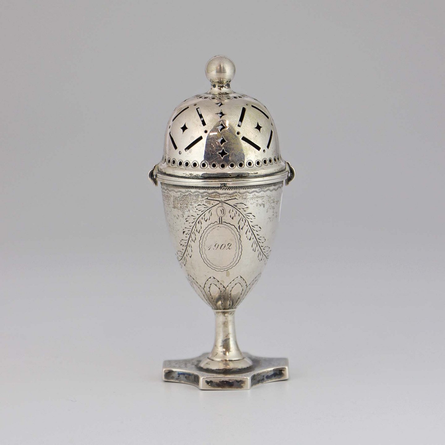 Strøbøsse af prøvesølv. Dekoreret med indgraveret initialer og år 1902