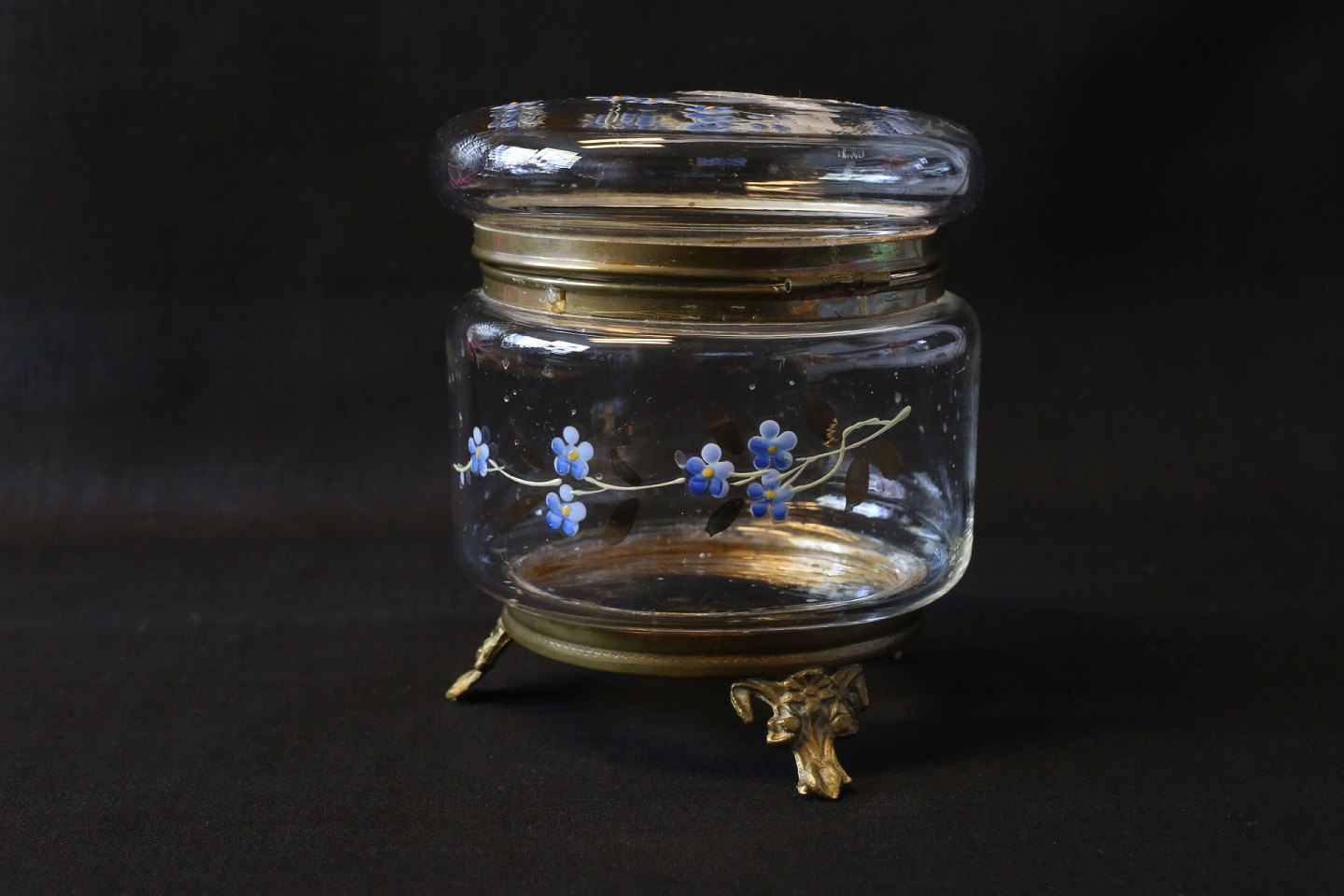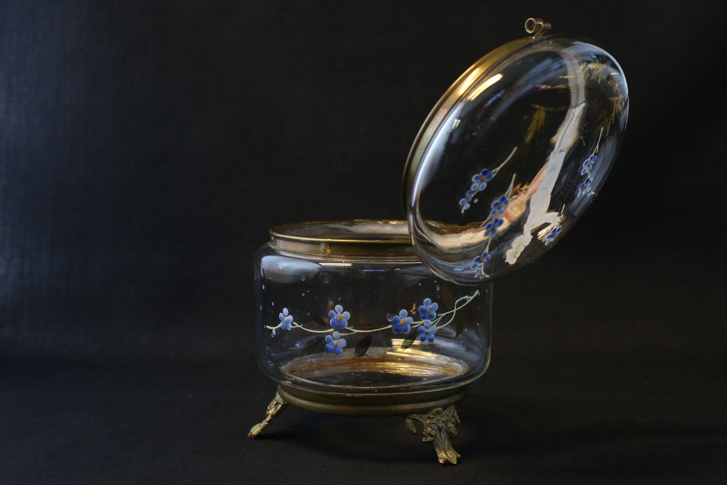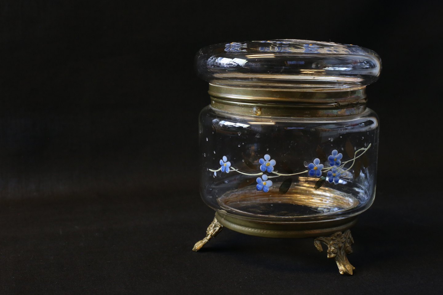 Bonbonniere i glas, med flot blomstret mønster. Perfekt til opbevaring.