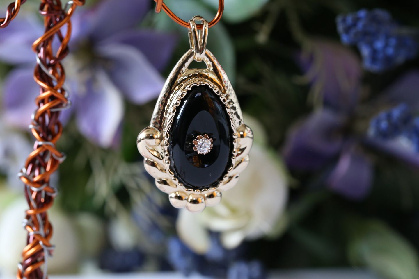 Smukt vedhæng i 14 karat guld, med brilliant og sort onyx. På forsiden af vedhænget er en flot brilliant, indlagt i en smuk fatning. På bagsiden kan rammen tages af, så der kan indsættes et lille billede. Med andre ord, et klassisk eksklusivt antikt smykke der vil passe perfekt i en guldkæde om halsen.