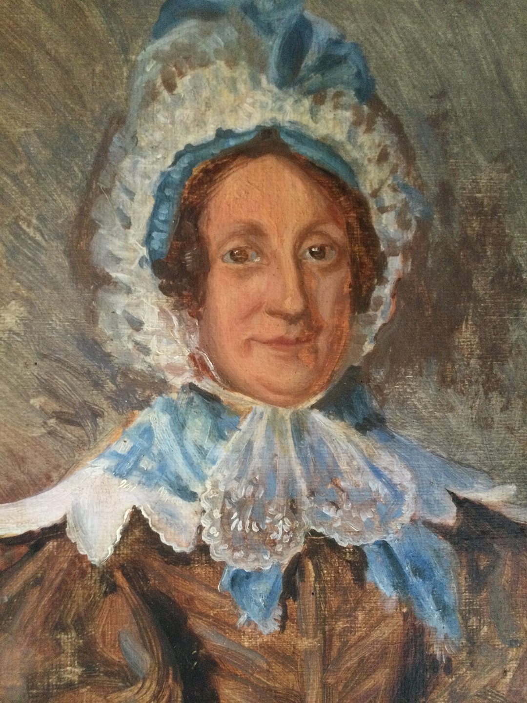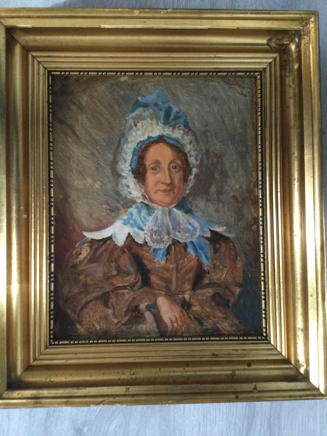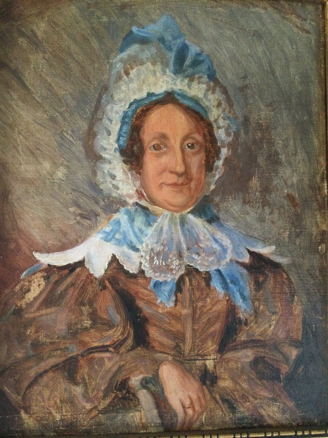 Maleri - Portræt af kvinde i brun silkekjole og med kyse.
