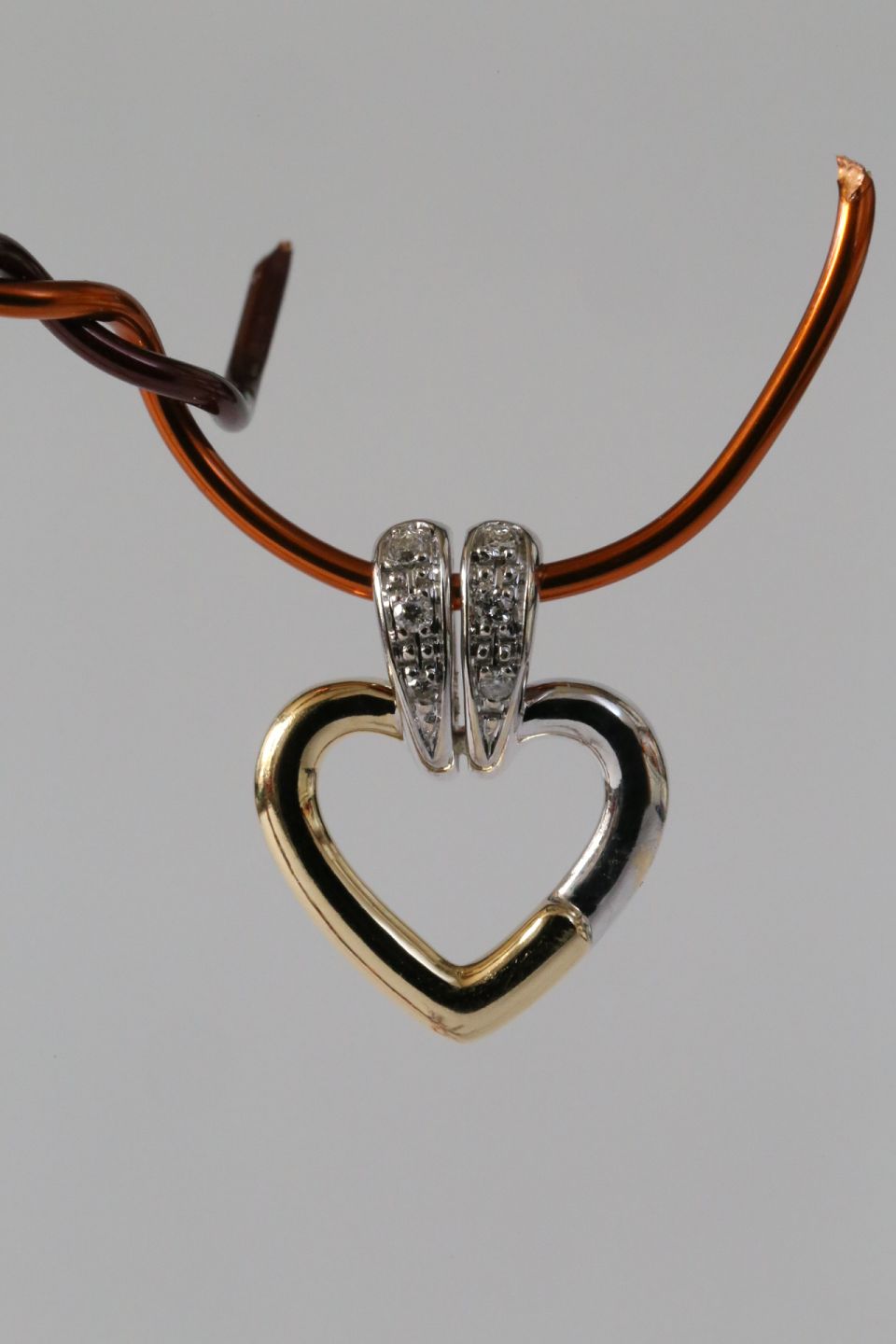 Et meget romantisk og smukt hjerteformet vedhæng, hvor selve hjerteformen udgøres af en linje i hvid- og rødguld. Dette gør vedhænget meget dynamisk. Øsken til kæde har indlagte brillanter, hvilket giver en flot og levende effekt. Et meget smukt vedhæng, til kvinder i alle aldre.
