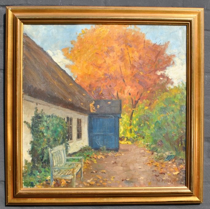 Mau, Valdemar Erhardt Johan (1892 - 1952) Danmark: Et hus - efterår. Olie på lærred. Signeret. 51 x 51 cm.