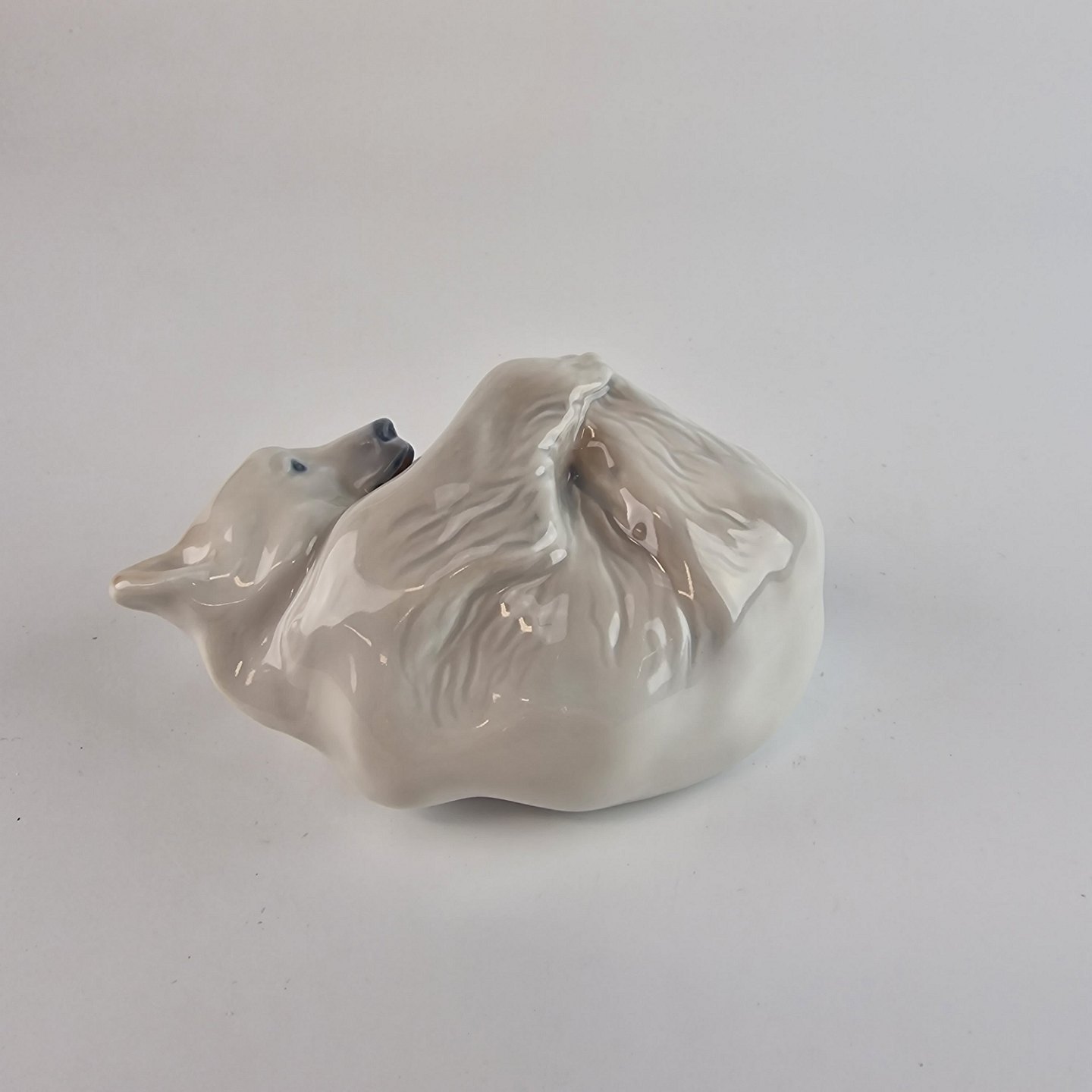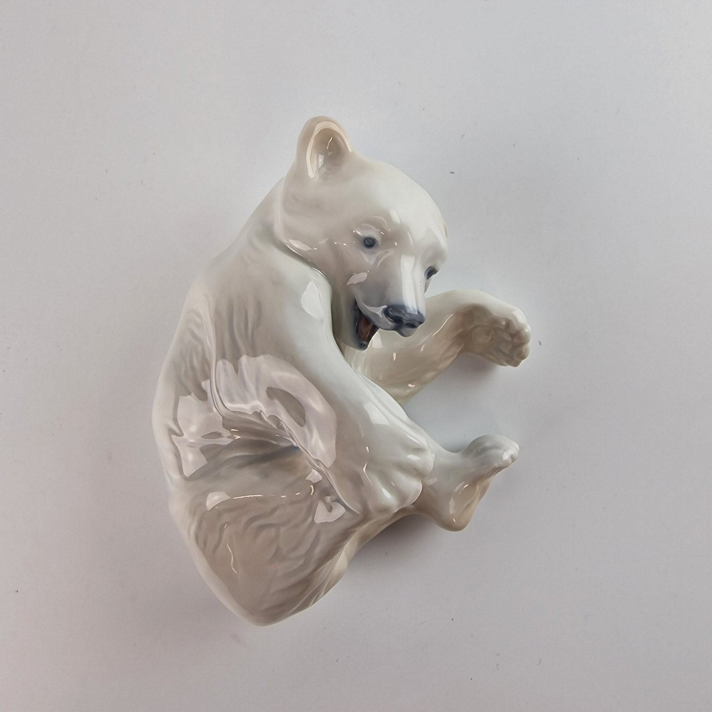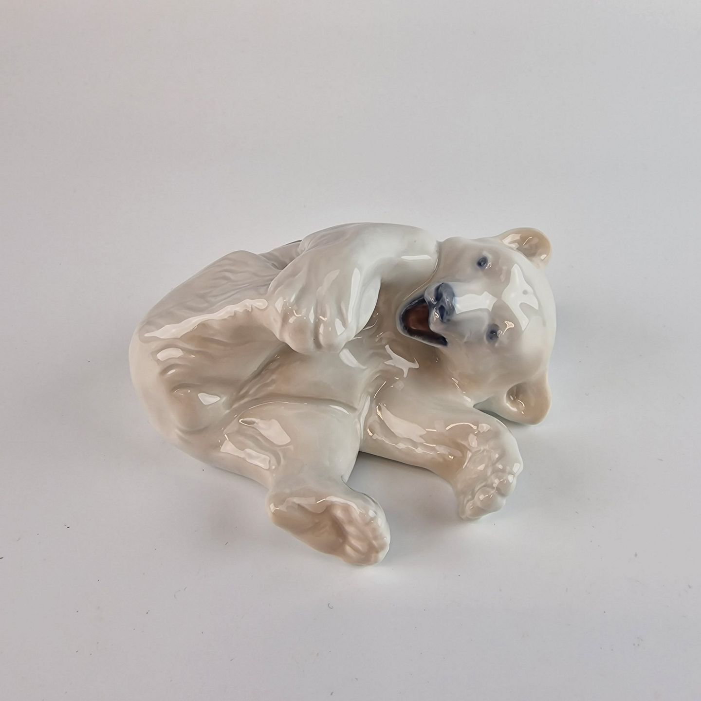 Figur som forestiller en isbjørn der ligger på siden og leger med sine poter, arkivfoto