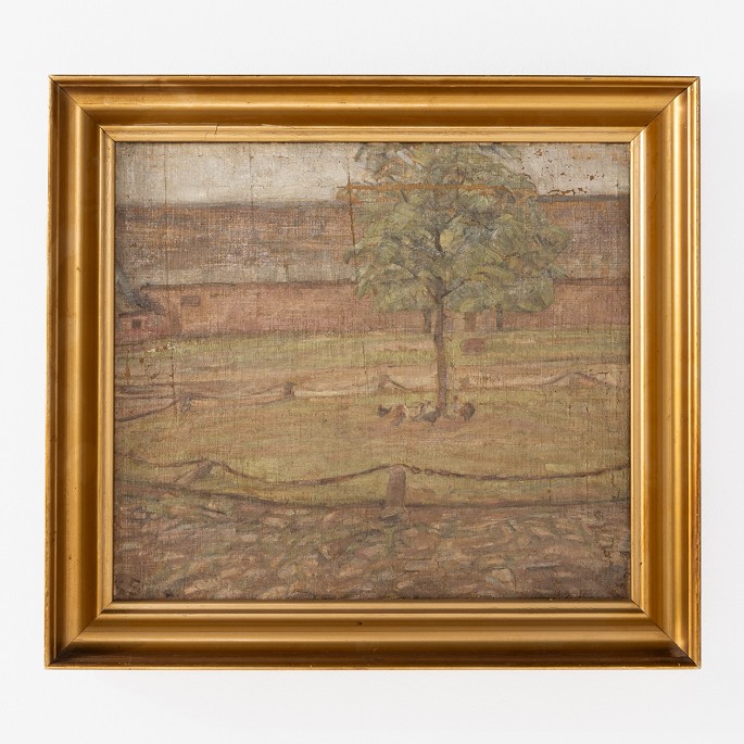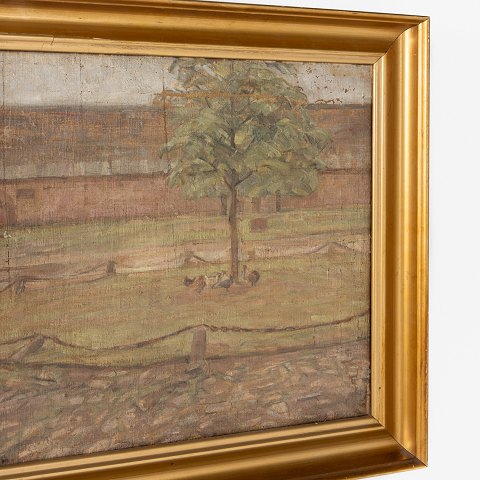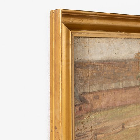 Olie på lærred. Gårdsplads i guldbemalet ramme. Signeret.