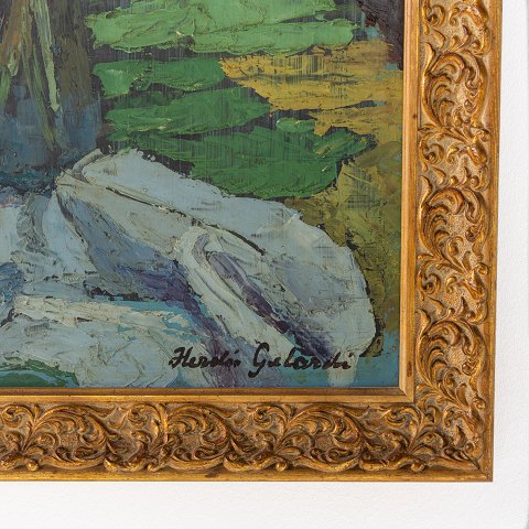Maleri. Opstilling med blomster i udskåret ramme. Signeret.