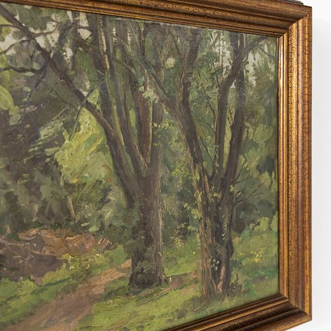 Olie på lærred. Forstbotanisk have i juni, med guldbemalet ramme. Signeret.