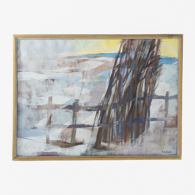 Signeret maleri med titlen 'Vinterland' fra 1998. Grå ramme i træ. Olie på lærred.