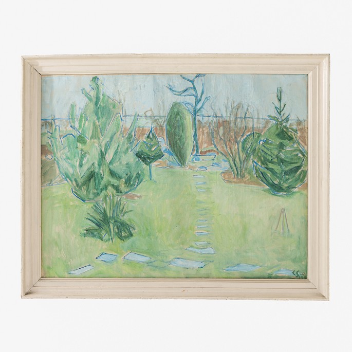 Maleri. 'Haveparti' med blå ramme fra 1944. Signeret.