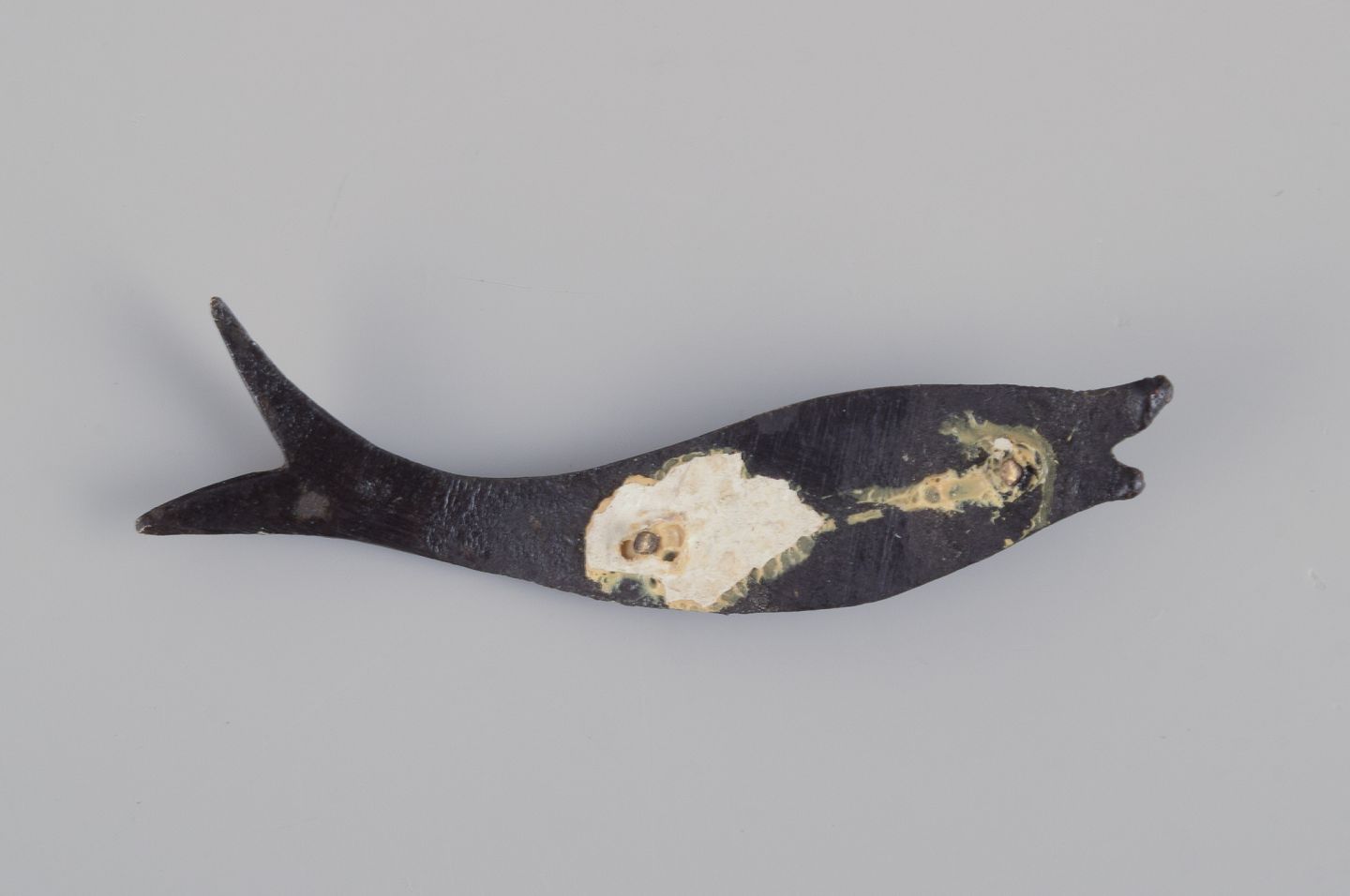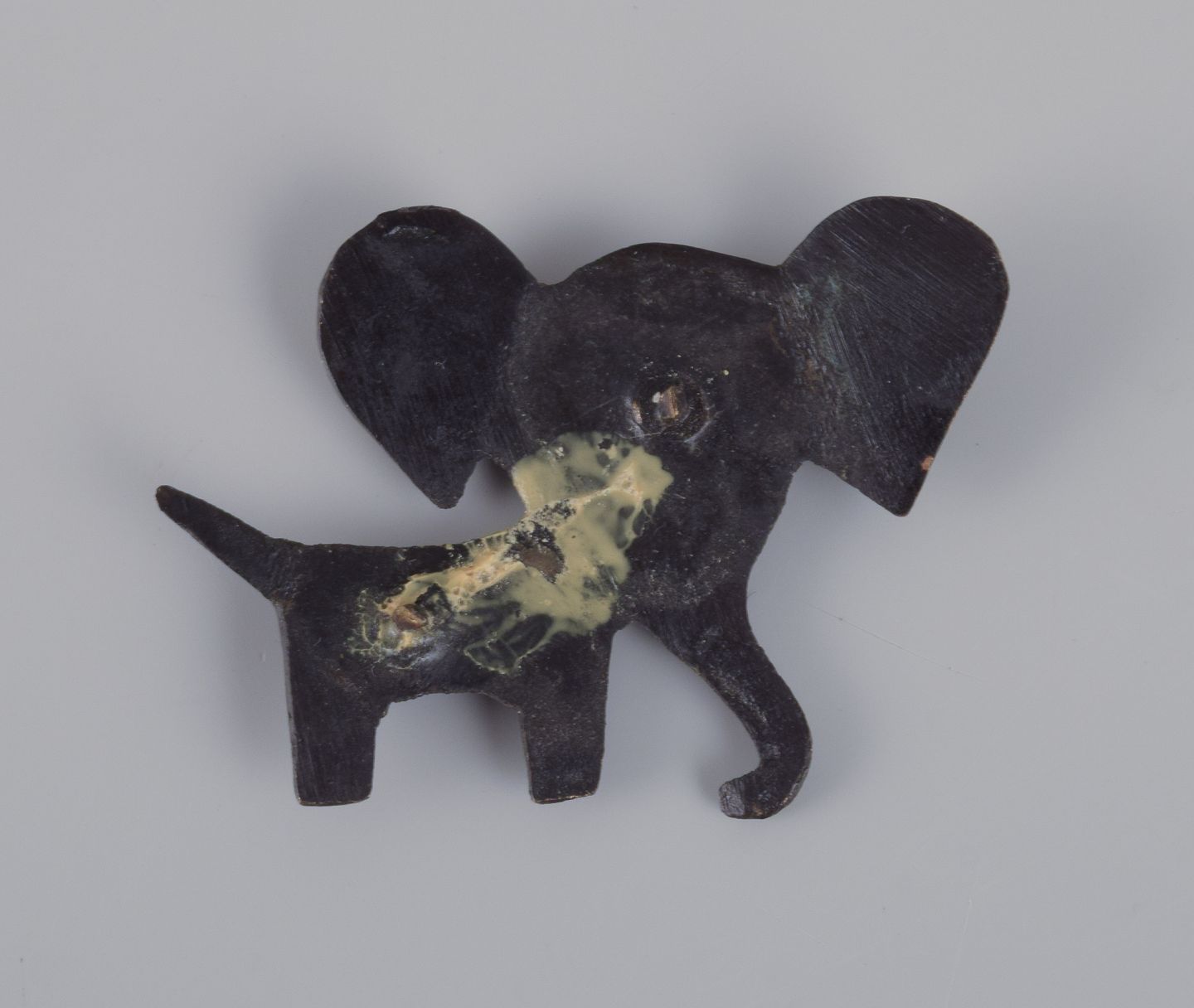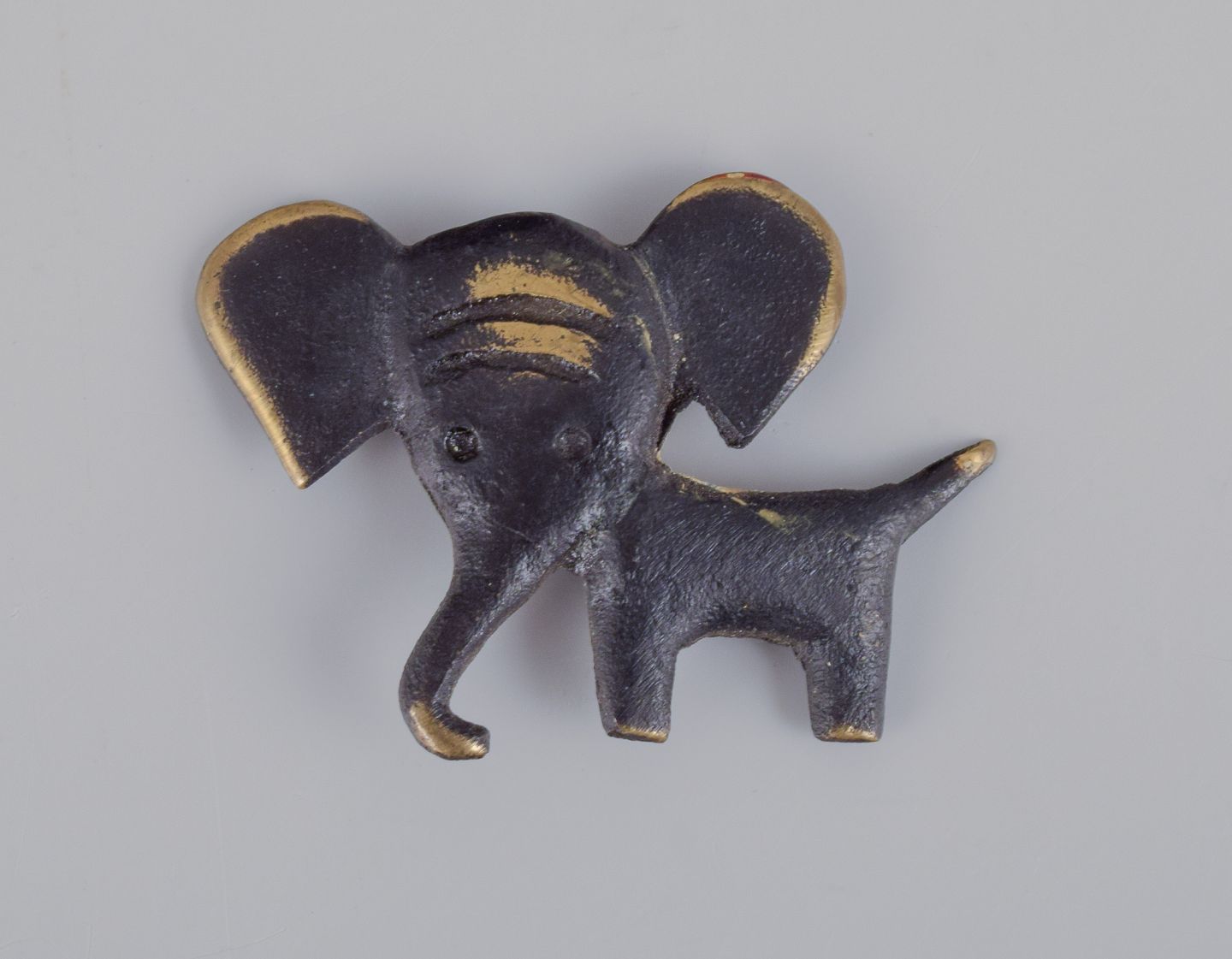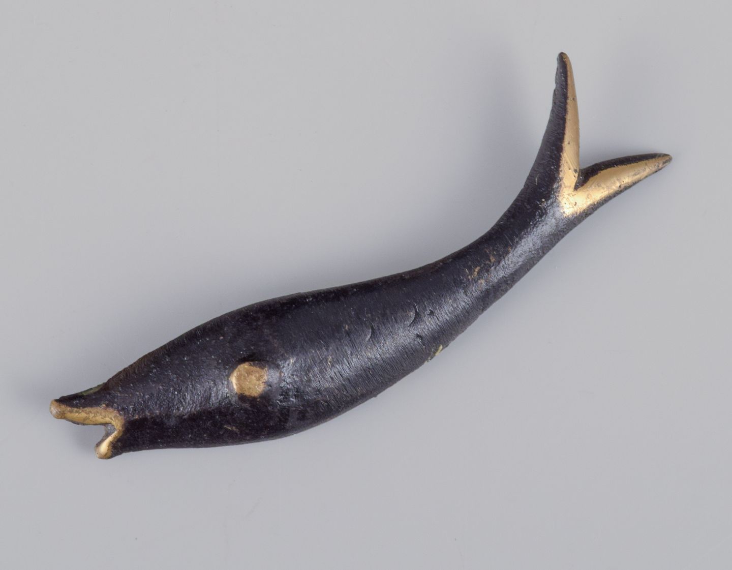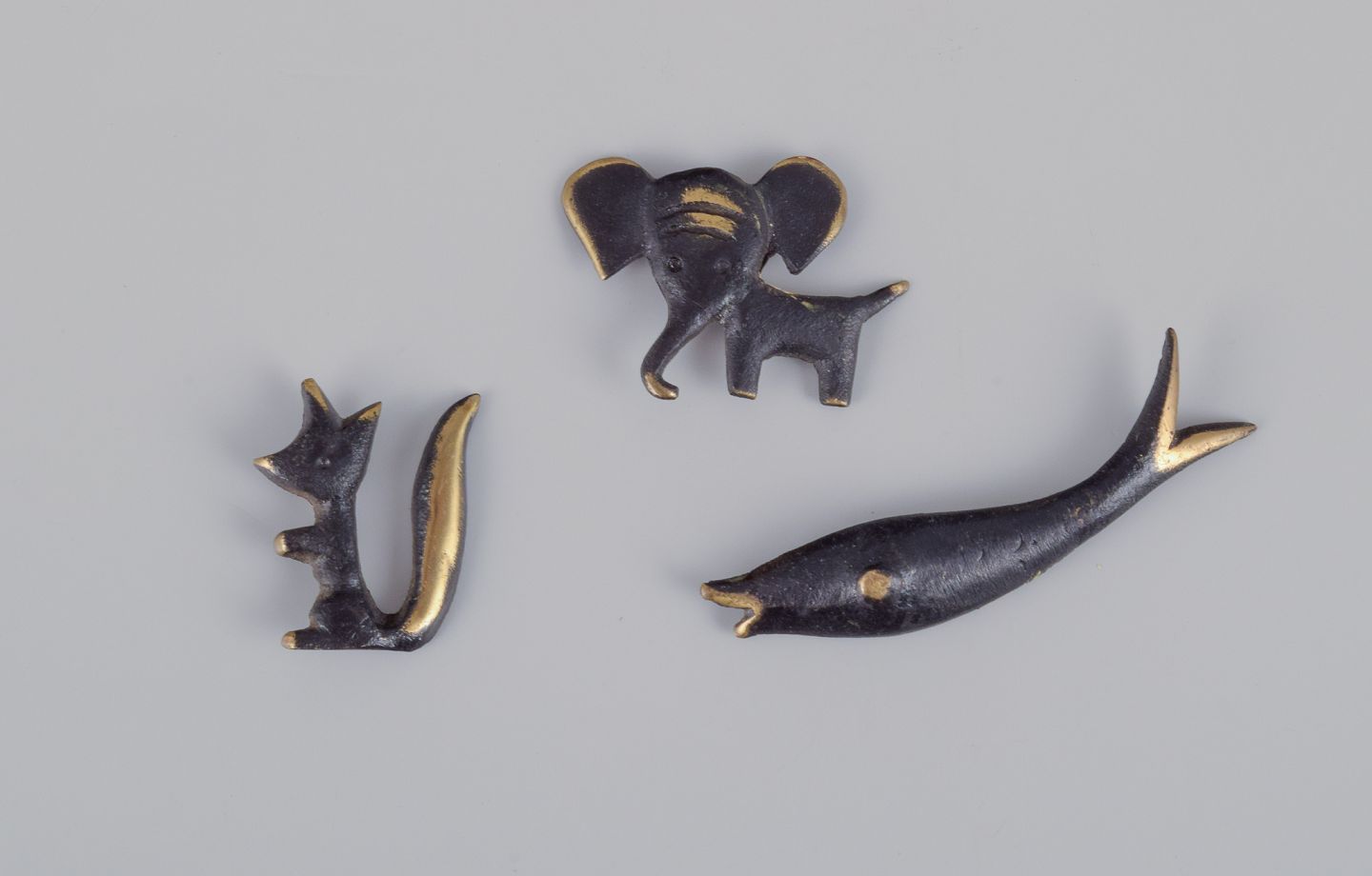 Tre miniature-figurer i bronze. Elefant, egern og hval.
