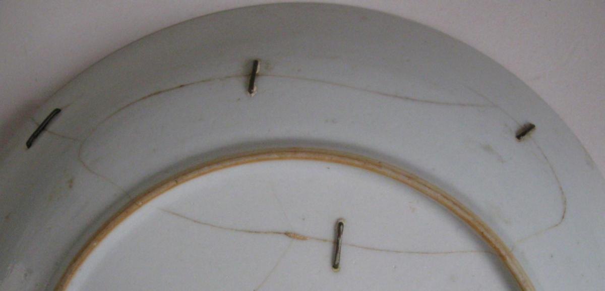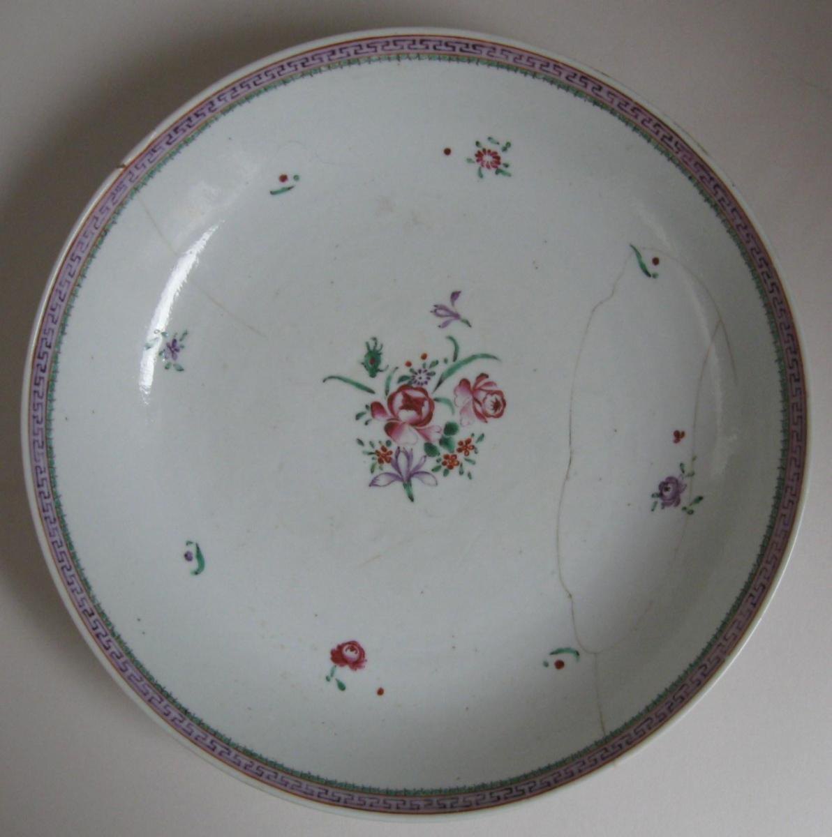 Famille Rose Plate, China, 18th Century. Chíen-Lung (1736 - 96). Decorated with roses and running dogs. H: 4 cm. Dia.: 21 cm.