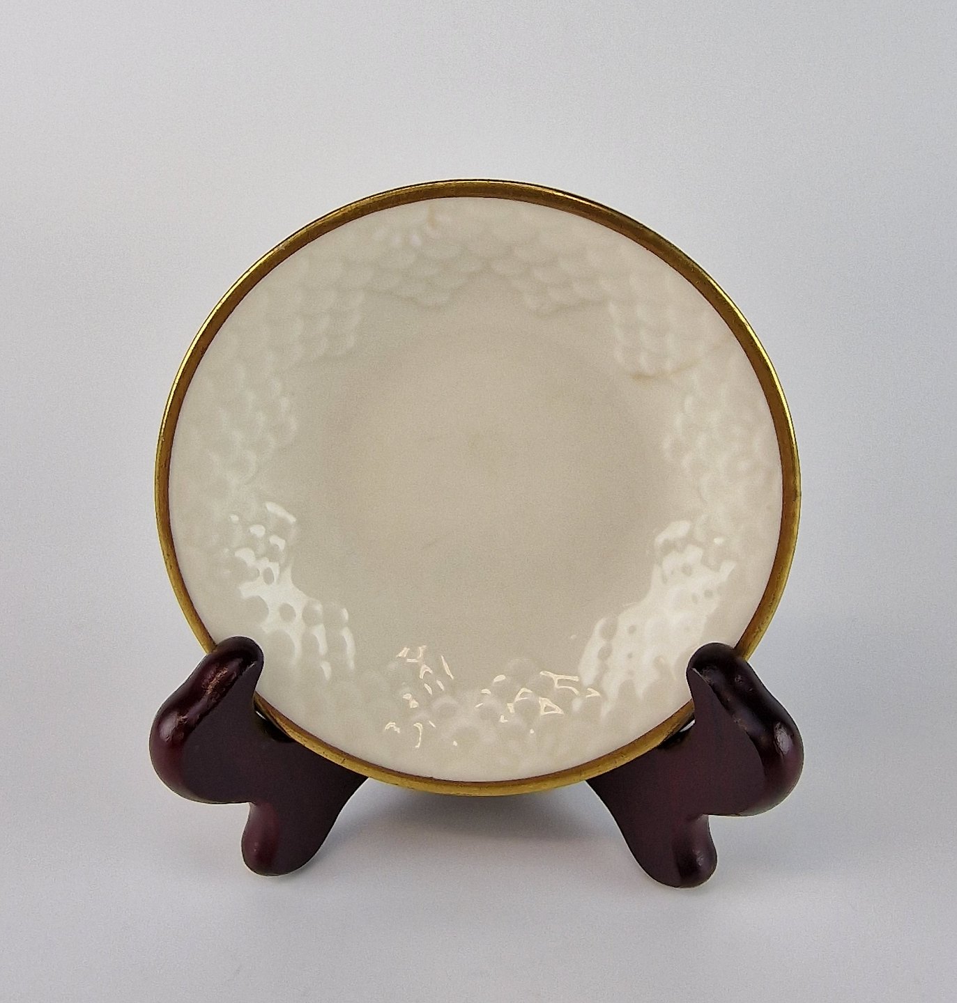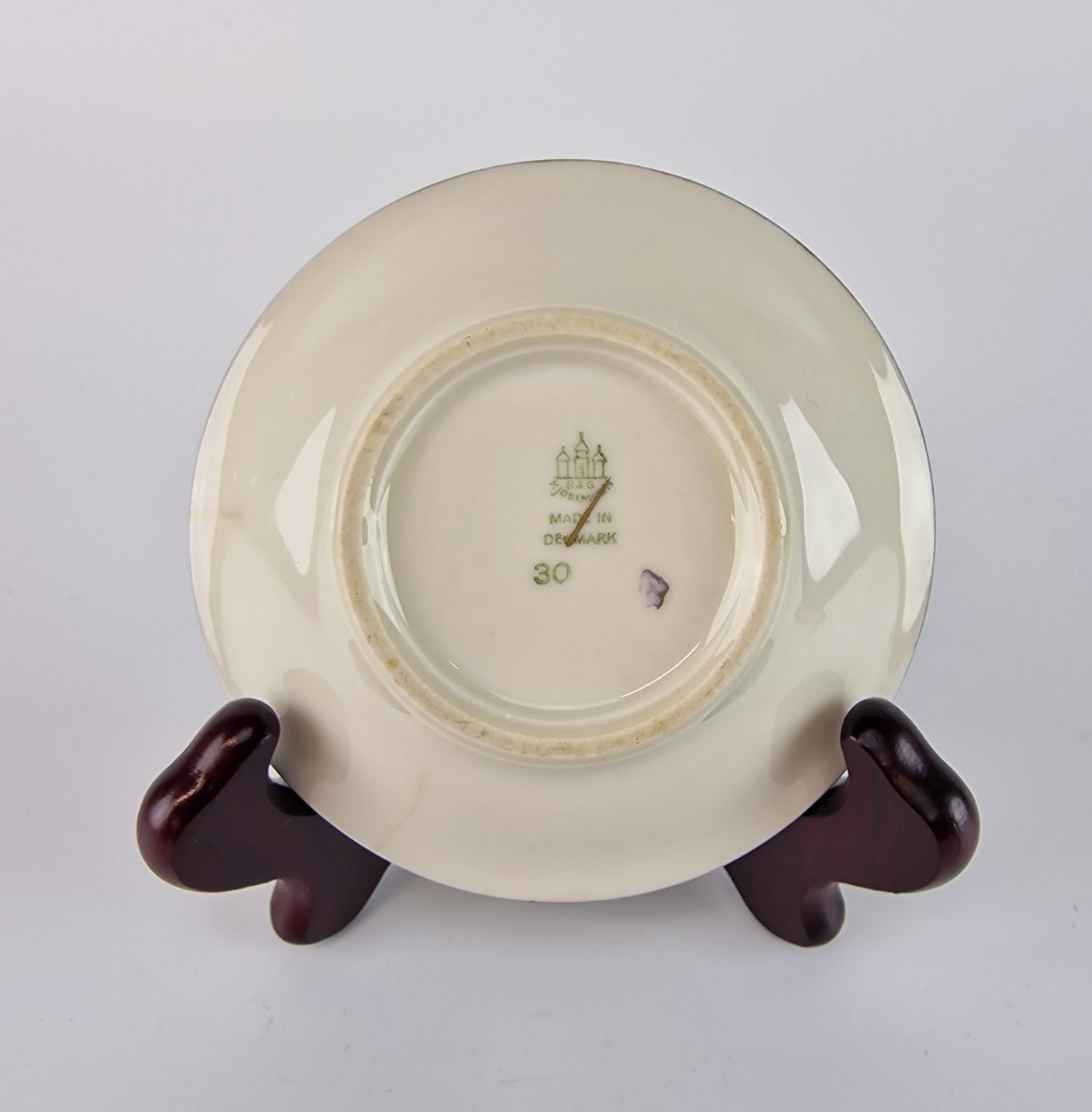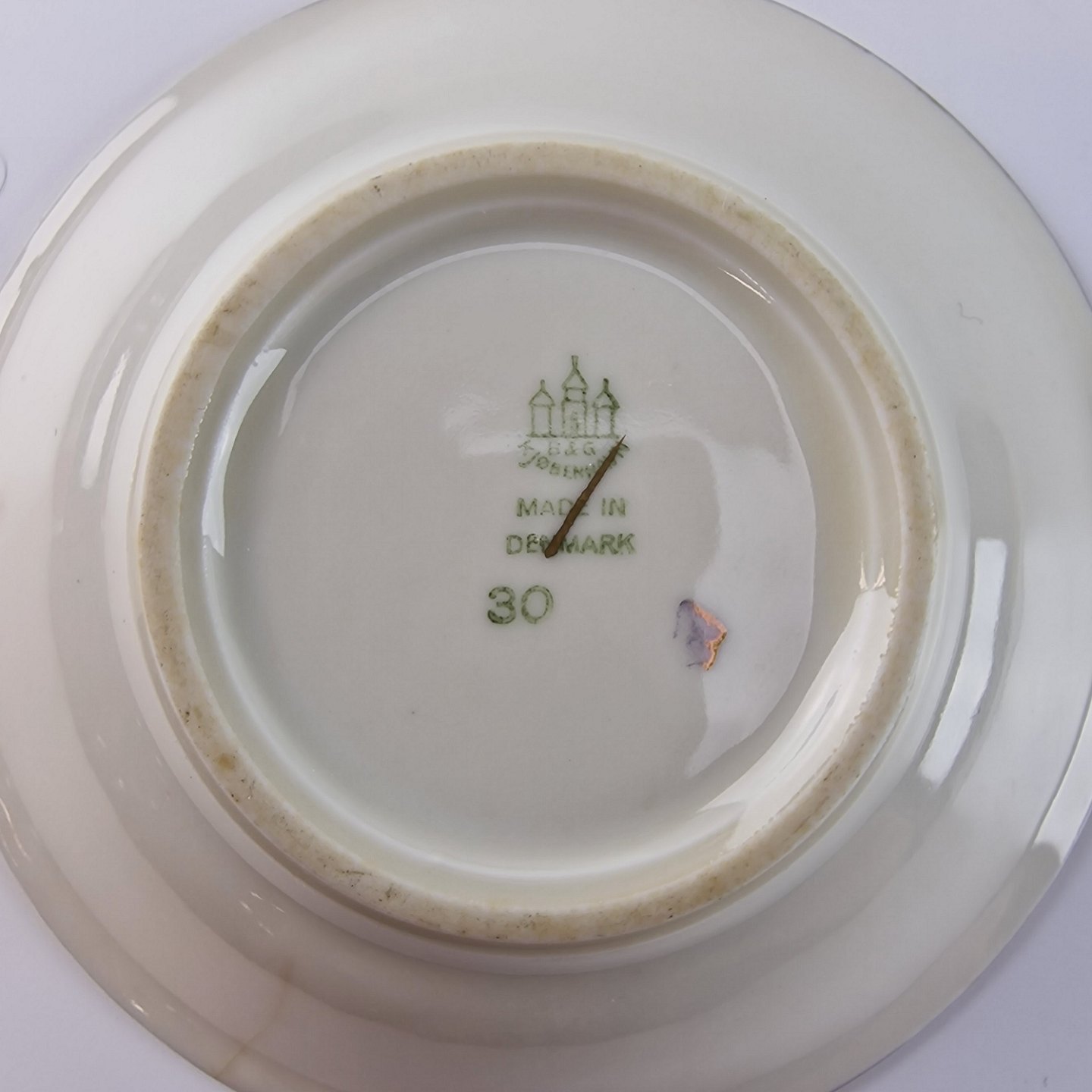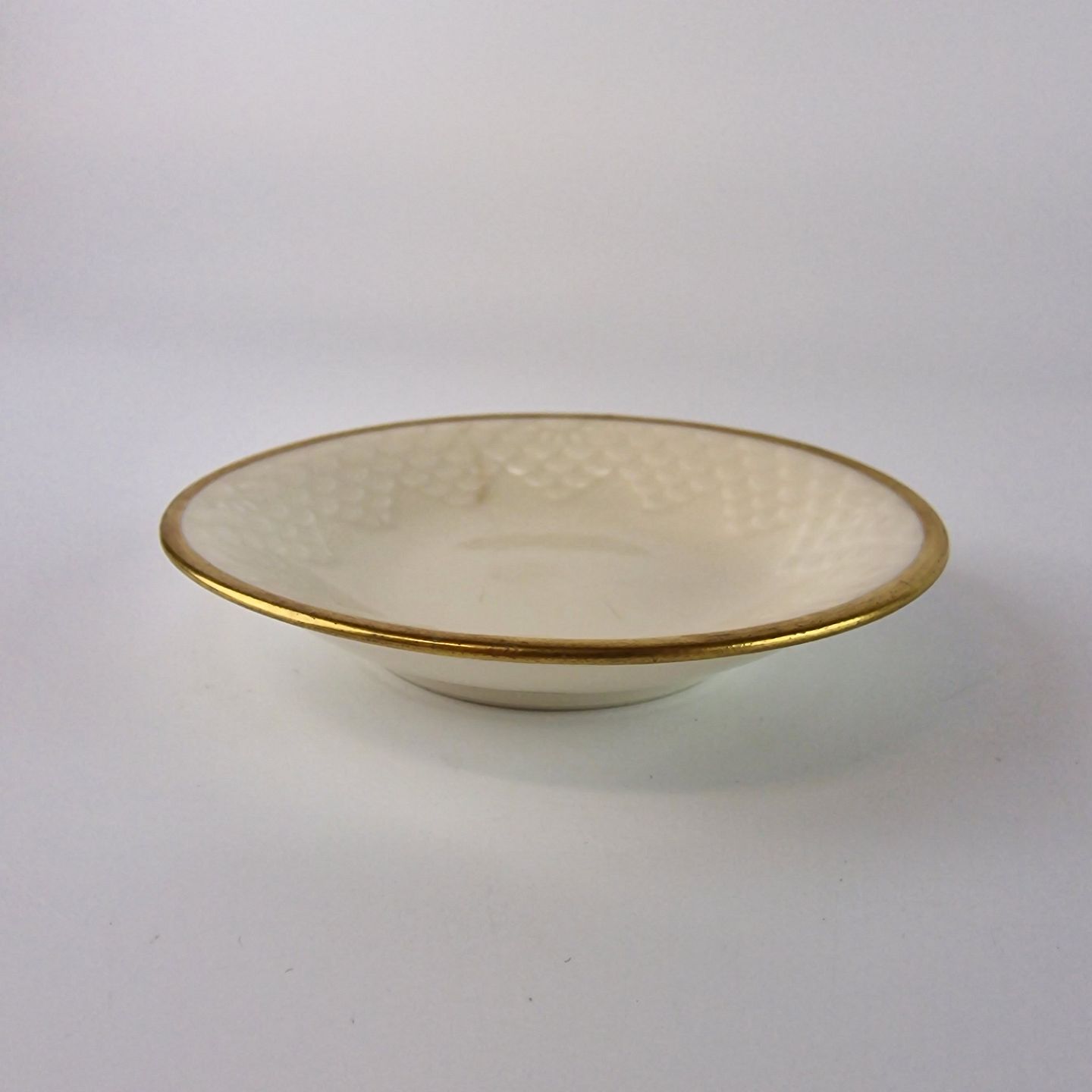 Åkjær er cremefarvet porcelæn med guldkant og mønster som ligner skæl