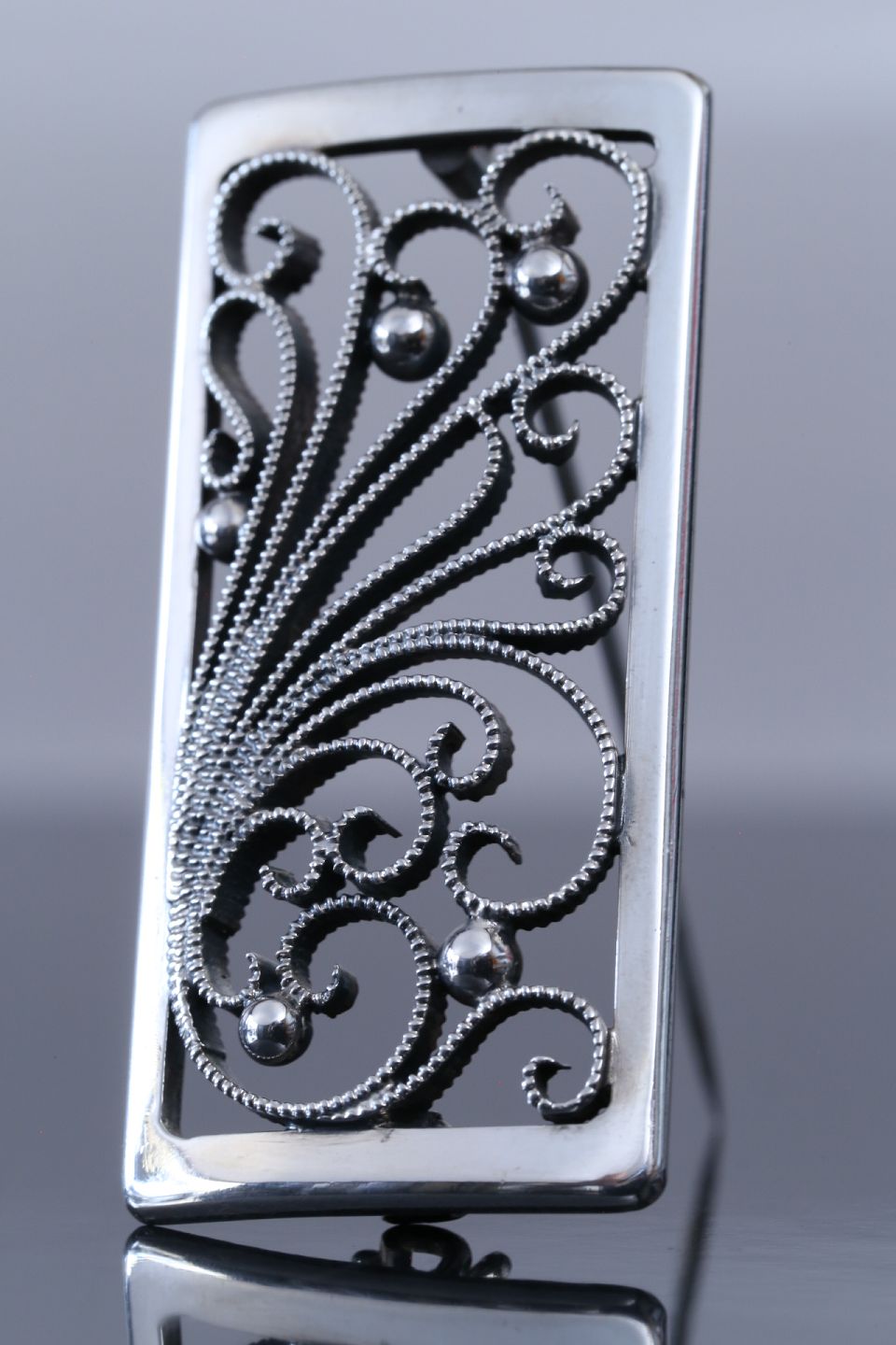 Silver brooch with very nice pattern and many details. An absolutely exclusive piece of jewelry that is sure to attract many compliments. It is clear that the silversmith has gone to great lengths to create an exclusive piece of jewellery, and it has clearly succeeded.