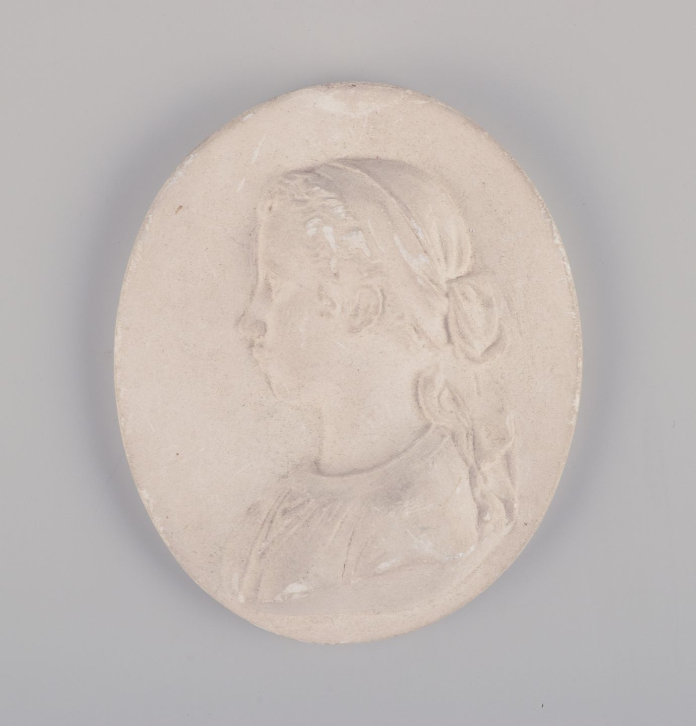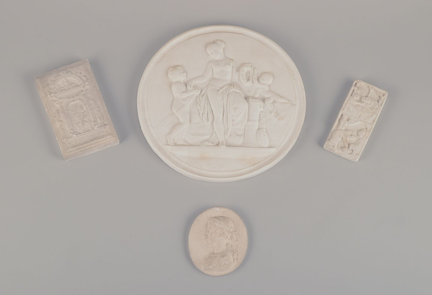 Fire relieffer i gips. Stor rund plakette med Bertel Thorvaldsen motiv, religiøst motiv samt kvinde i profil.