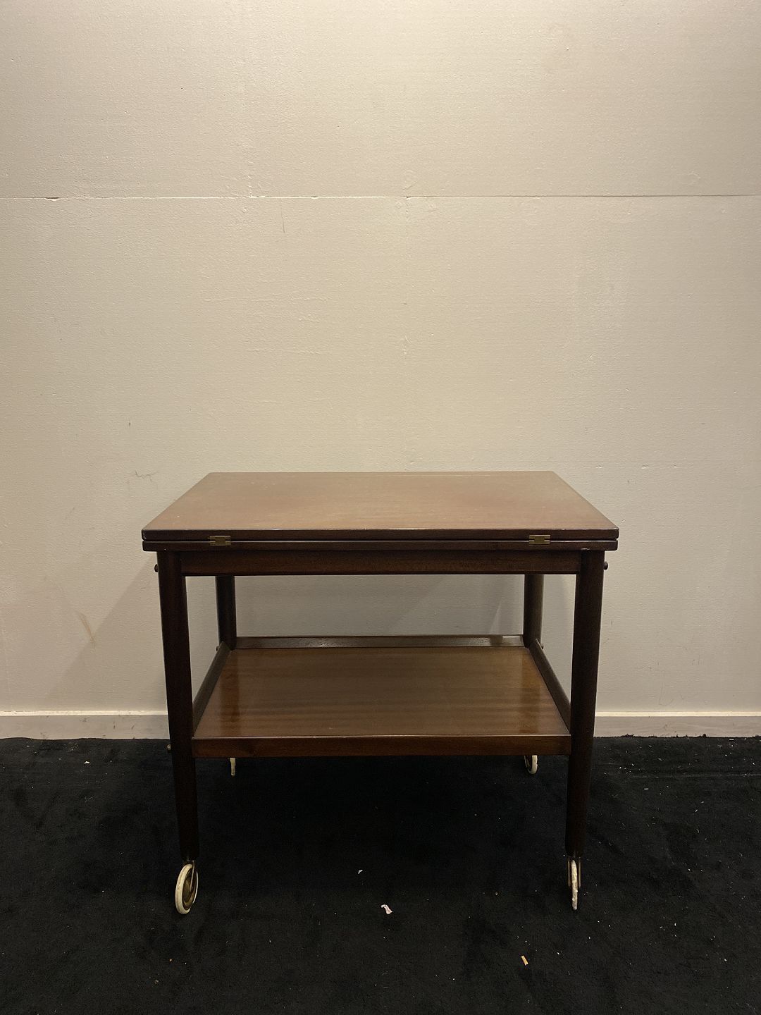 Text zugänglich auf Dänische: Rullebord i mahogni designet af Ole Wansher til Rungstedlund serien. Fremstår med lettere solbleget bordplade og defekte hjul. (billede)