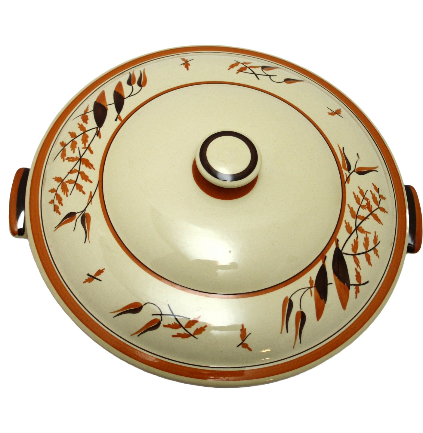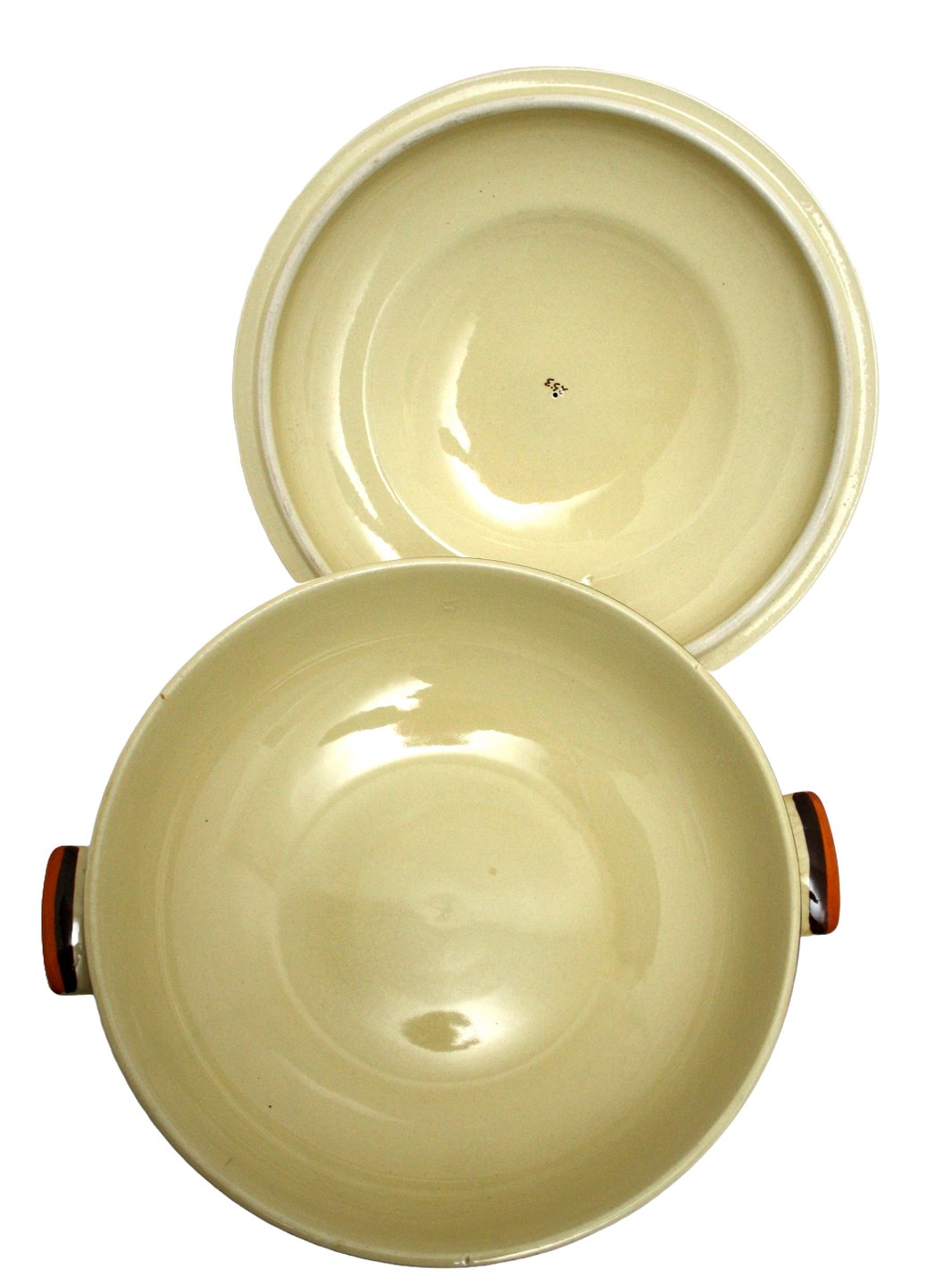 Text available in Danish: Aluminia, Aakjær dek.nr. 253, håndmalet. Designet af Thorkild Olsen. Produceret i perioden 1934-39. Lågterrin. Diameter 23 cm. Højde 13 cm. Flot stand. Pris: 350 kr. stk. Lager: 1
