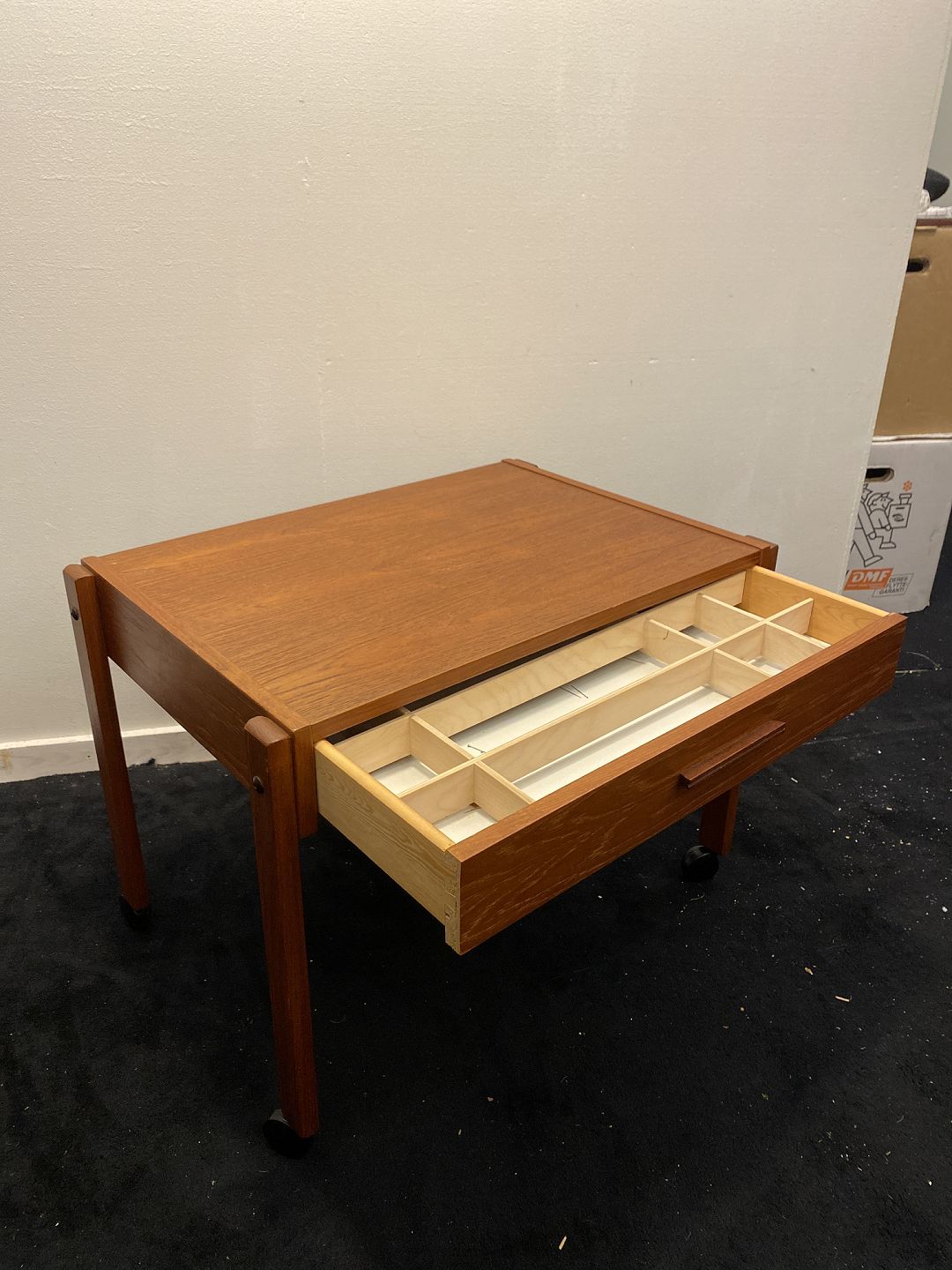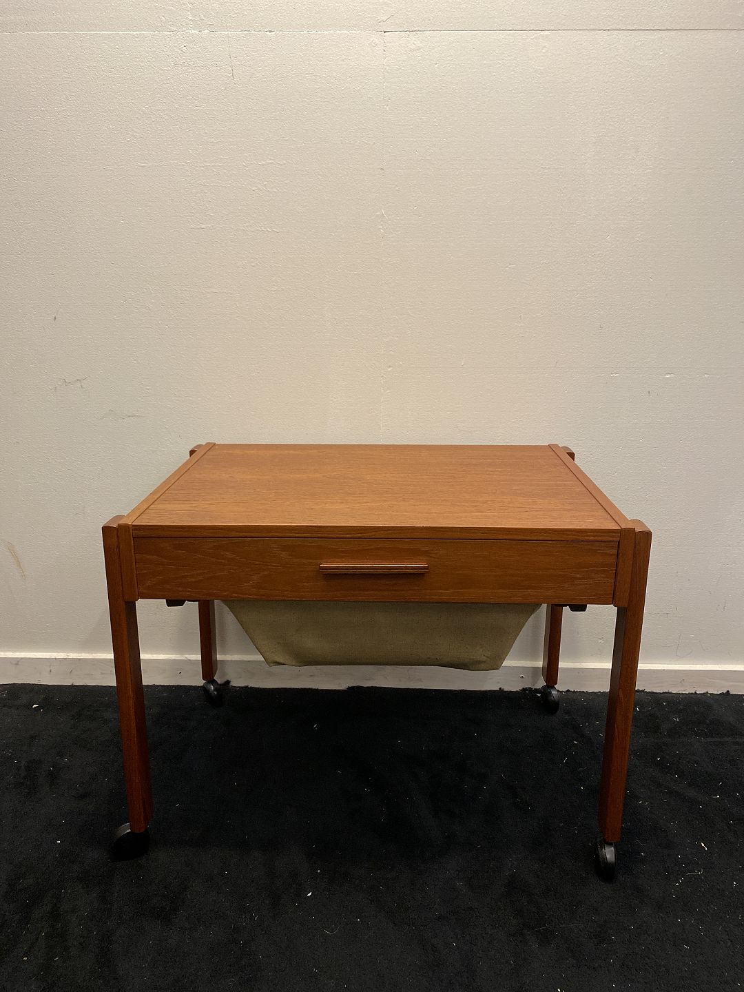 Sybord fra 1970´erne i teak med skuffe og kanvasunderhæng. Fremstår pænt, velholdt og udmærket funtionelt uden nævneværdige brugsspor.