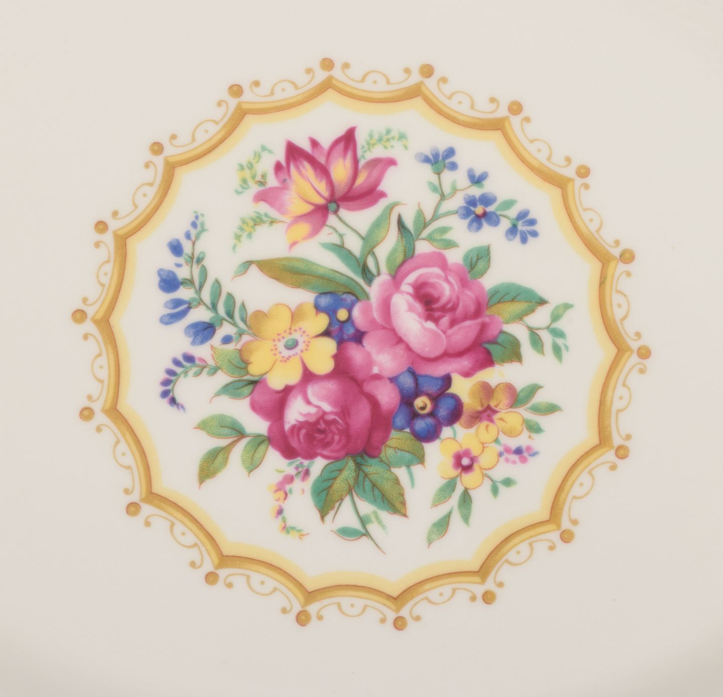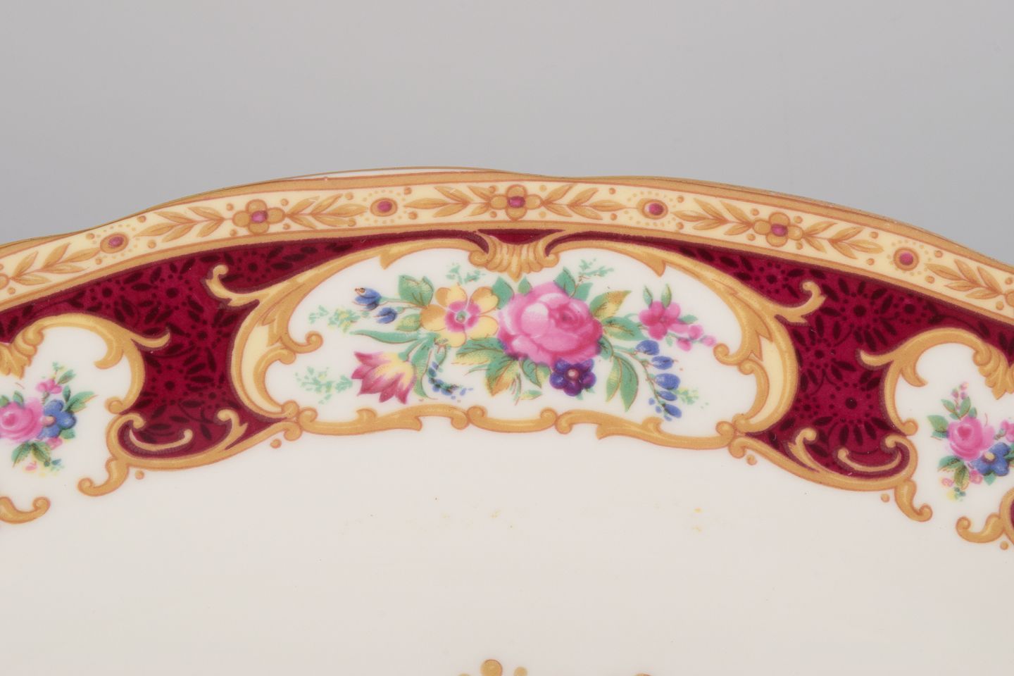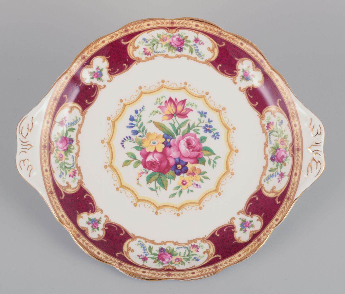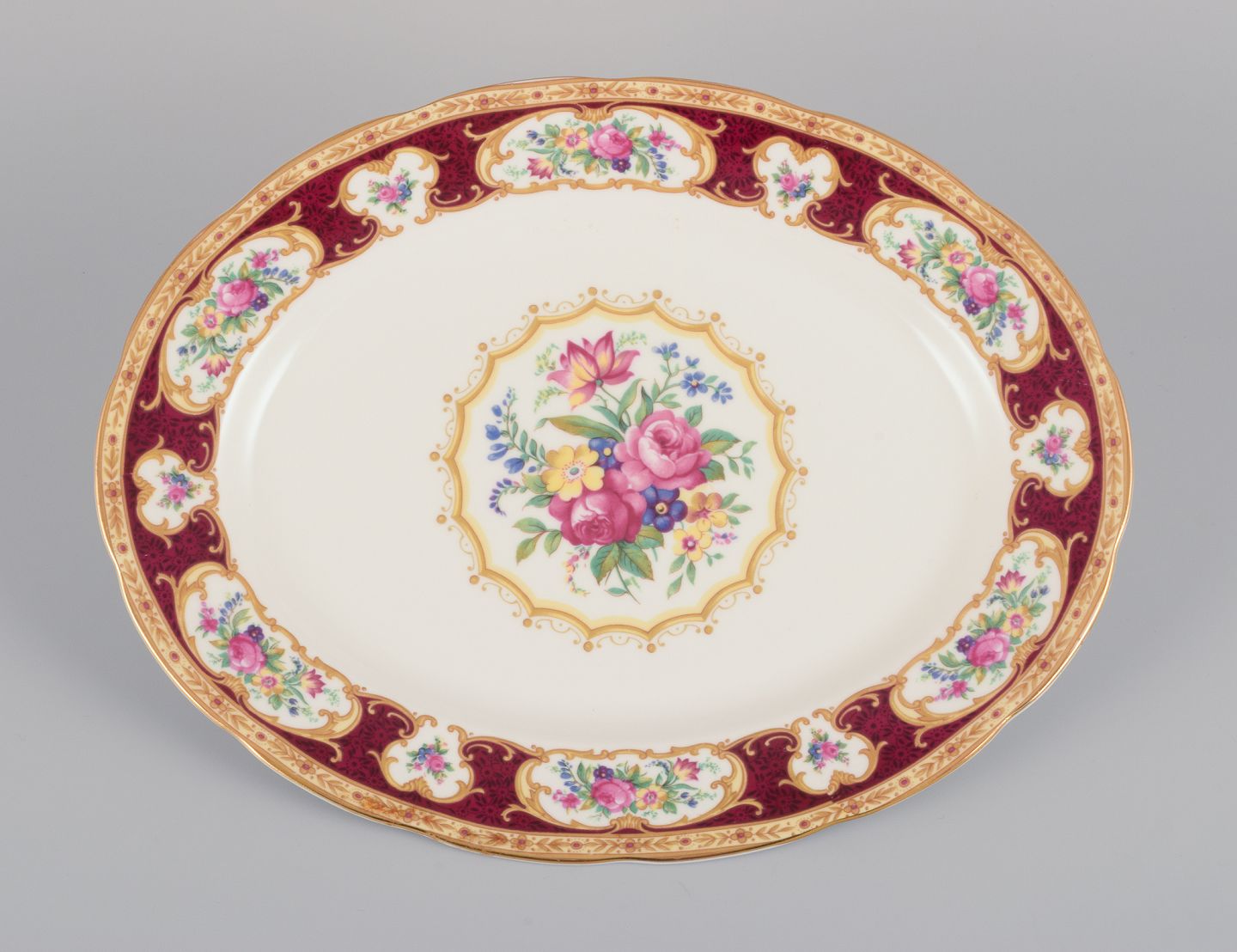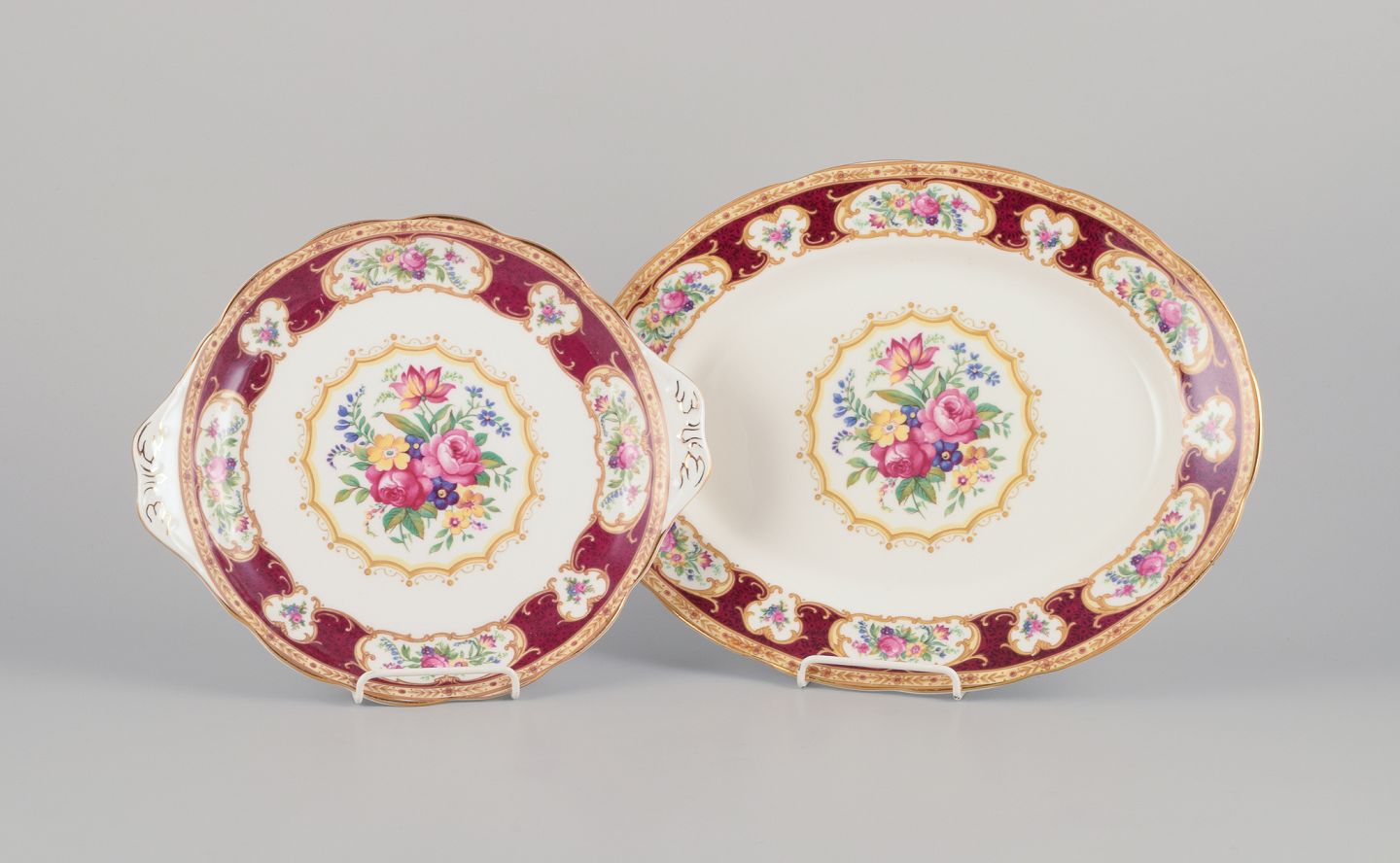 Royal Albert, England. "Lady Hamilton." Oval serving platter and a round dish with polychrome floral motifs and gold decoration.