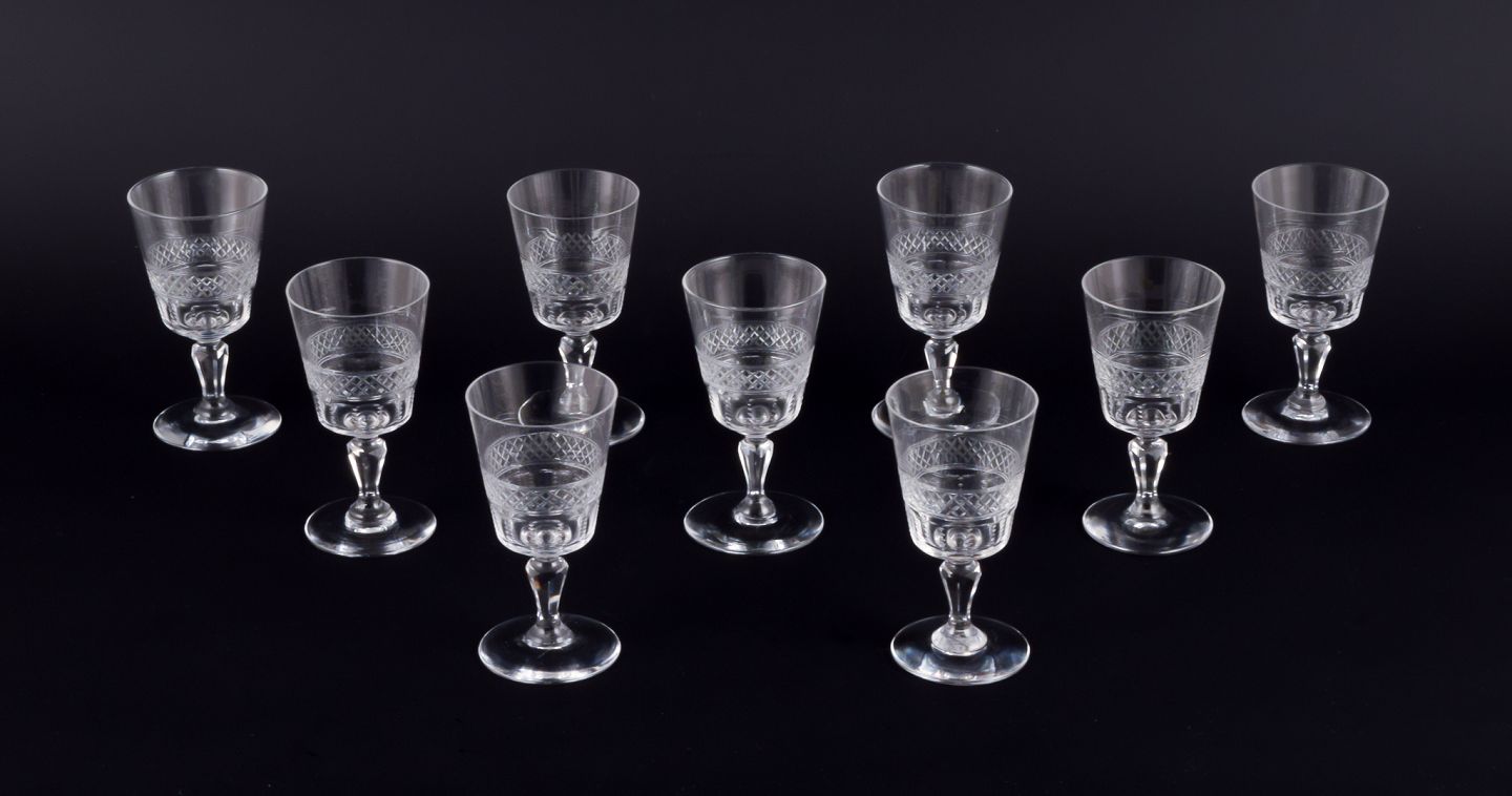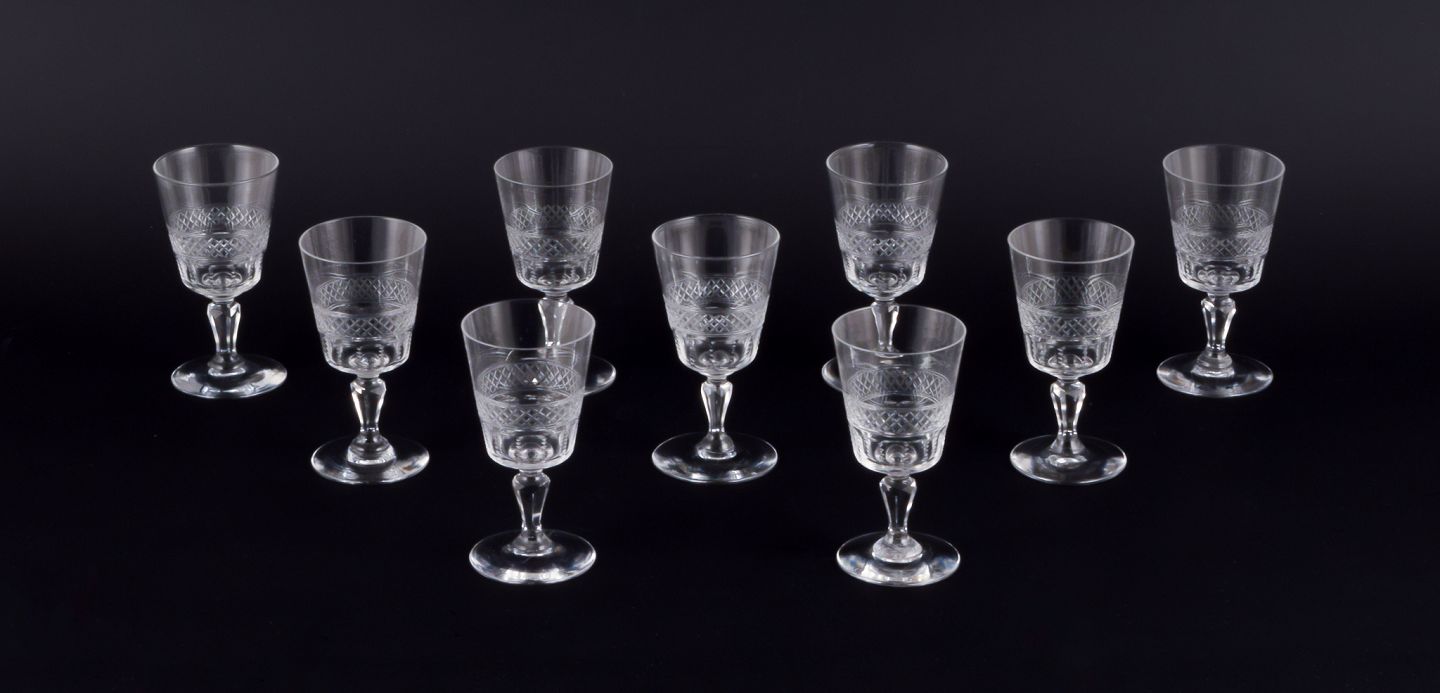 Et sæt på ni mundblæste franske sherryglas i krystalglas.