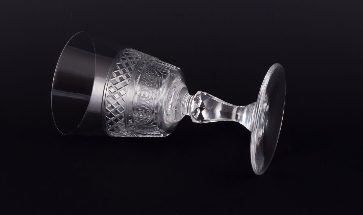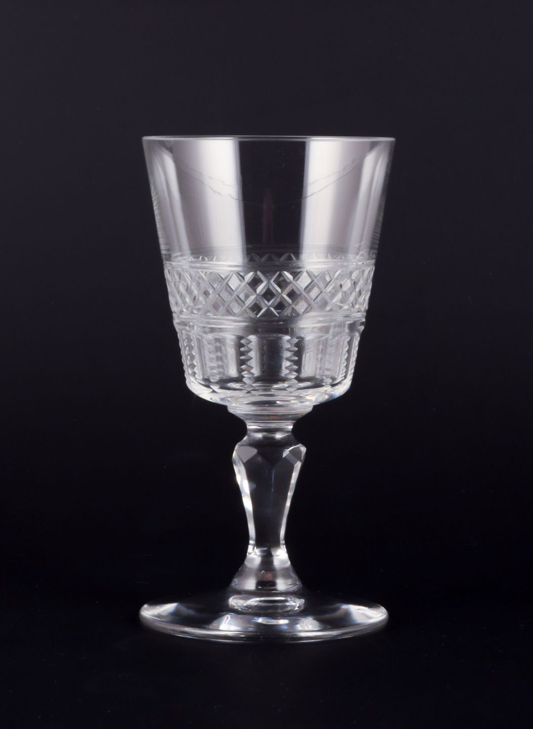 Et sæt på ni mundblæste franske sherryglas i krystalglas. Facetslebet. Håndlavet.