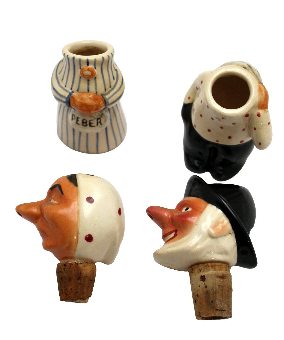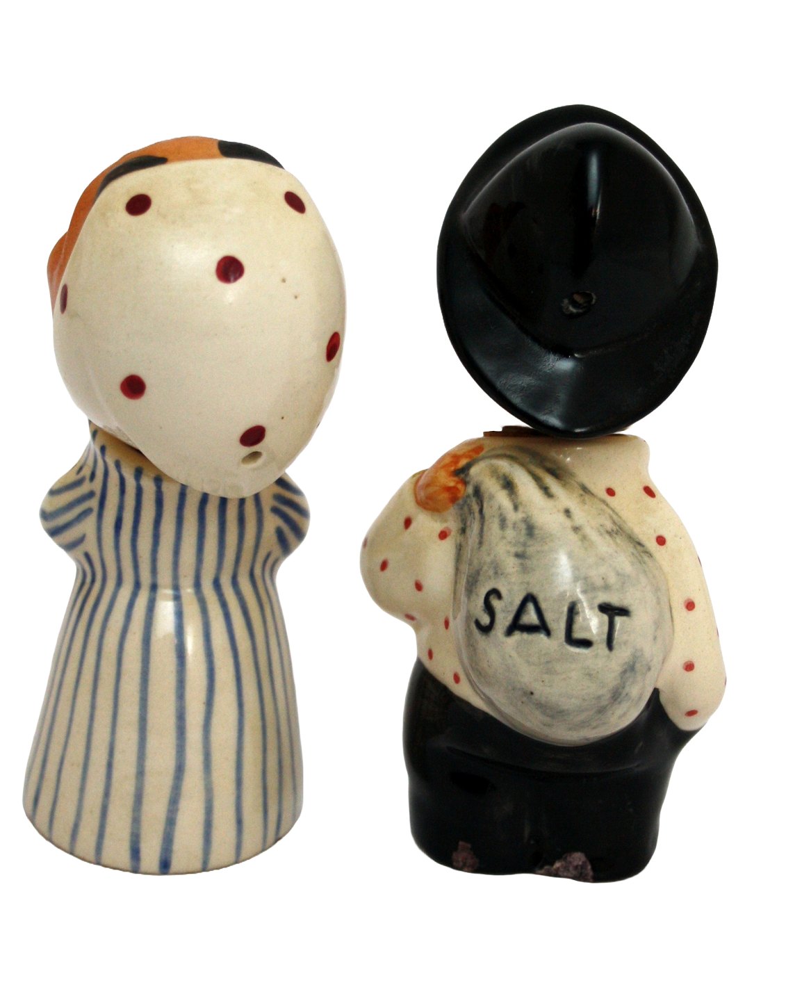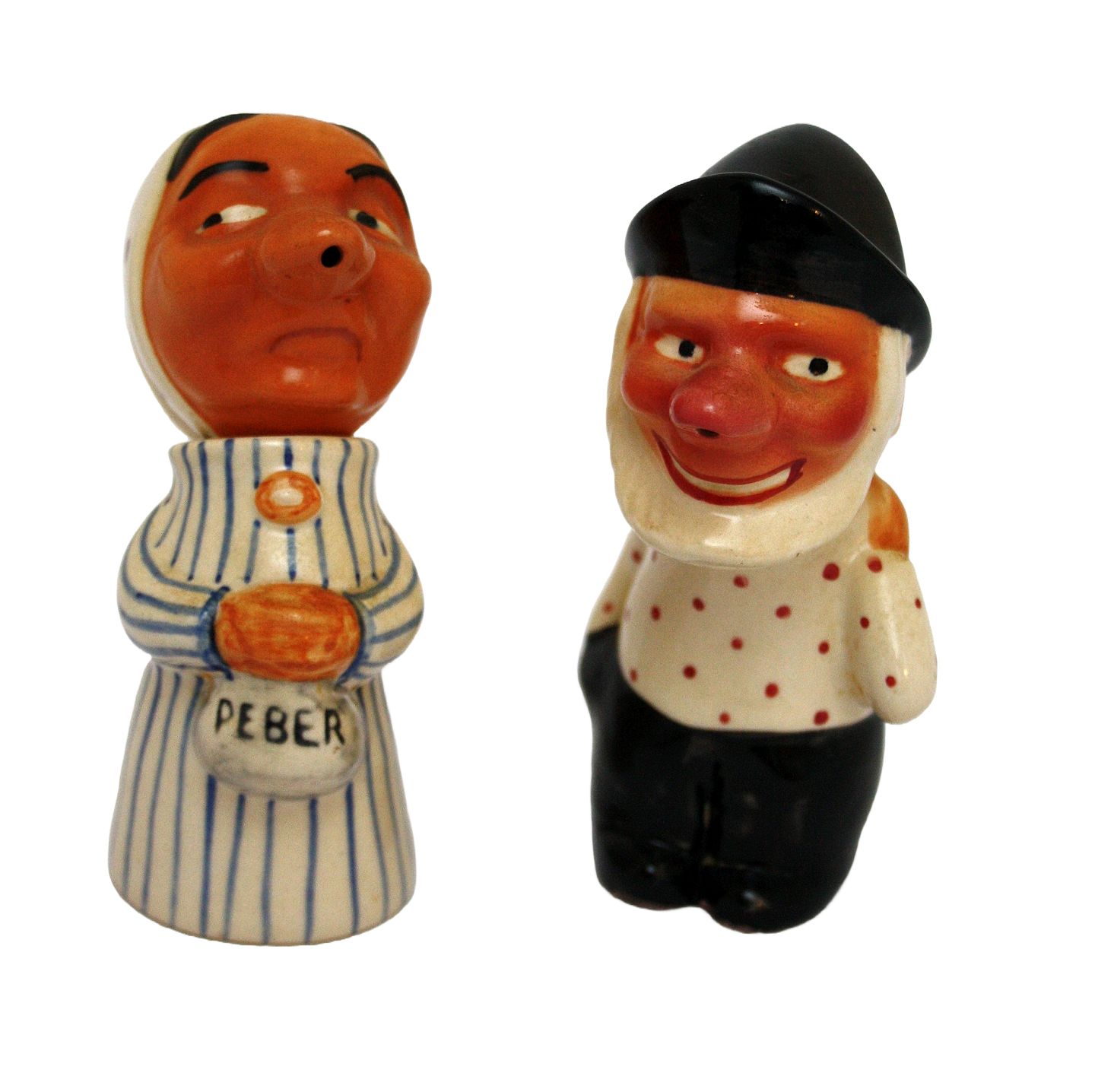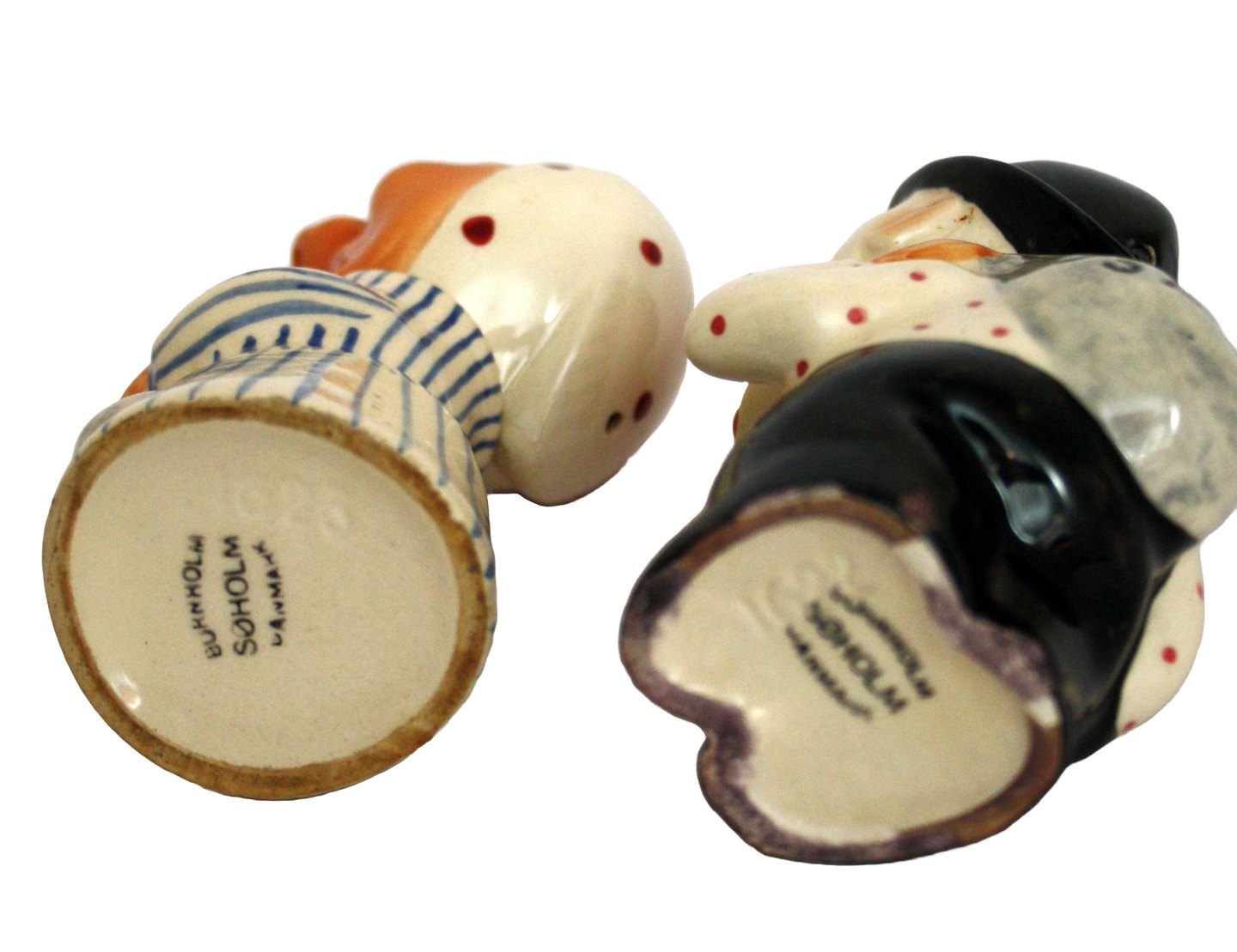 Søholm, Salt og Pebersæt som mand og kone. Højde ca. 11 cm. Designet i 1950'erne. Sjældent. Glasurafslag nederst på mandens ben, ellers meget velholdt. Pris: 500 kr.