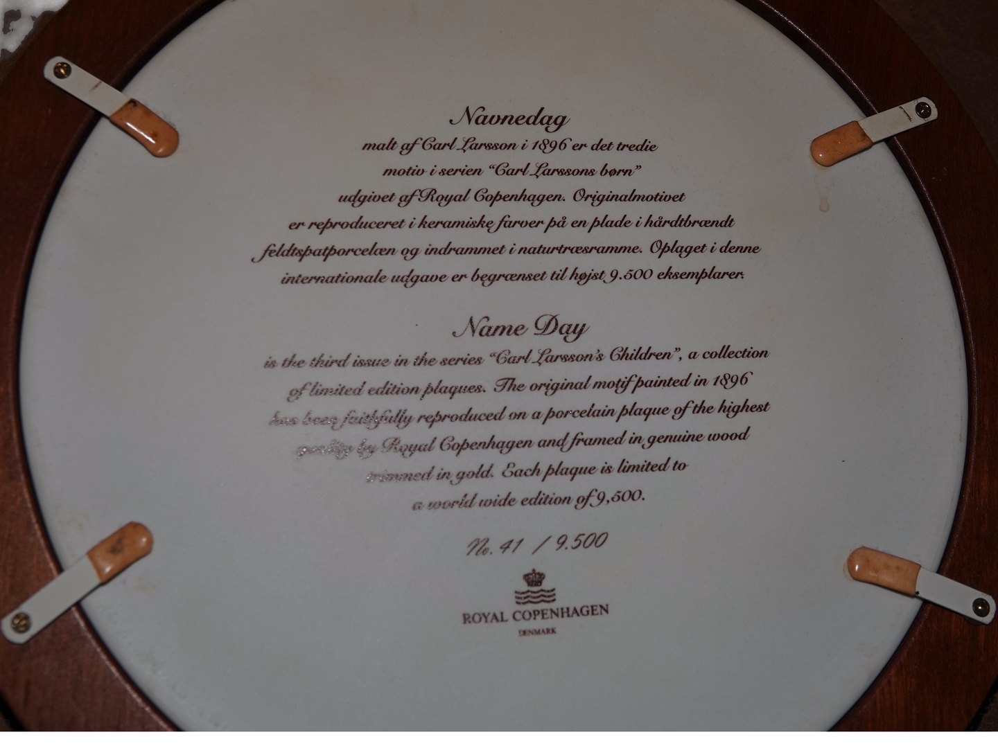 Royal Copenhagen Carl Larsson plate in dark wood frame, Name Day.