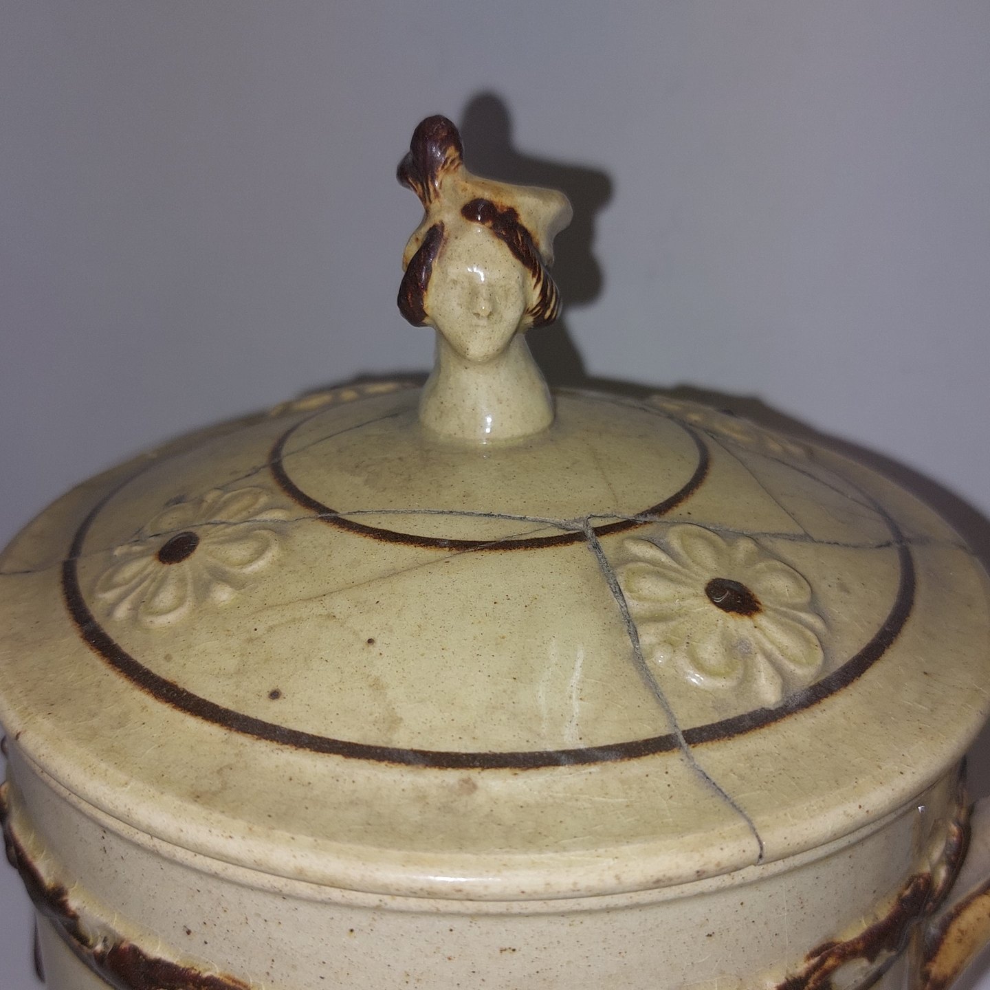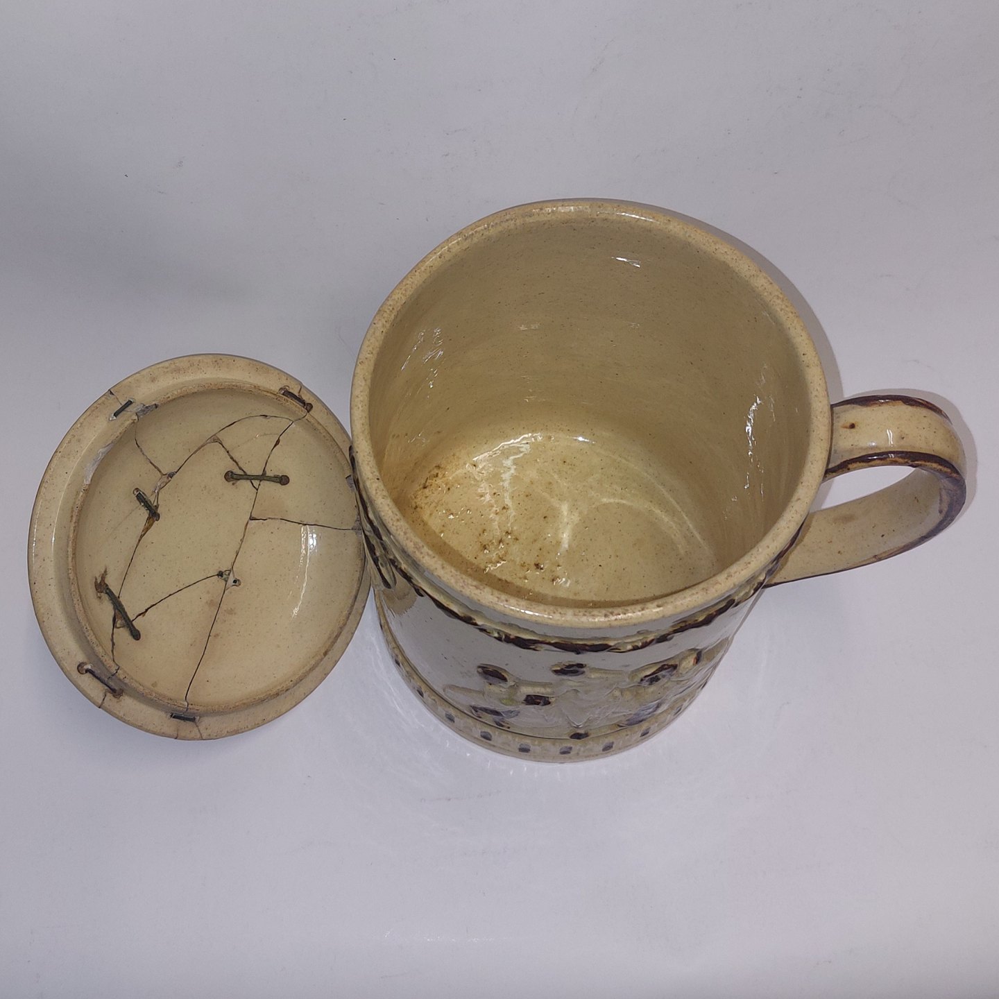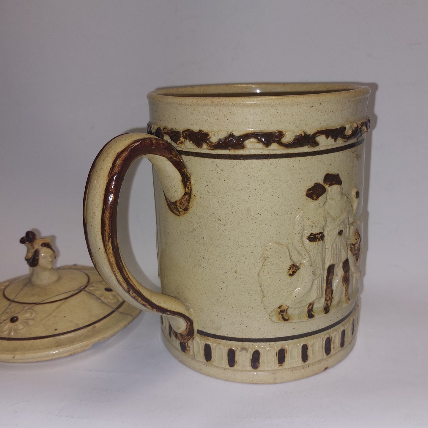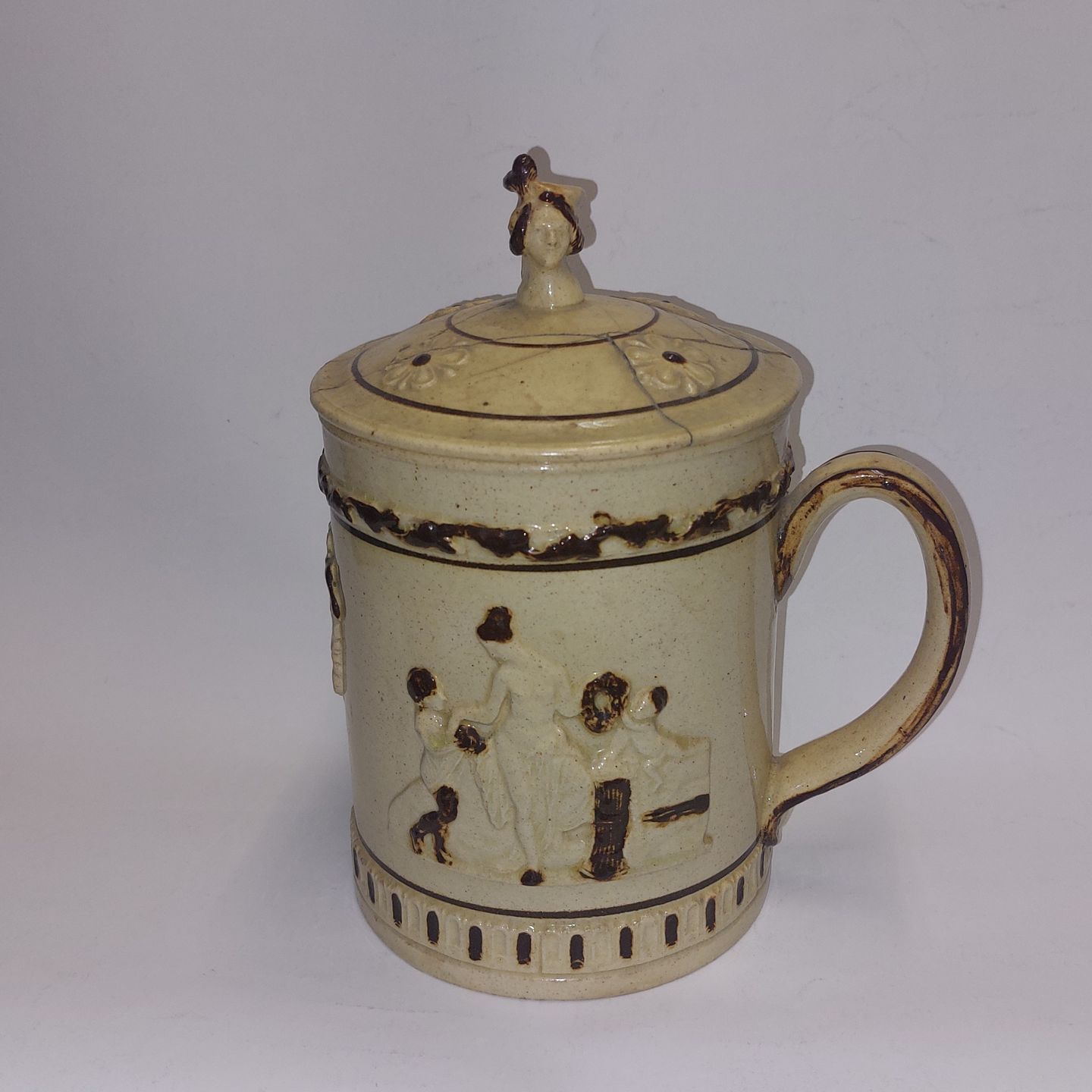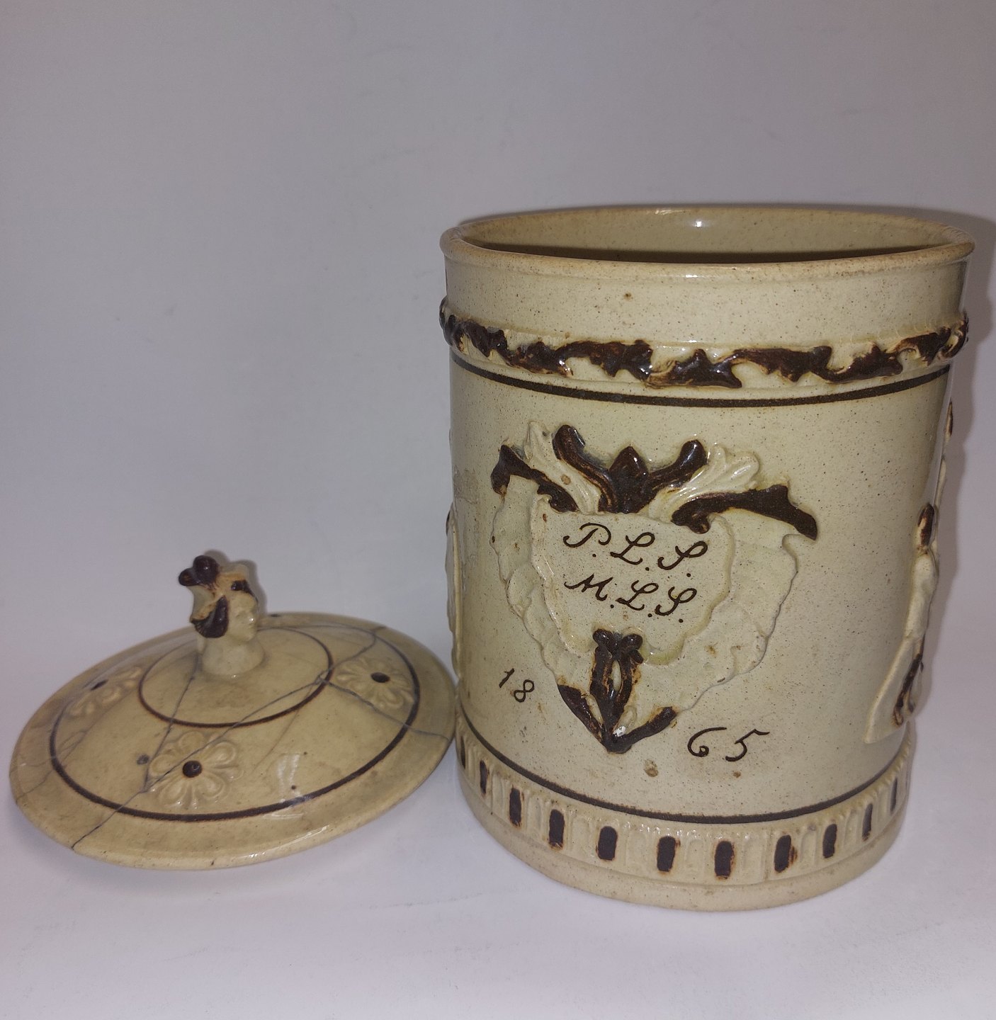 Large wedding mug with lid from Höganäs in Sweden. The lid repaired. Mug in perfect condition. The lid is decorated with a head. Mug decorated with wedding couple's monogram and also with motifs in relief by Bertel Thorvaldsen, as well as the year 1865. H. 23,5 cm