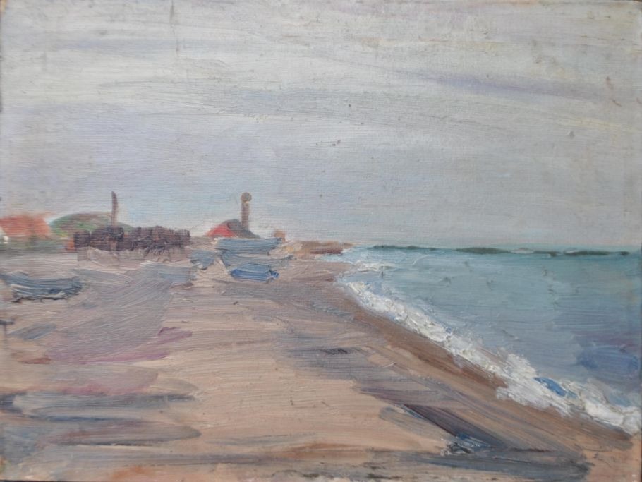 Skagens kunstner (19./20. årh.): Skagen Nordstrand mod fyret. Olie på lærred/malerpap. Skitse. Usigneret. 30,5 x 40 cm.