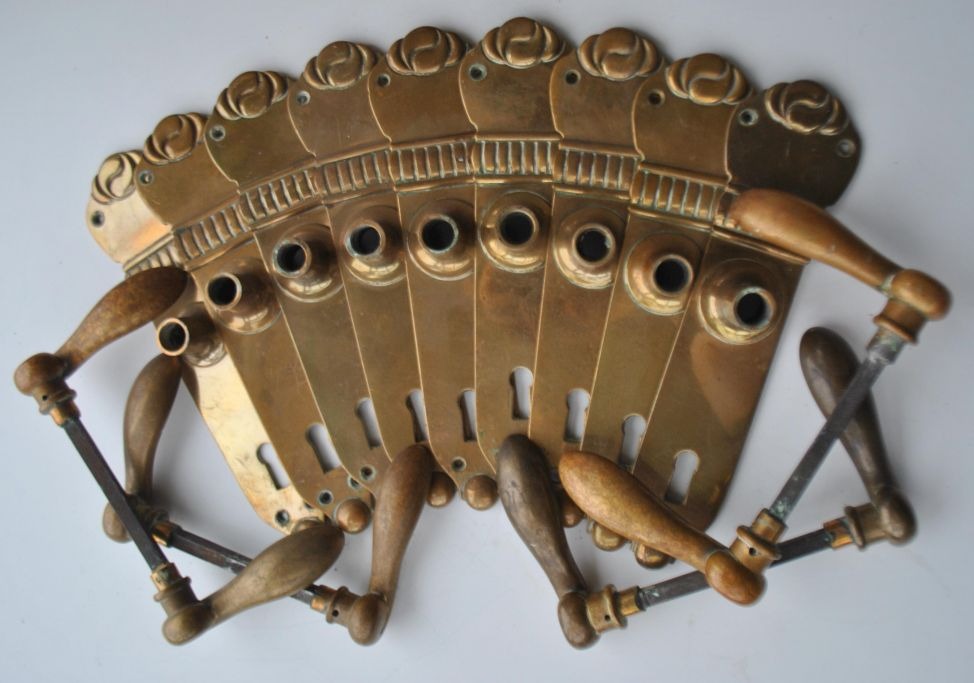 4 dørhåndtag med beslag i messing. Jugend. 20. årh. Danmark. Beslag: H: 23,7 cm B: 6,3 cm Håndtag: B: 16,5 cm. Et ekstra messing beslag medfølger.
