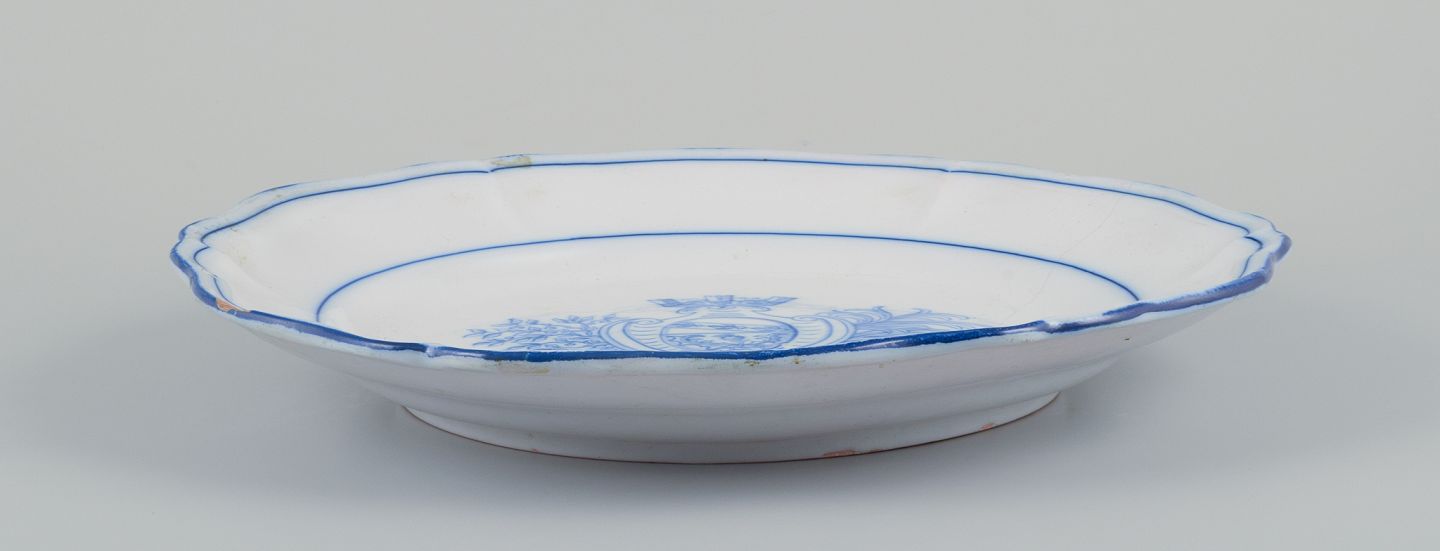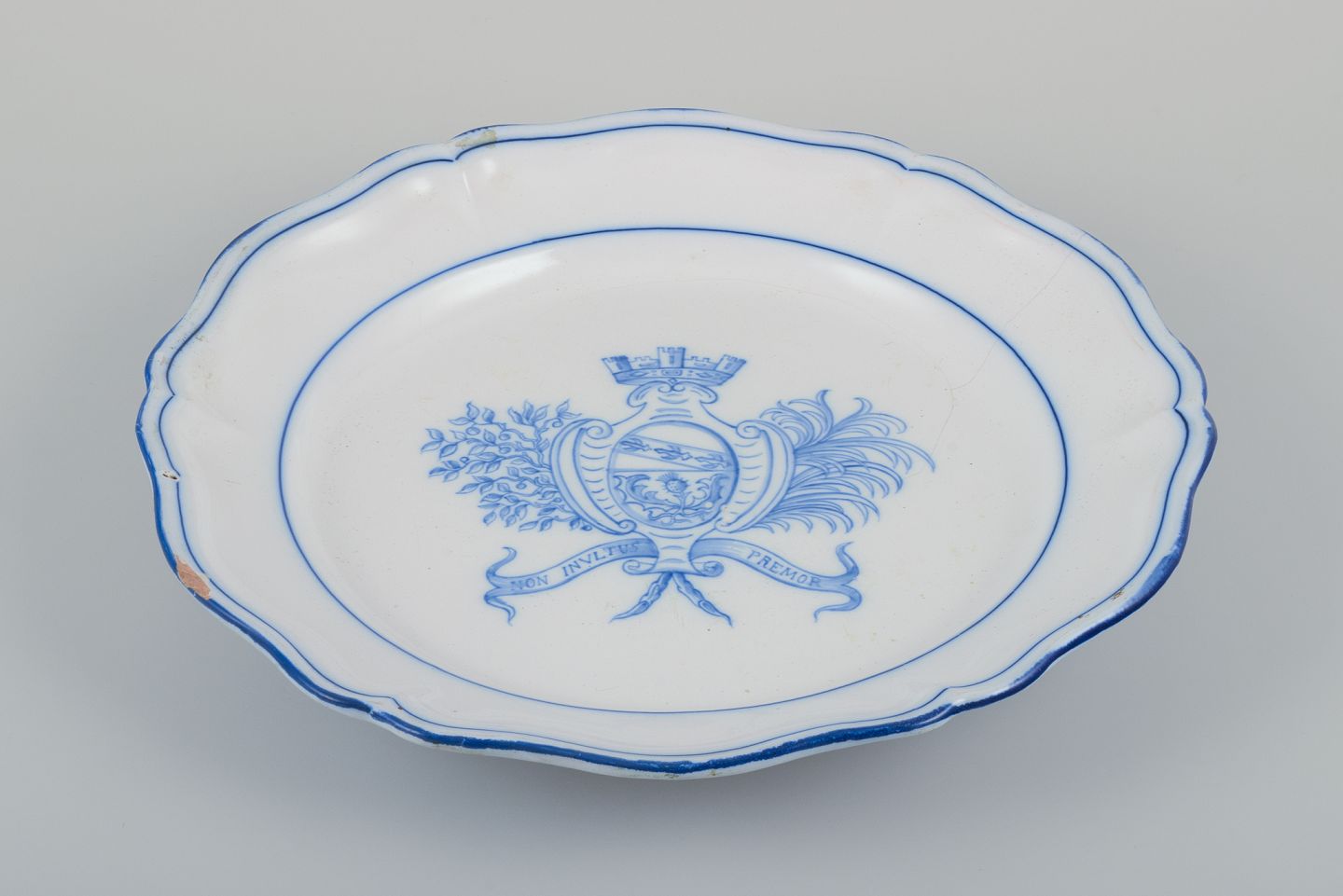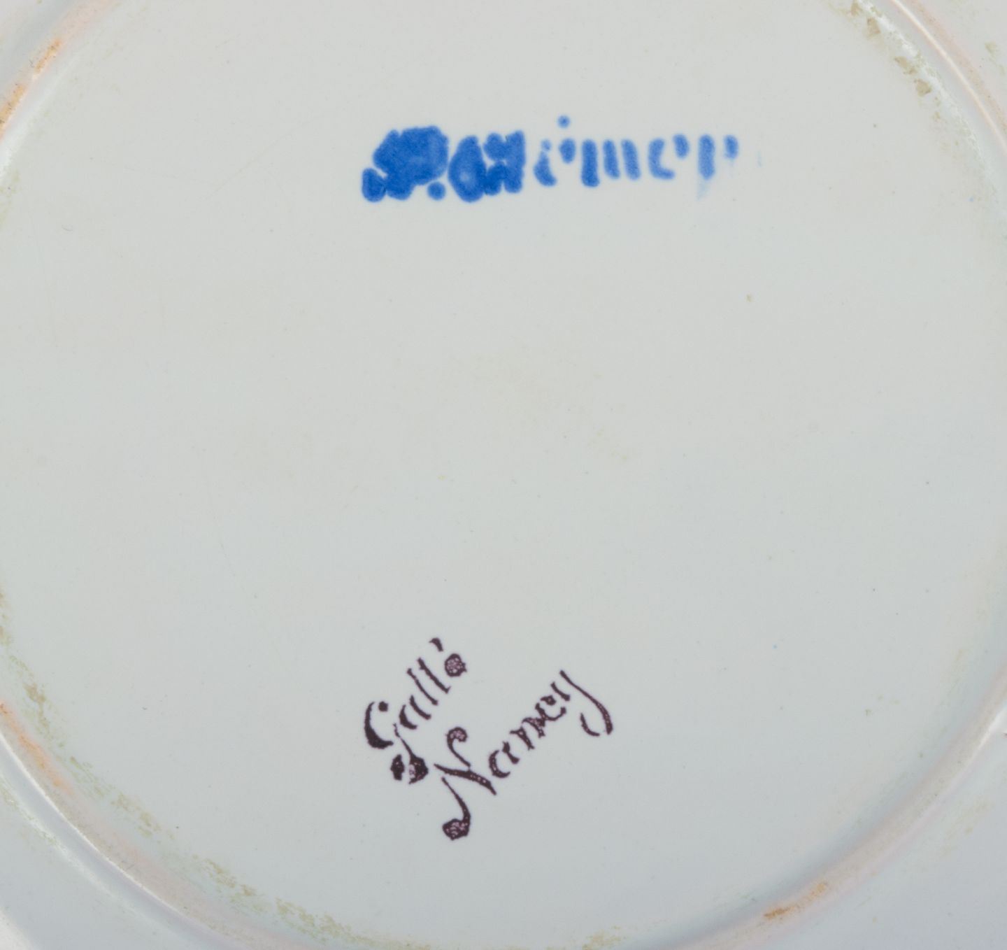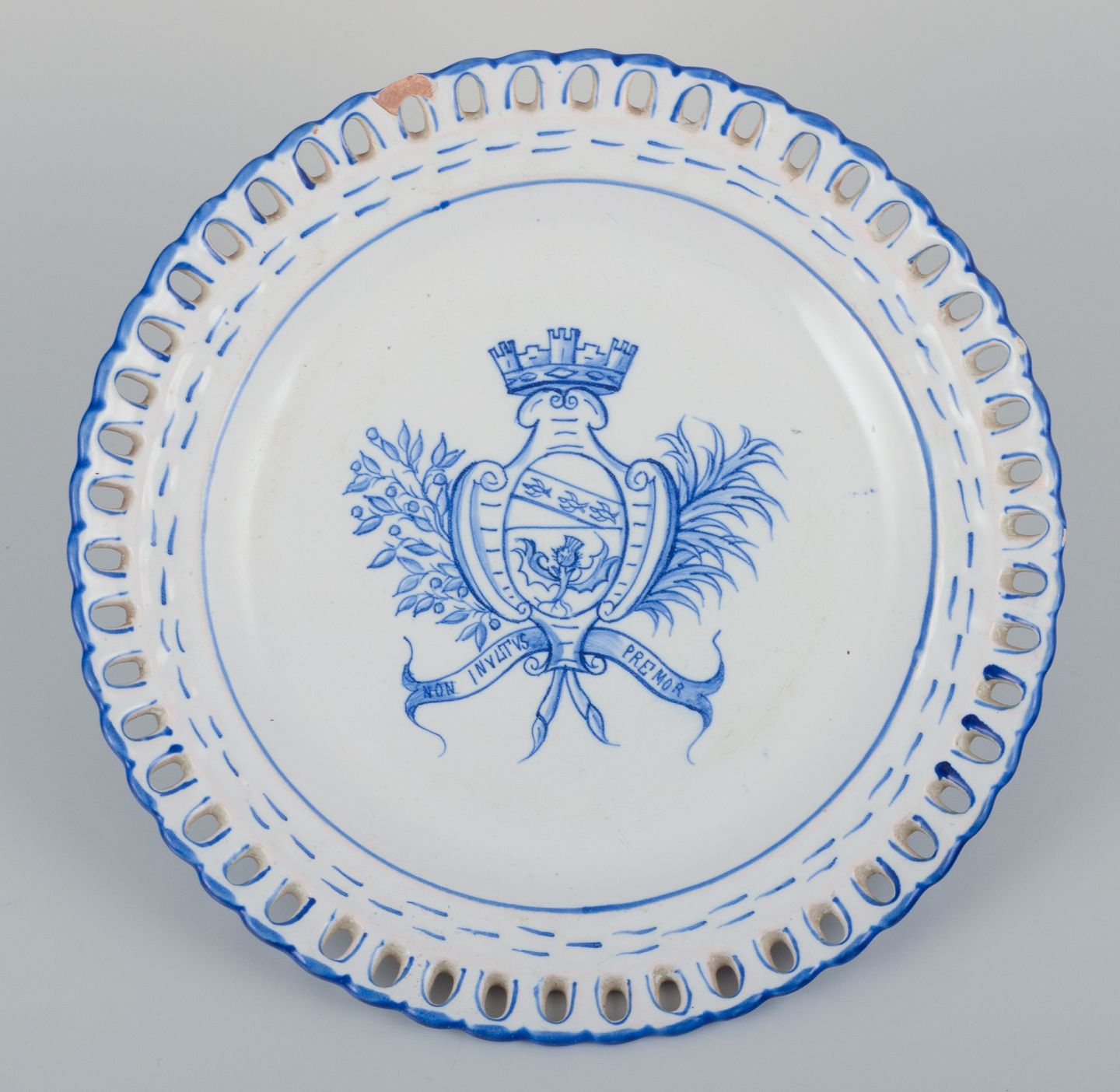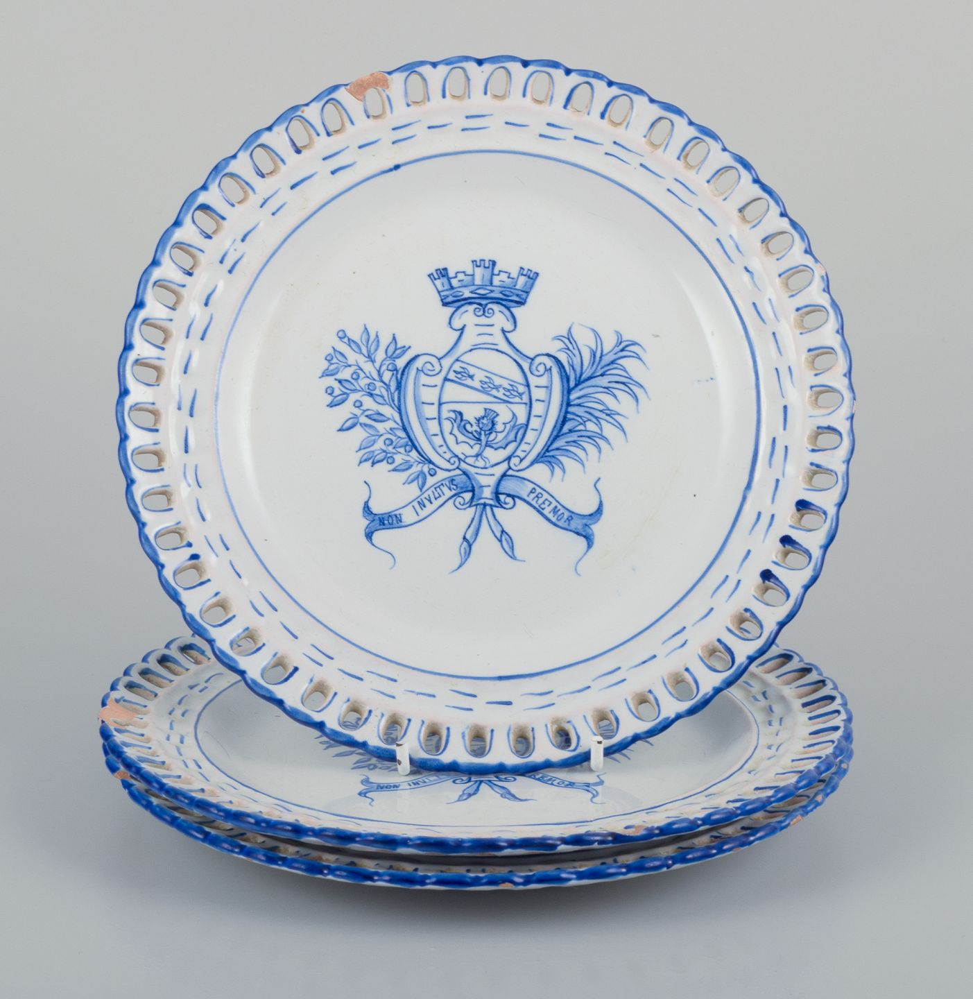 Emile Gallé for St. Clement, Nancy. Stort rundt serveringsfad samt tre gennembrudte tallerkner i håndmalet fajance. Dekoreret med våbenskjold.