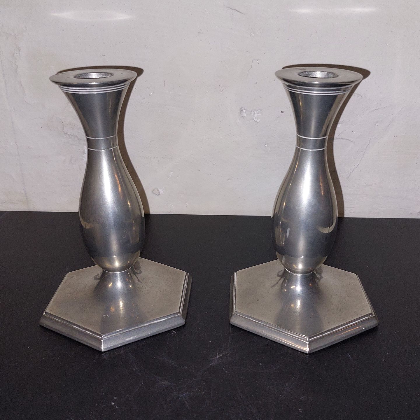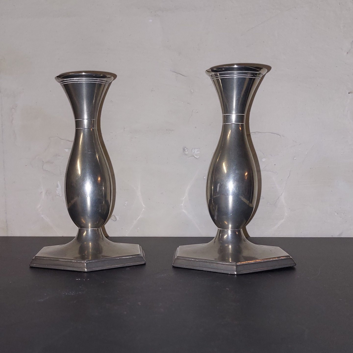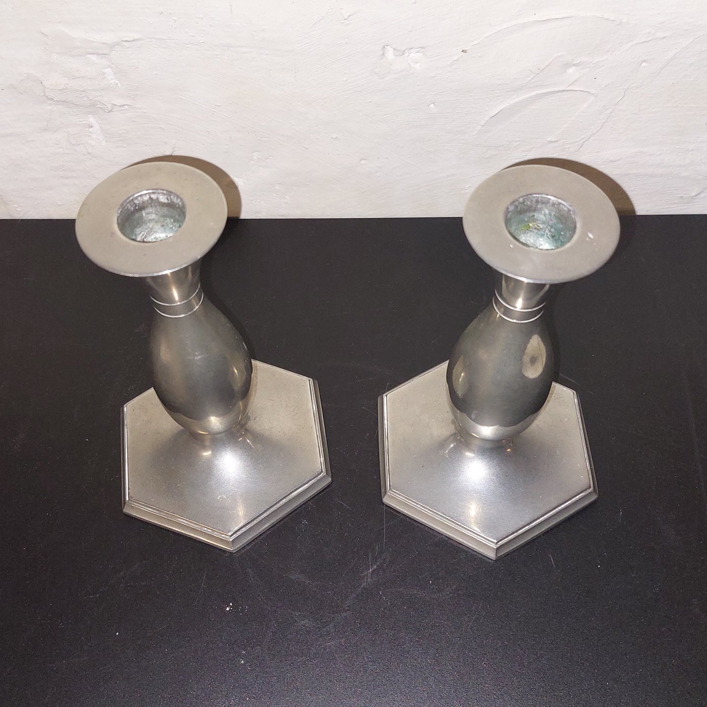 Par lysestager I tin med balusterformet pibe samt kantet fod. Fabriksmærket på bunden. I god stand uden skader eller reparationer. H. 15,5 cm