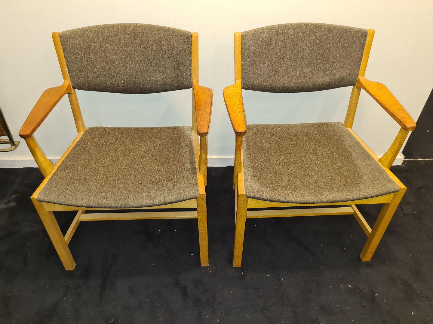 2 Armstole i eg med armlæn i teak og uldbetrukket ryg og sæde. Fremstår og pæne og velholdte dog med lettere brugsspor på betrækket,