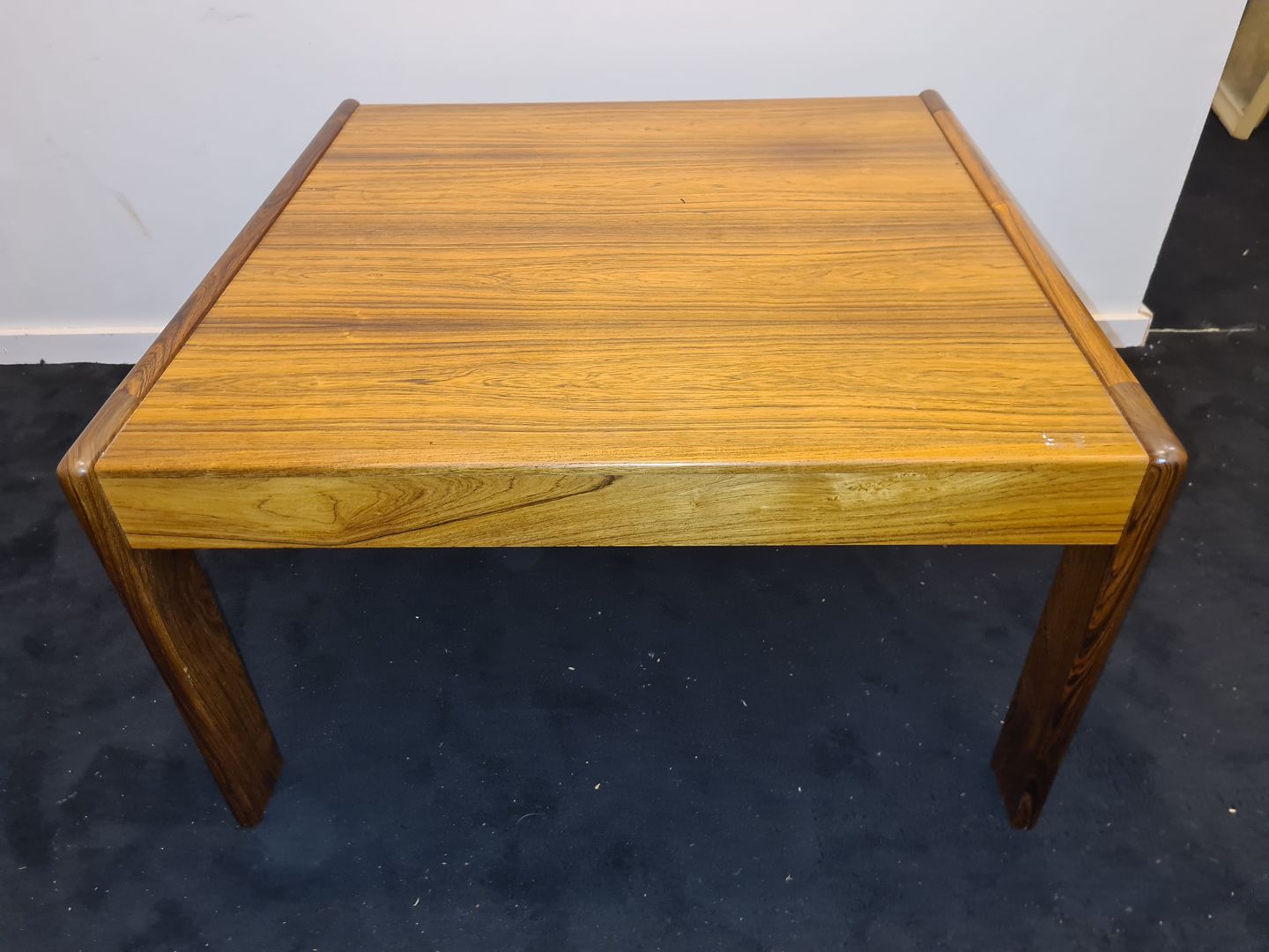 Kvadratisk sofabord fra 1970´erne i palisander. Fremstår pænt og velholdt uden nævneværdige brugsspor.