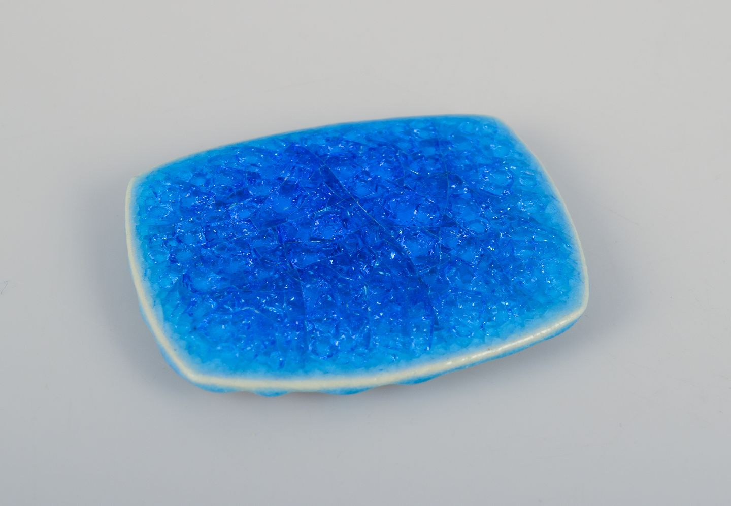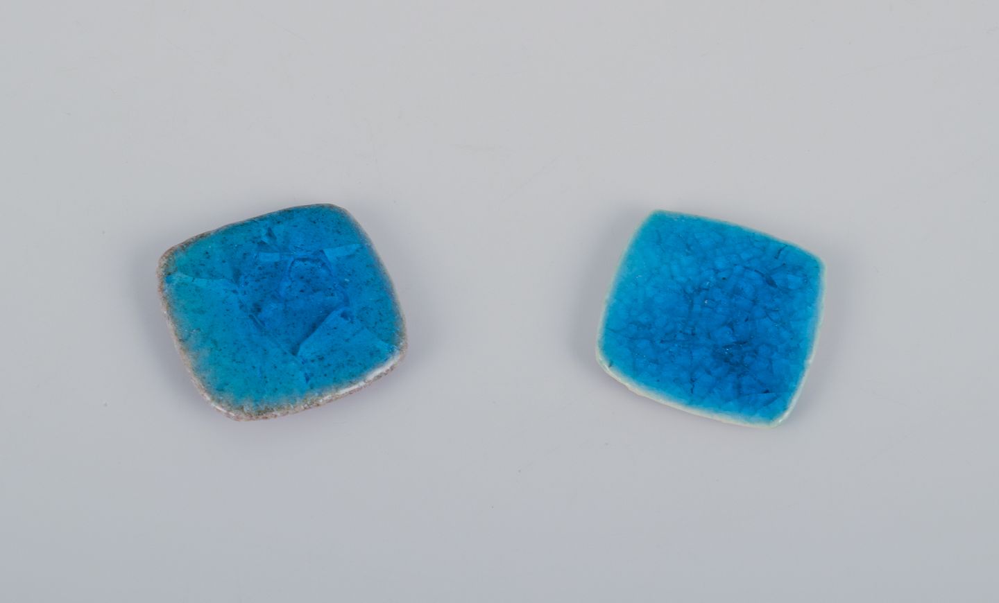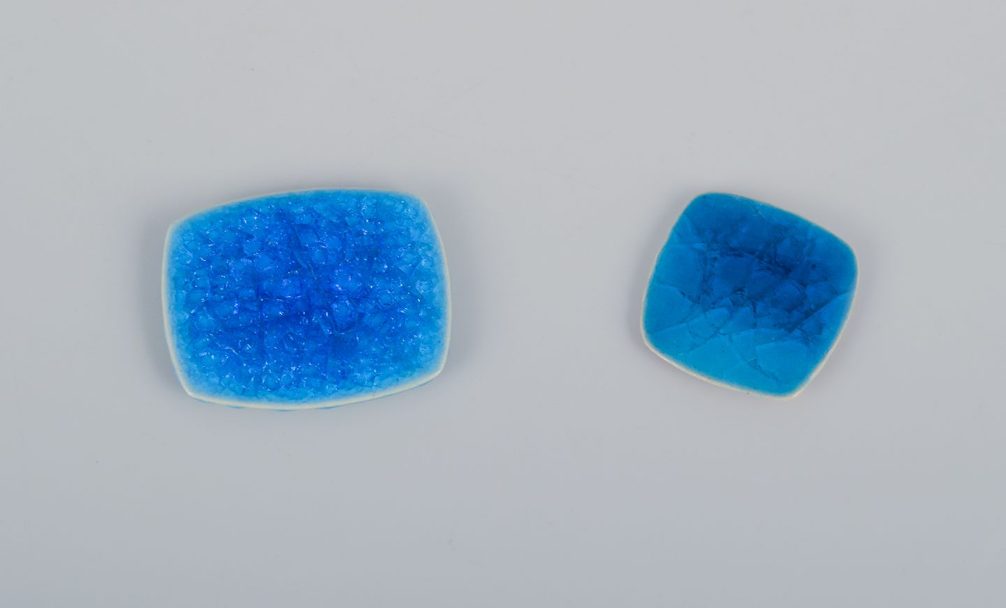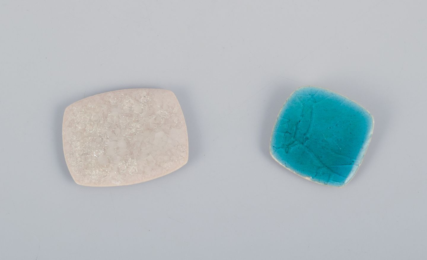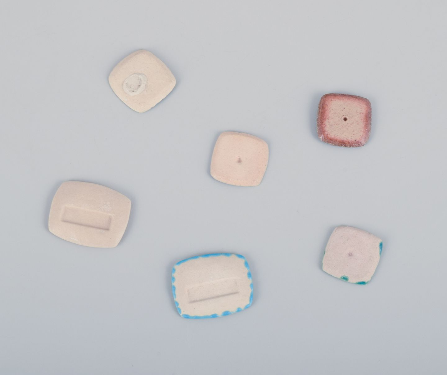 Seks unika brocher i glaseret stentøj i blå og hvide nuancer.