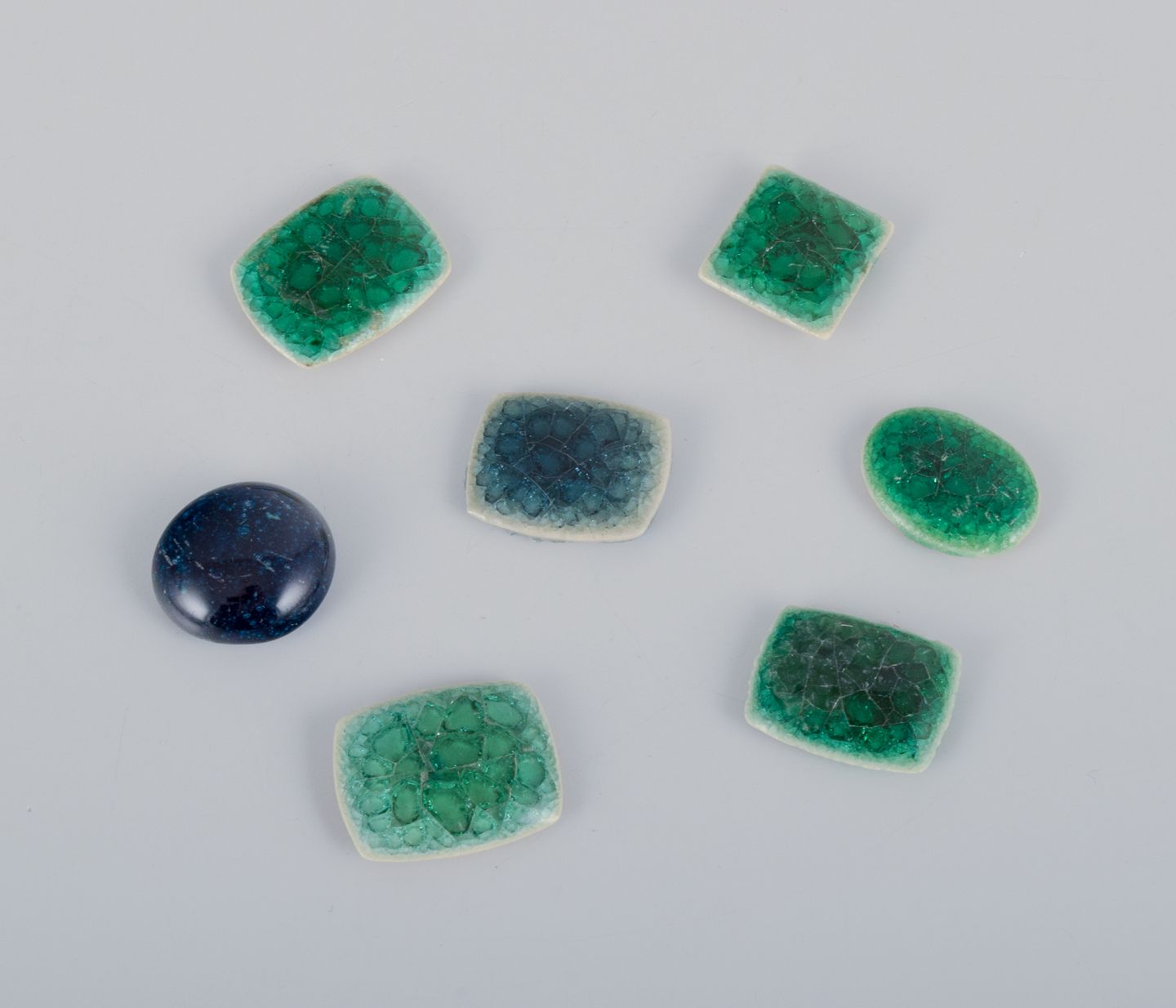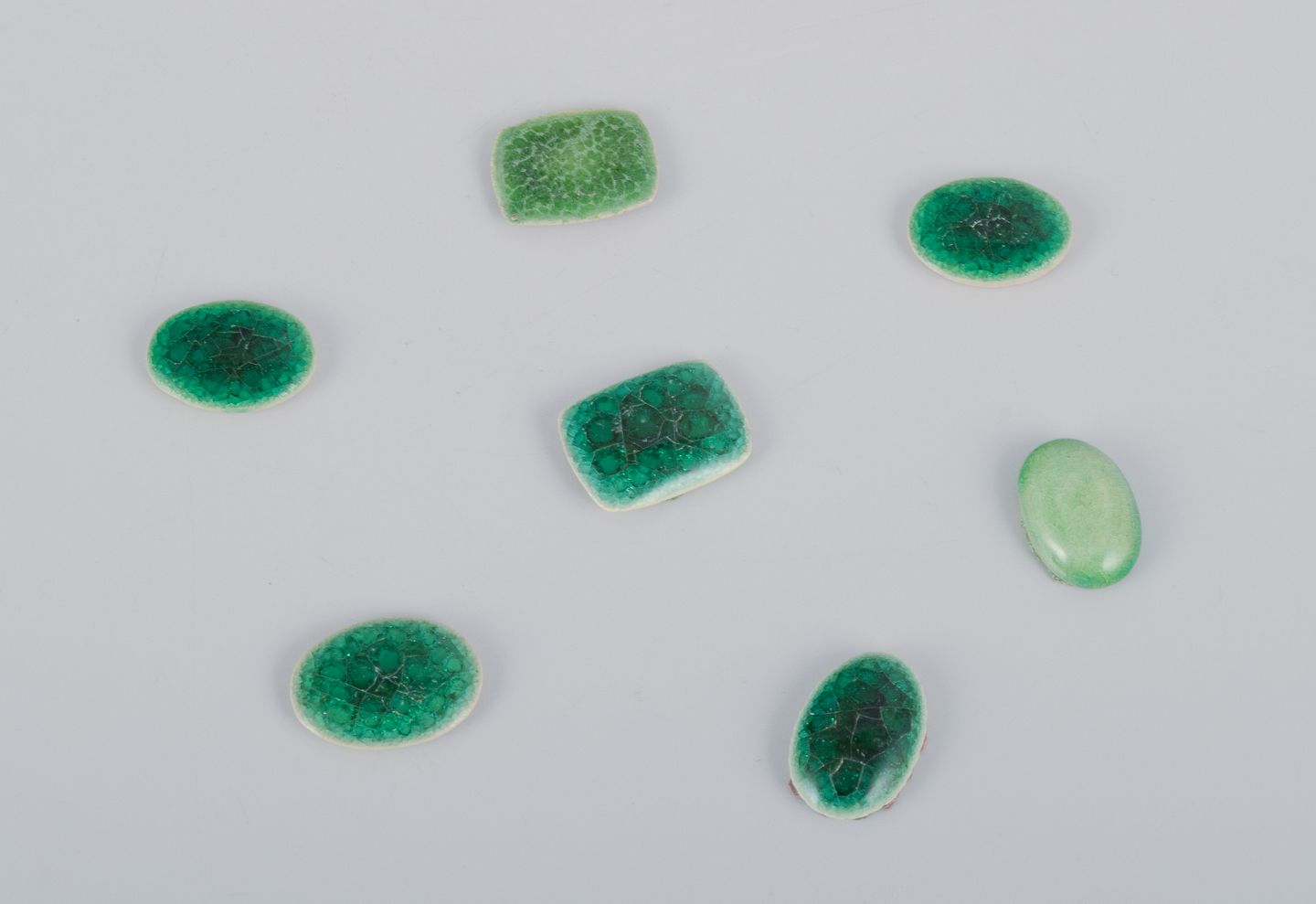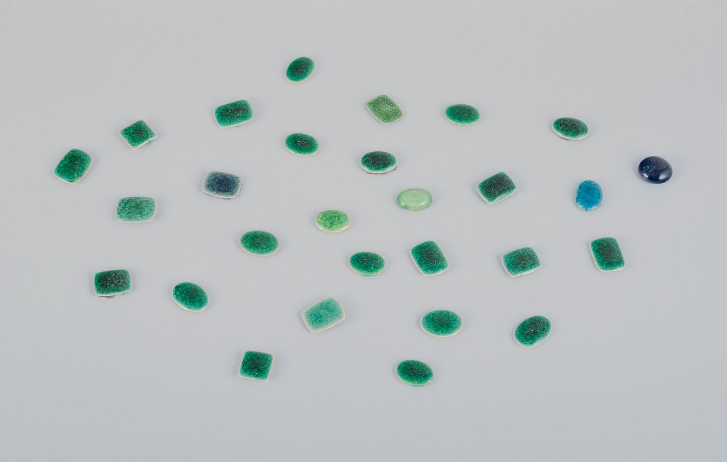 28 unika brocher i glaseret stentøj i grønne nuancer.