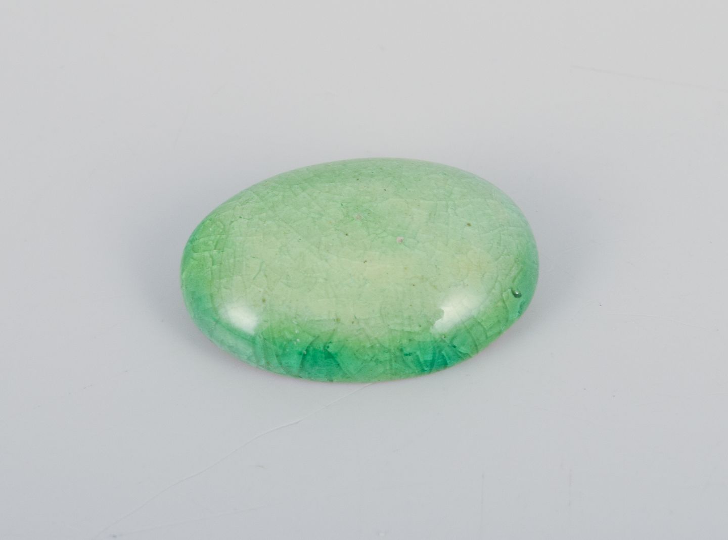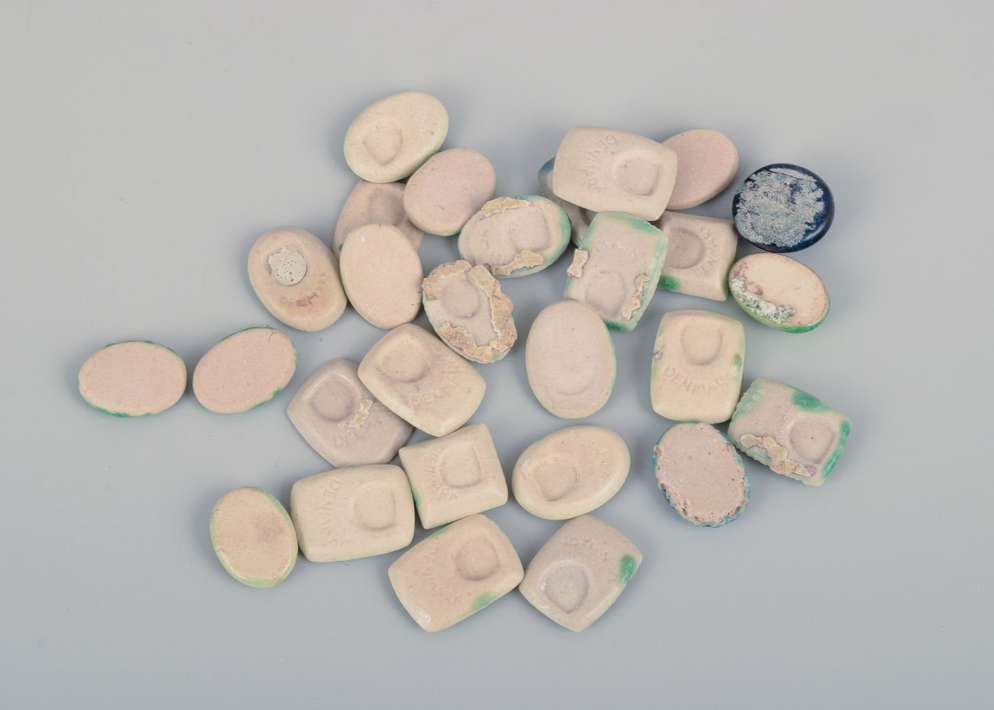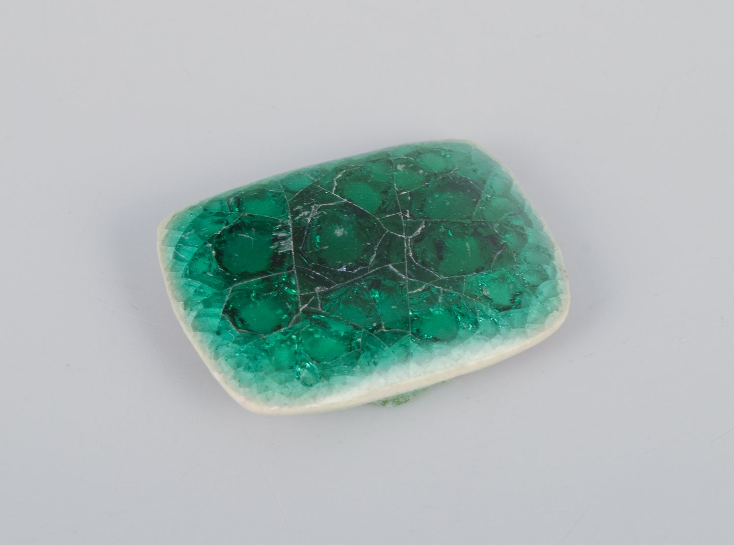 28 unika brocher i glaseret stentøj i grønne nuancer.