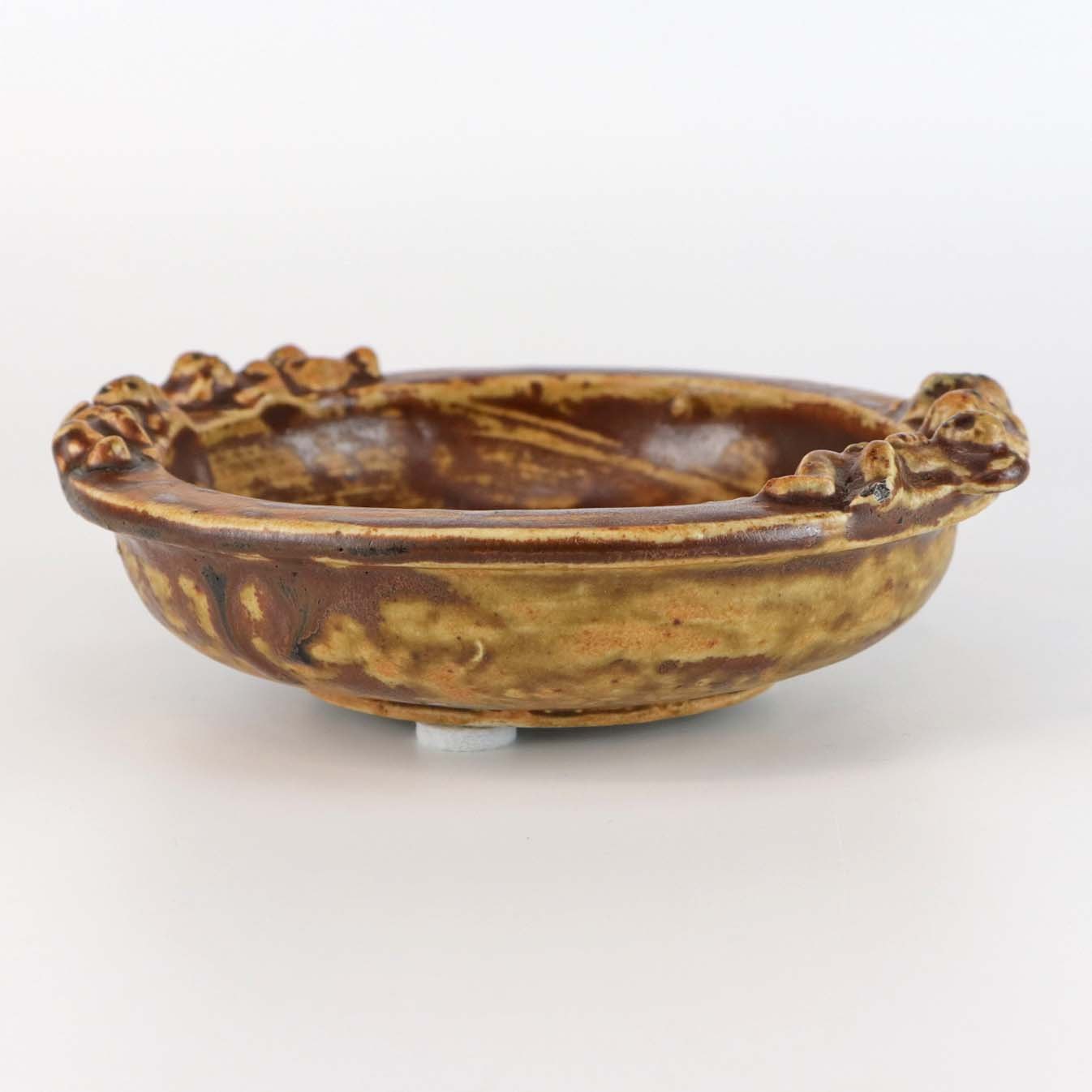 Lav skål af stentøj. Kanten er dekoreret med figurer af liggende mennesker