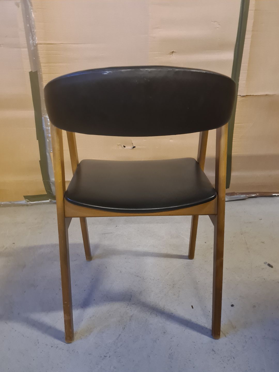 Armstol i massivt bøgetræ med kunstlæder betræk, fra 1960erne.