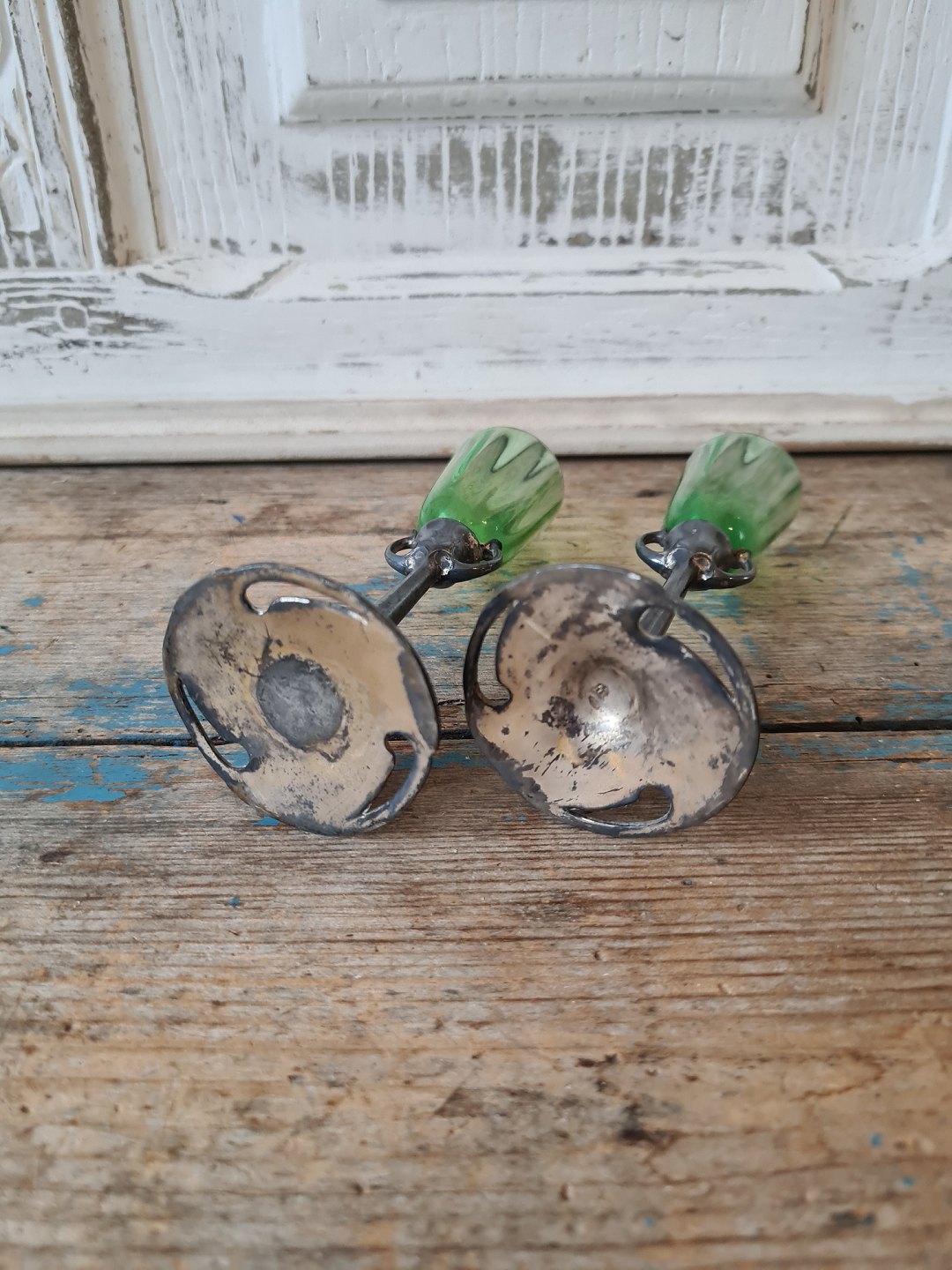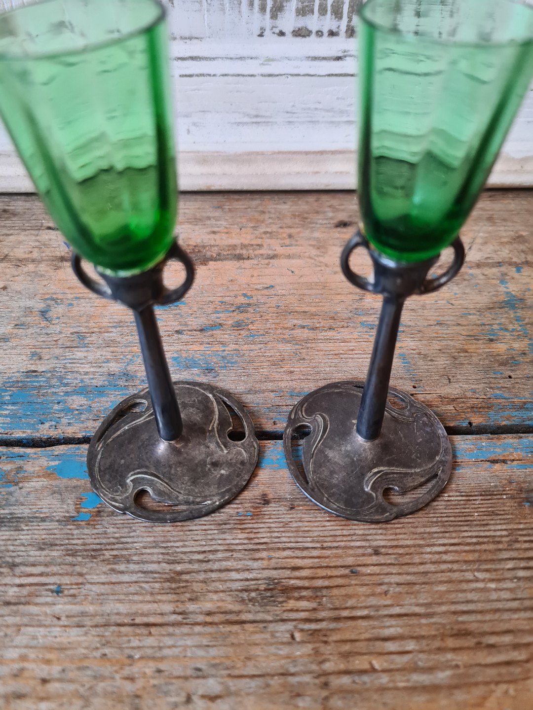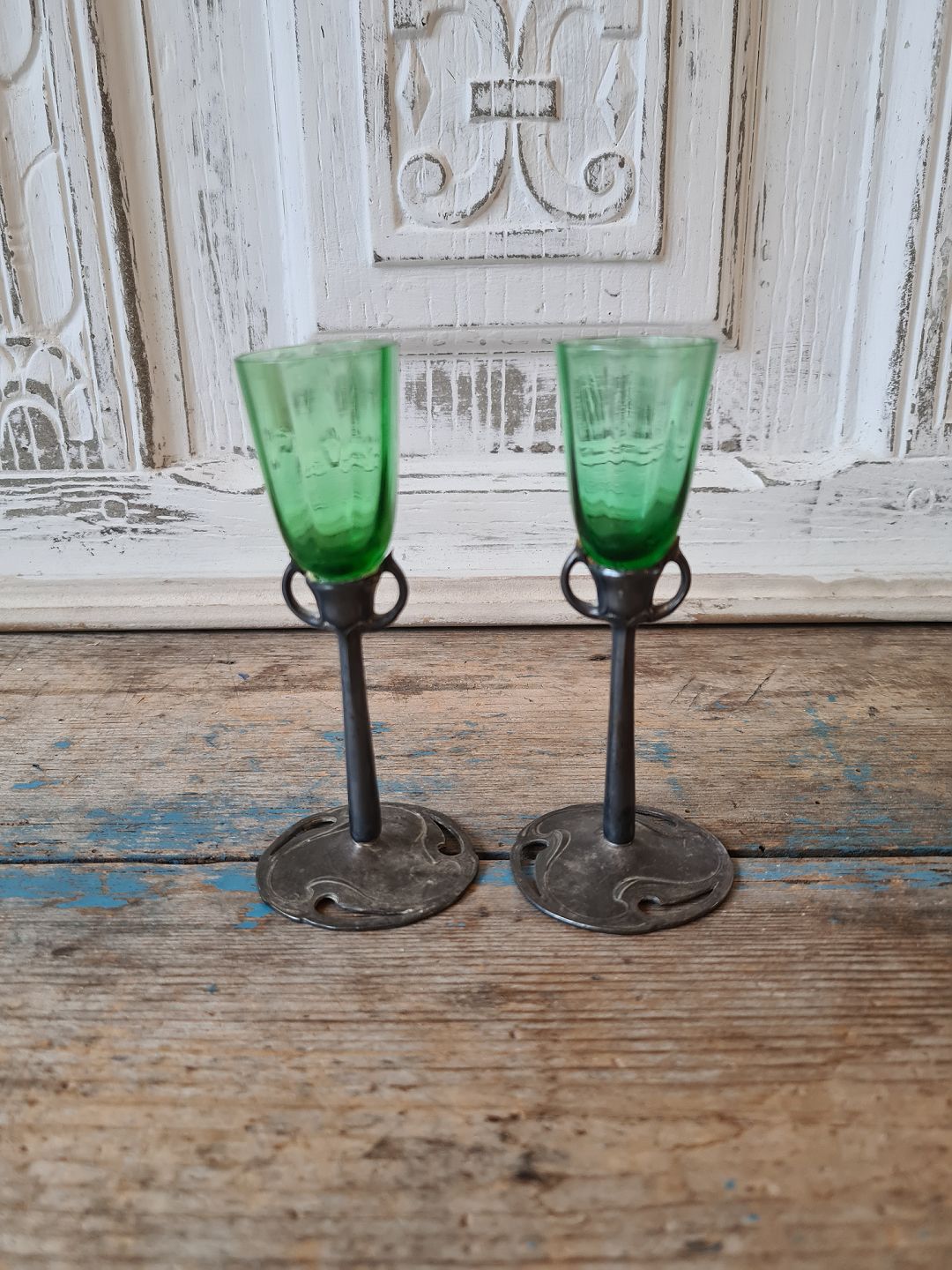 Pair of Art Nouveau shot glasses. The cup is made of ground green glass mounted on a pewter foot
