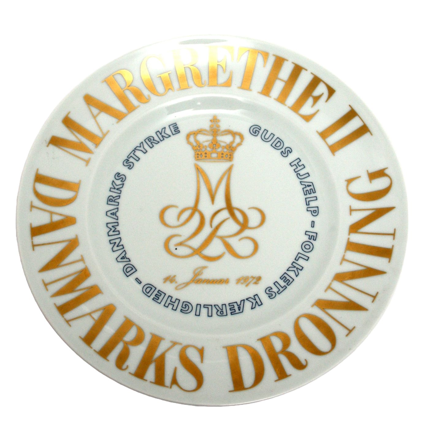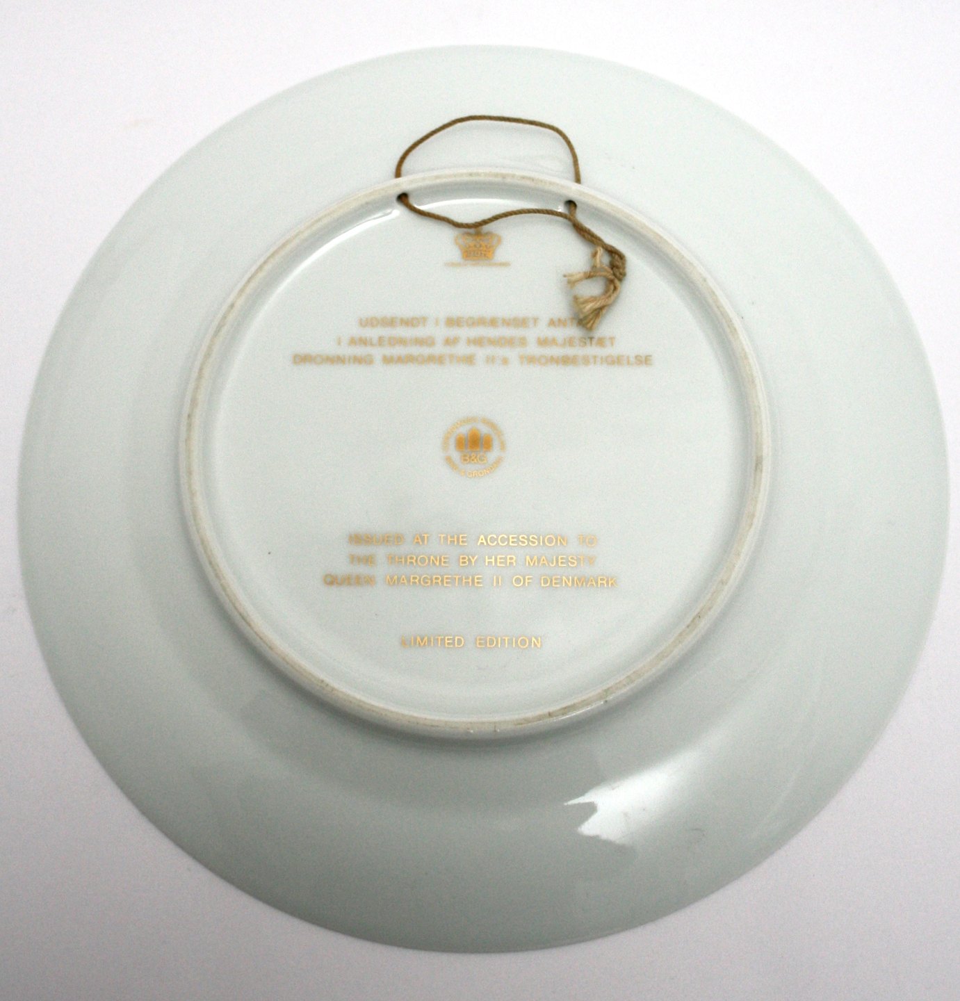 Text available in Danish: Bing & Grøndahl, Dronning Margrethes tronbestigelse 14. januar 1972. Monogram: M2R og Dronningens slagord: Guds hjælp - Folkets kærlighed - Danmarks styrke. Limited edition. Diameter 24 cm. Pris: 200 kr. stk. Lager: 4