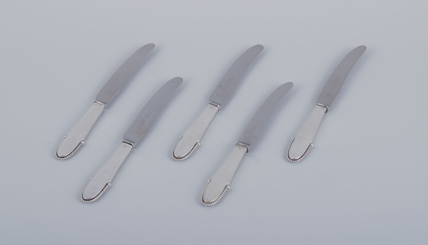 Georg Jensen Kugle, fem frugtknive i sterlingsølv. Knivblad i rustfrit stål.