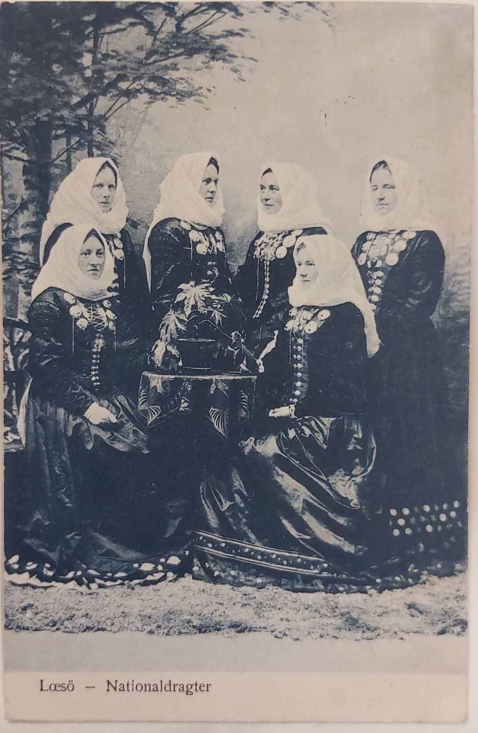 Postkort: Seks kvinder i Læsø.Nationaldragter. Annulleret med Stjernestempel VESTERØ. Julemærke 1910 ligeledes stemplet med VESTERØ stjernestempel. I god stand