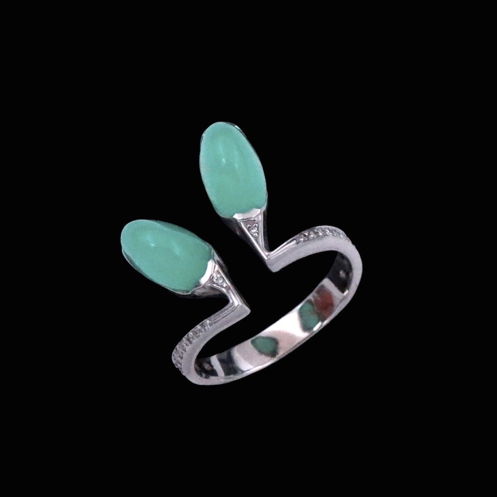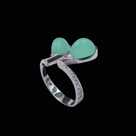 Text zugänglich auf Dänische: Boy Johansen. Ring i 18k hvidguld med Chrysopras og brillanter.
